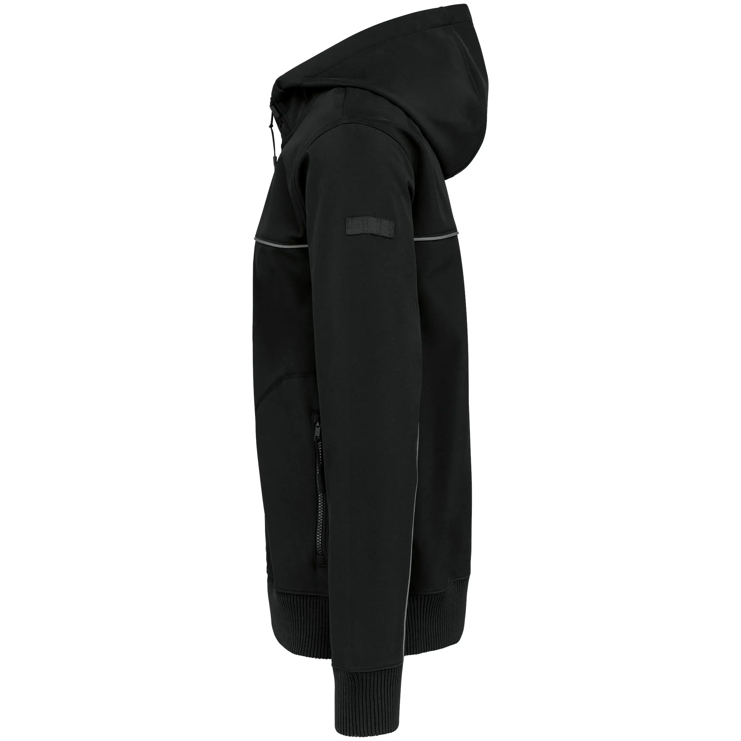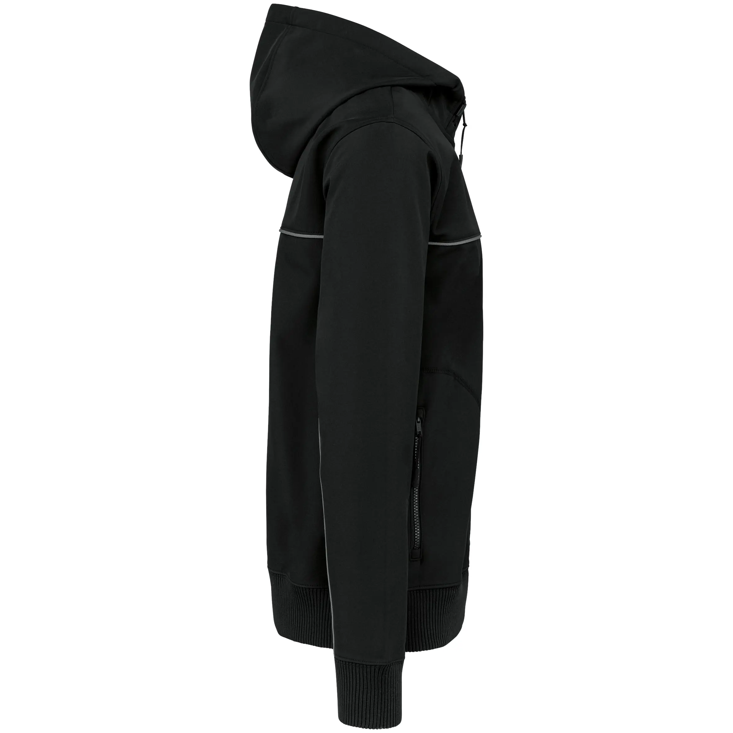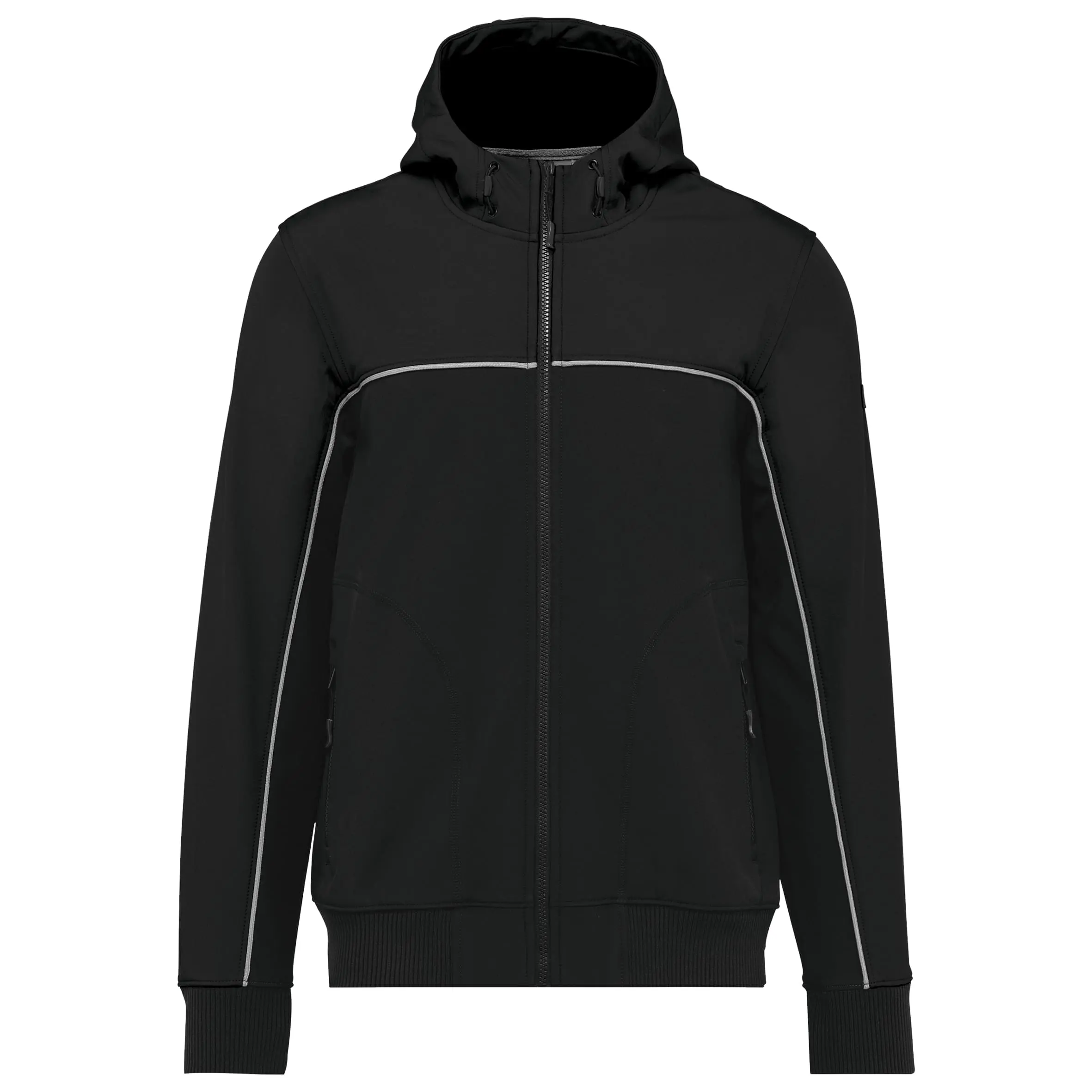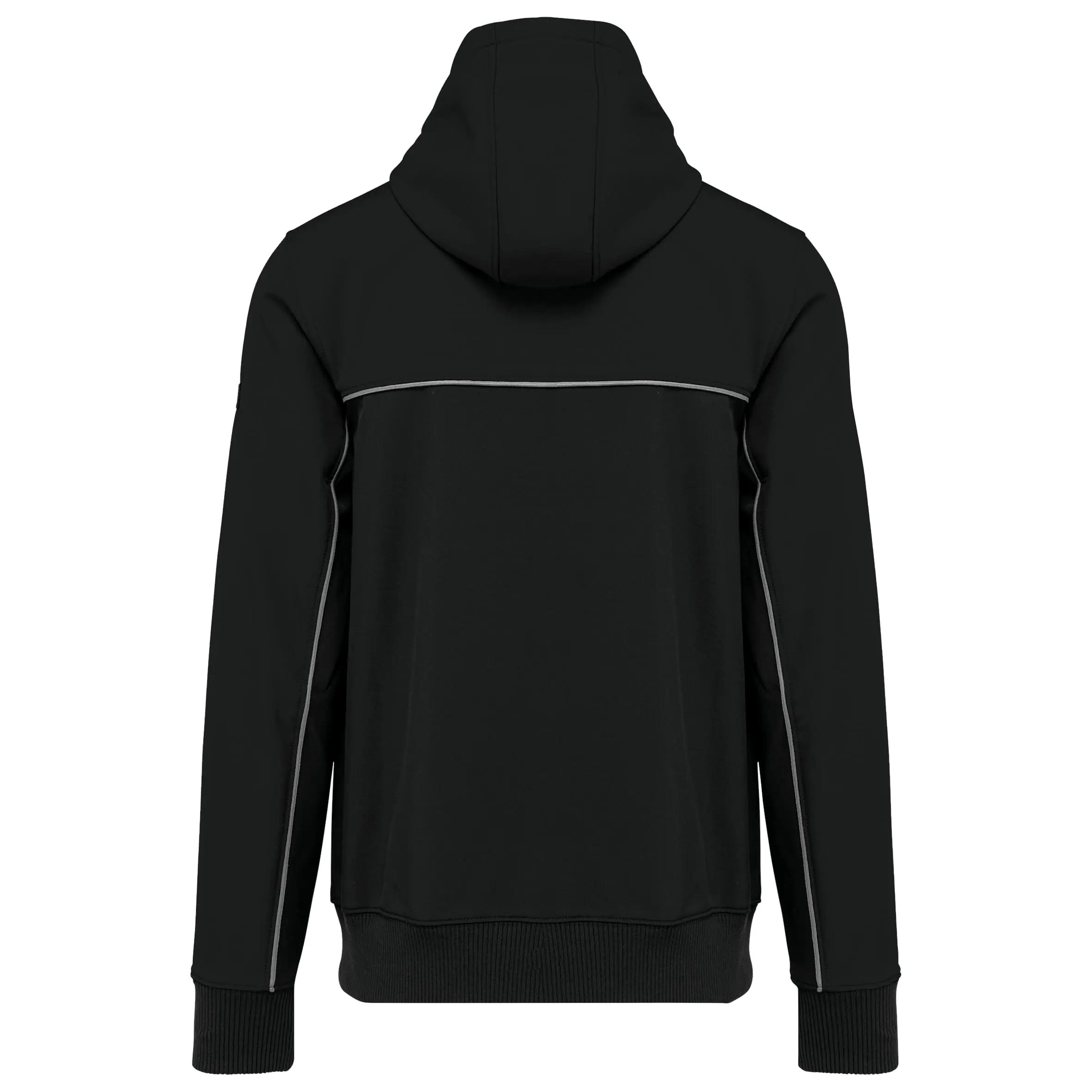 96% polyester / 4% elasthan. 3-laagse ademende stof 3000 g/m²/24 u en waterdicht 5000 mm. Buitenkant: 96% polyester / 4% elasthan. Tussenlaag: ademend en waterdicht membraan. Binnenlaag: microfleece. BIONIC FINISH ® ECO behandeling (waterdicht, zonder fluor voor optimale prestaties). Plastic ritssluiting met ton-sur-ton ritstrekker. 2 ritszakken met ritstrekker aan de voorkant. 3-delige, verstelbare capuchon met stoppers in de naad. Contrasterend nektape met ophanglint in de kraag. Elastische penhouder met 3 vakken op de linkermouw. Contrasterende bies tussen de tweekleurige delen van het kledingstuk (lichaam, voorkant mouwen en rug). Gevoerde 2×2 ribboord met elasthan aan de mouwuiteinden en de boord. Tear-away merklabel.