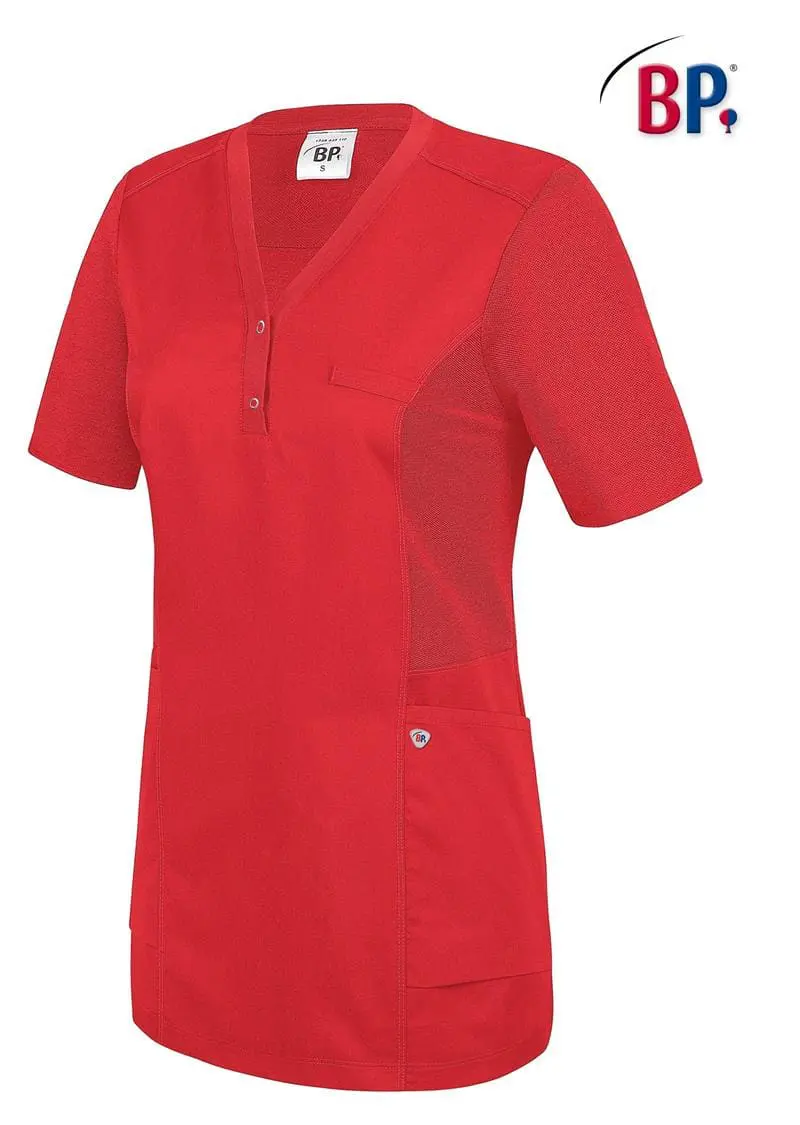1/2 mouw, maximale bewegingsvrijheid door piqué-inzetstukken, V-hals met twee drukknopen, 2 ruime zijzakken waarvan 1 met pieperzak, lus voor naambordje