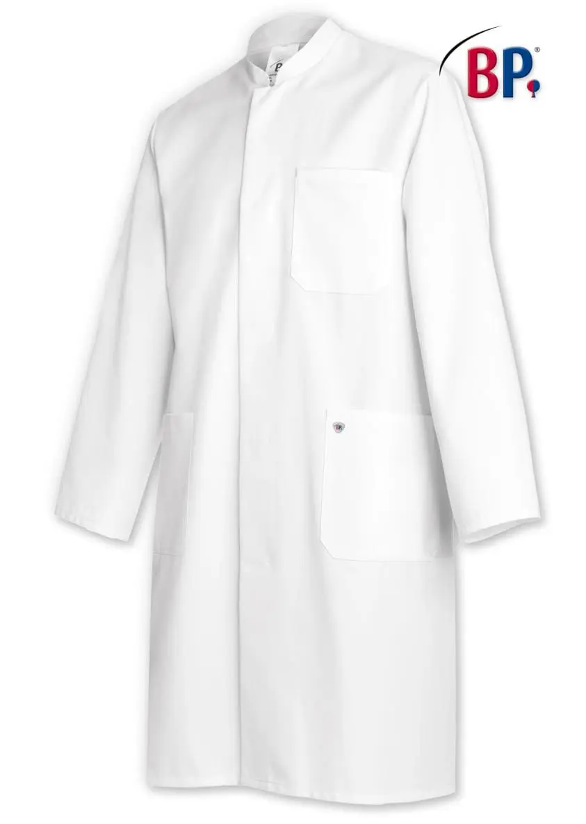 Lange mouw, opstaande kraag, blinde drukknopenlijst, 1 borstzak, 2 zijzakken, split in het rugpand, riem in het rugpand