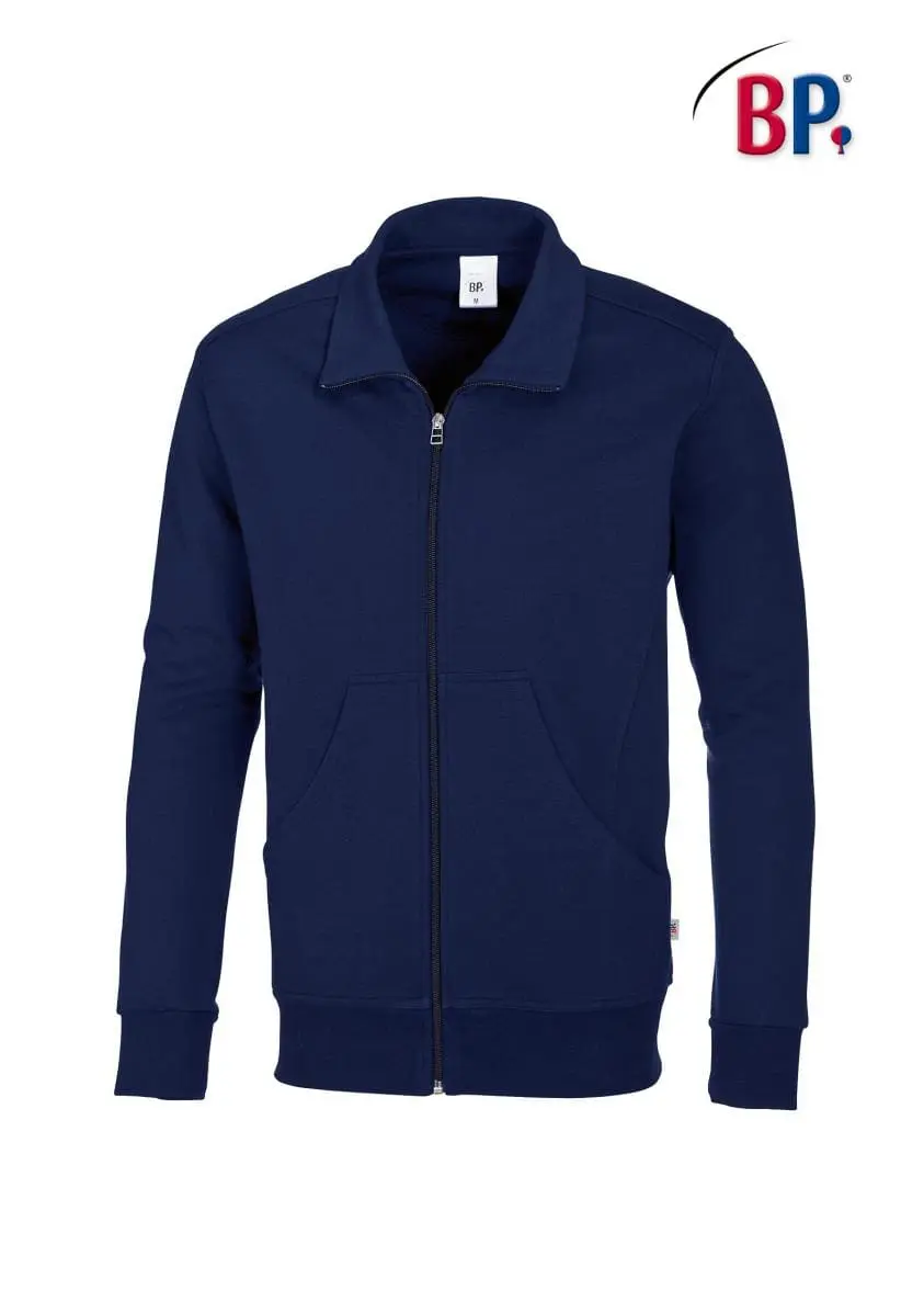 Lange mouw, hoge kraag, rits, kangoeroezakken, boordjes aan mouwen en zoom, lengte 70 cm