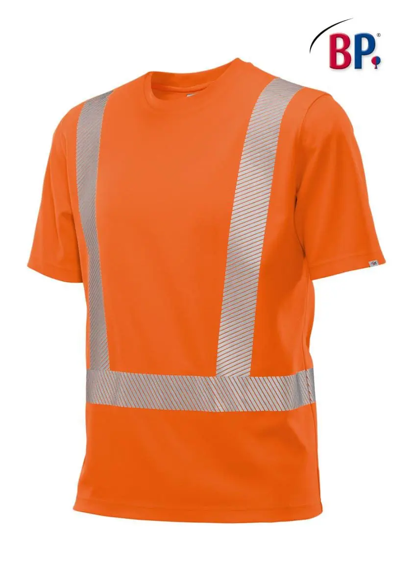 Ronde hals, 1/2 mouw, 1 doorlopende reflecterende streep met heat transfer boven de zoom aangebracht, 2 doorlopende verticale reflecterende strepen op voor- en rugpand opgedrukt, stretch reflecterende strepen