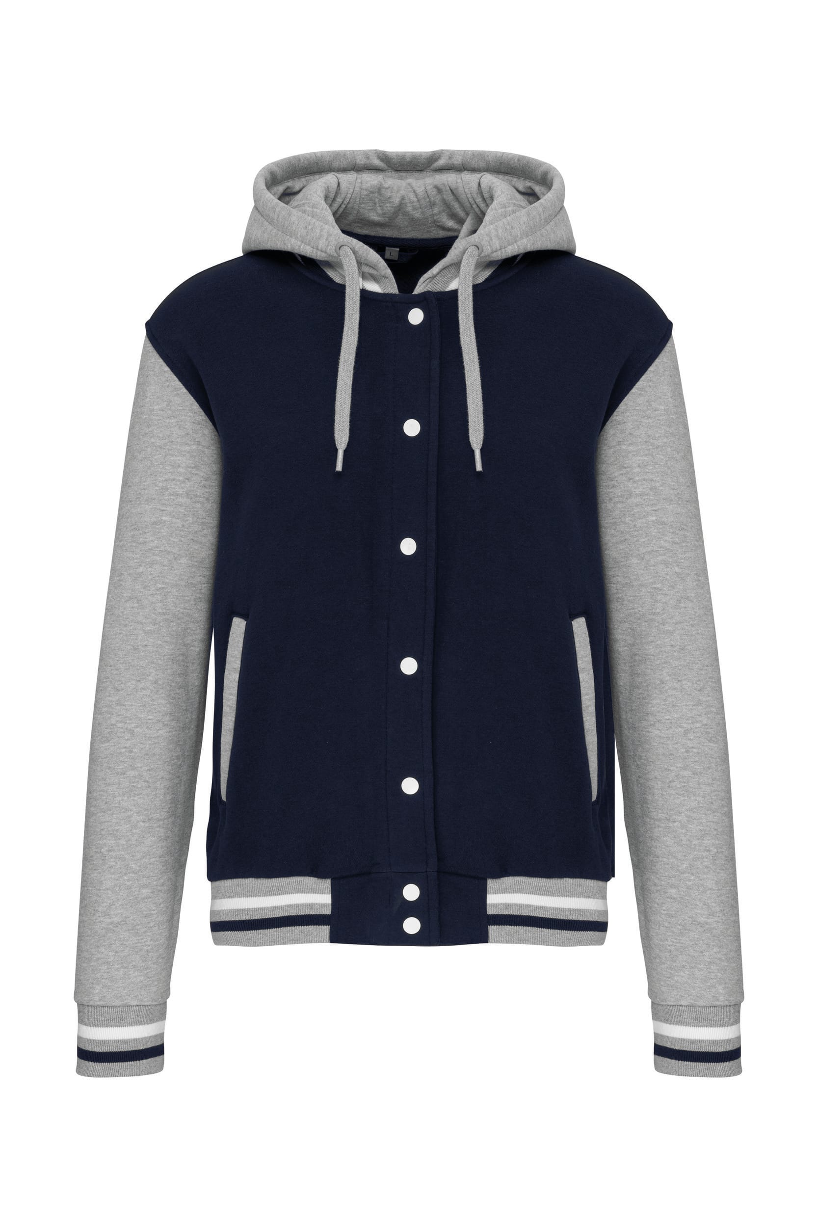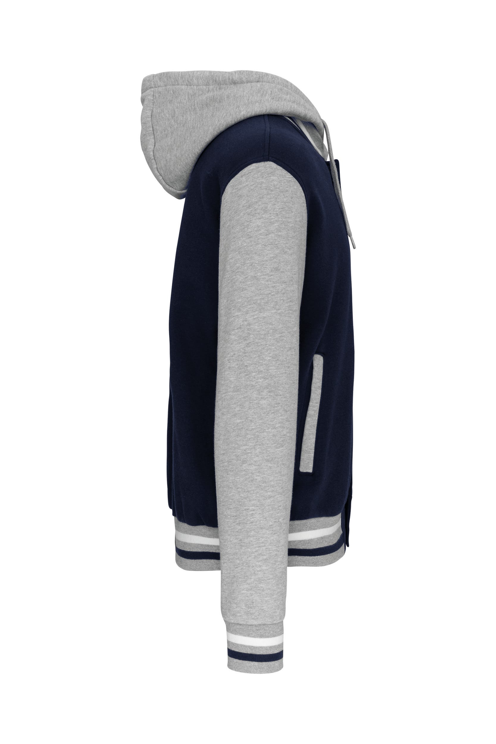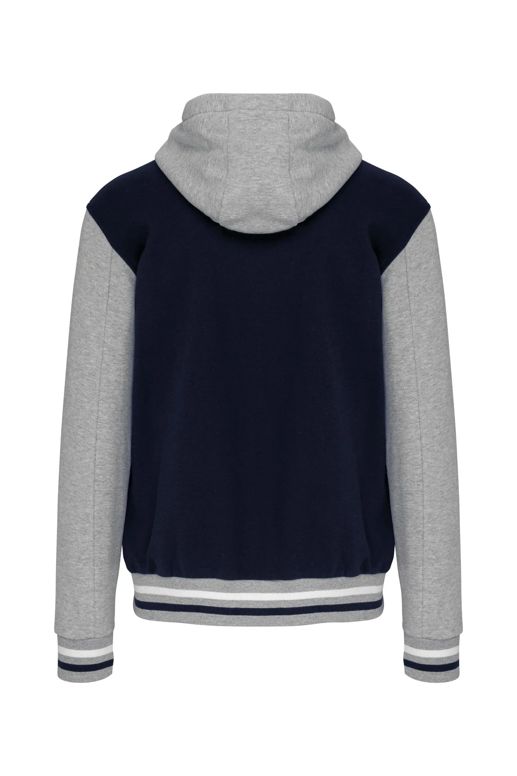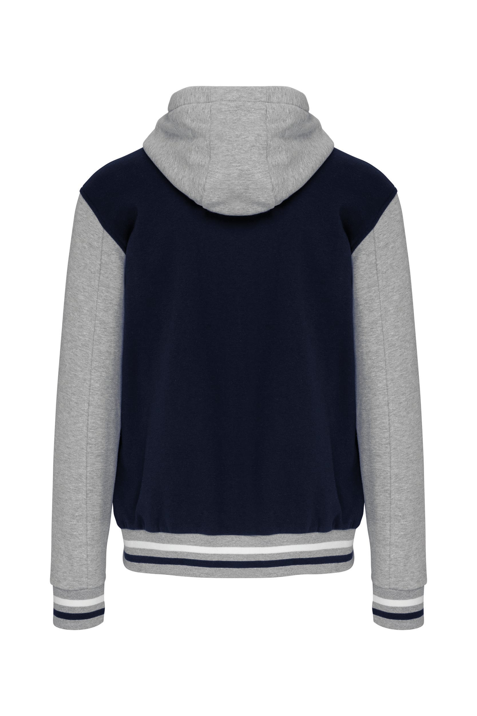 70% katoen / 30% polyester. Geborsteld fleece 3 draden. Contrasterende ingezette mouwen. Driedelige capuchon, voering in jersey en contrasterende koordjes. Sluit aan de voorkant met drukknopen. Ribboord met 2 contrasterende biesjes aan kraag, mouwen en onderkant. 2 omzoomde zakken aan de voorkant. Nektape met visgraatmotief en ophanglus in de kraag. Geen merklabel in de kraag, maar enkel een maatlabel voor eenvoudige personalisatie. De legendarische College jacket gaat al vele jaren mee. Hij is alomtegenwoordig: van de straat tot de schoolbanken en zelfs het podium. Gecertificeerd STANDARD 100 by OEKO-TEX®N° CQ1007/7, IFTH.