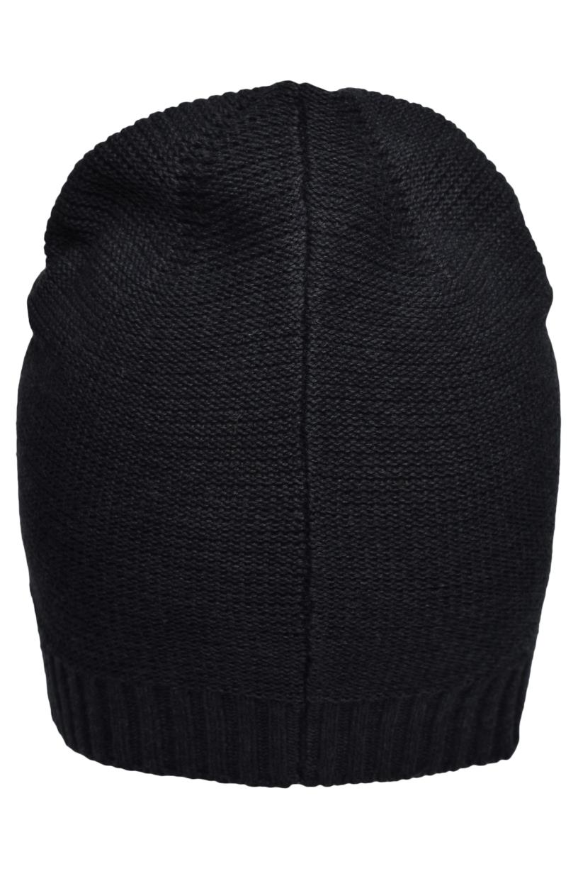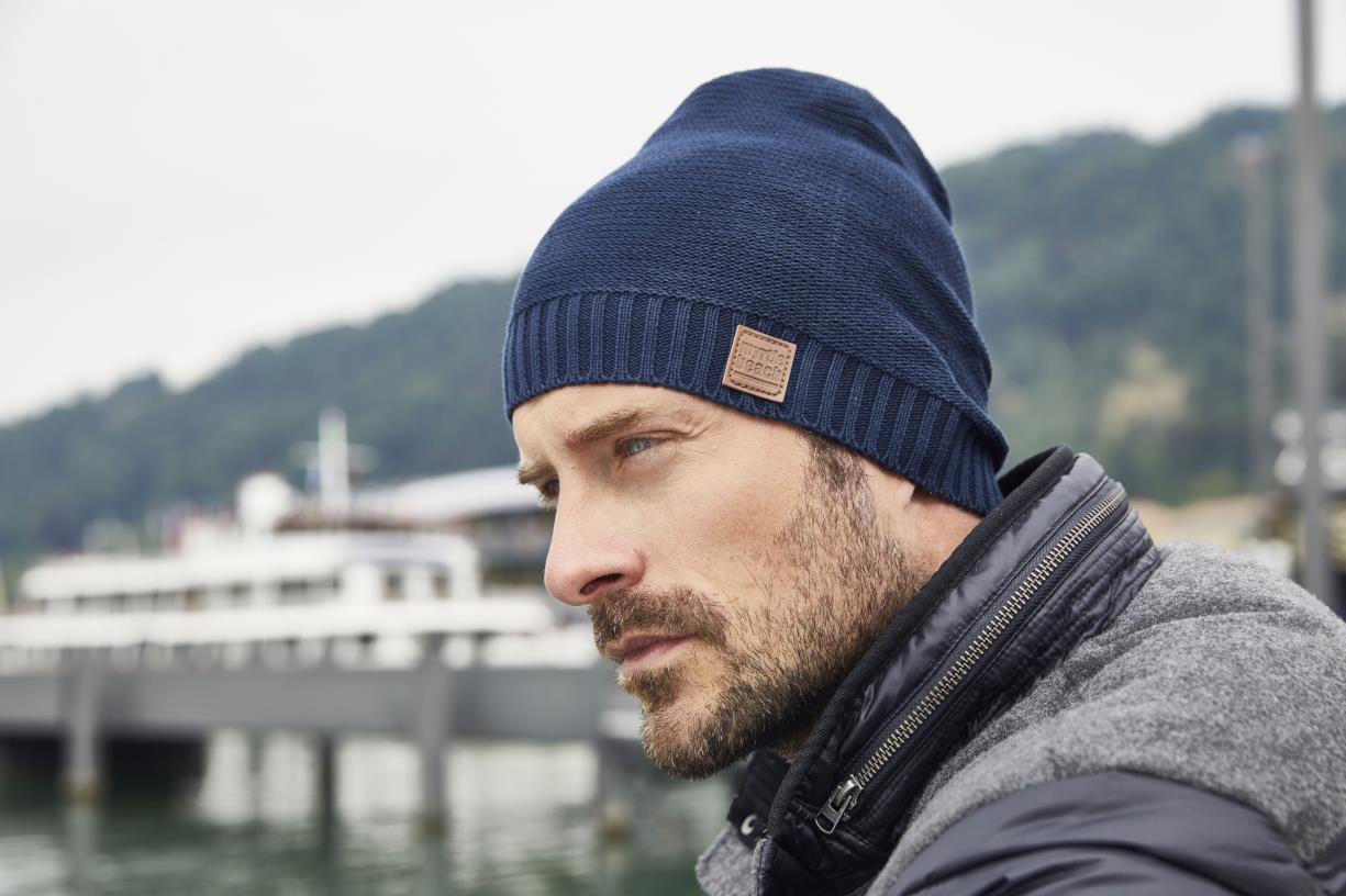 Moderne gebreide muts van katoen– Boord met modieus ribpatroon– Kunstlederen label op de rand