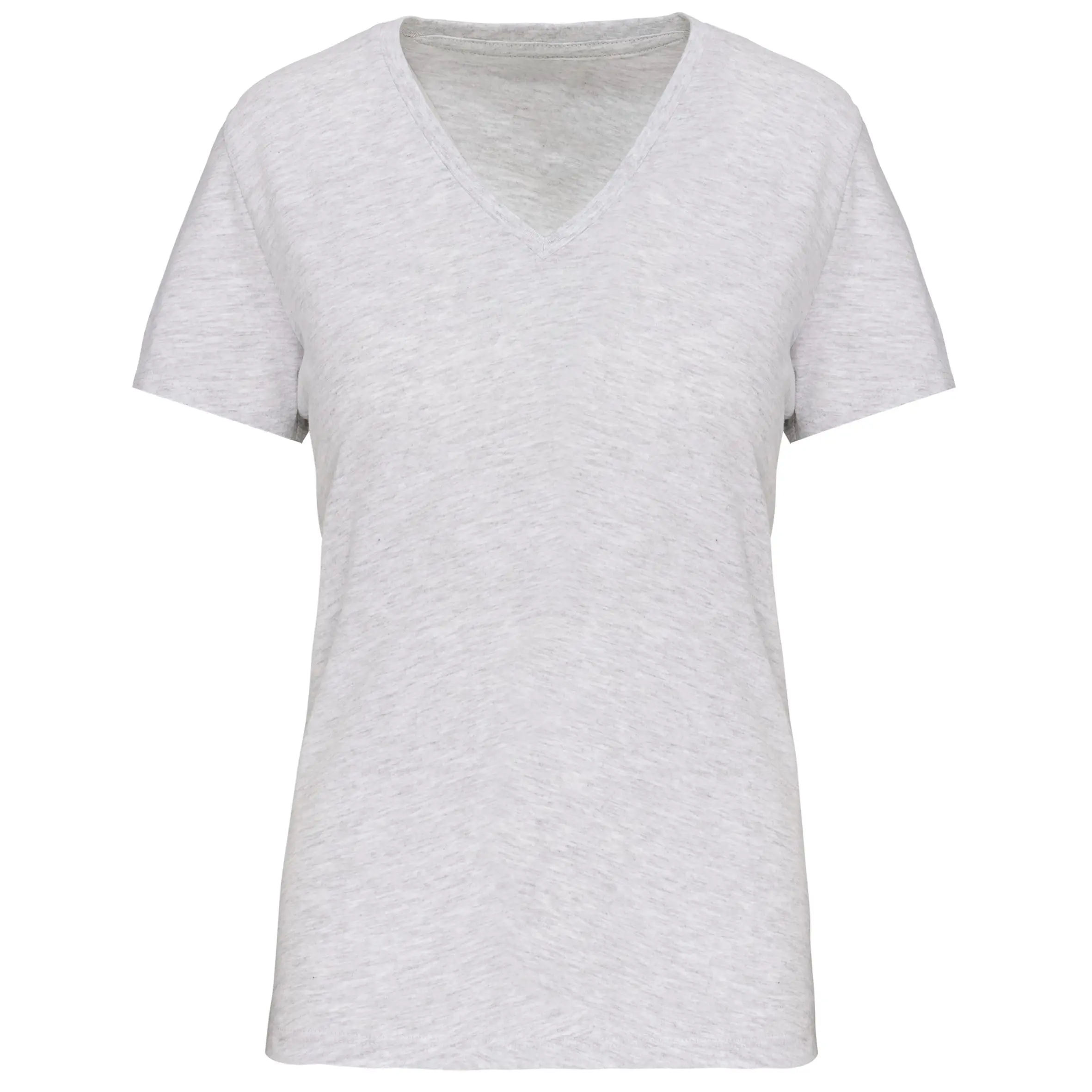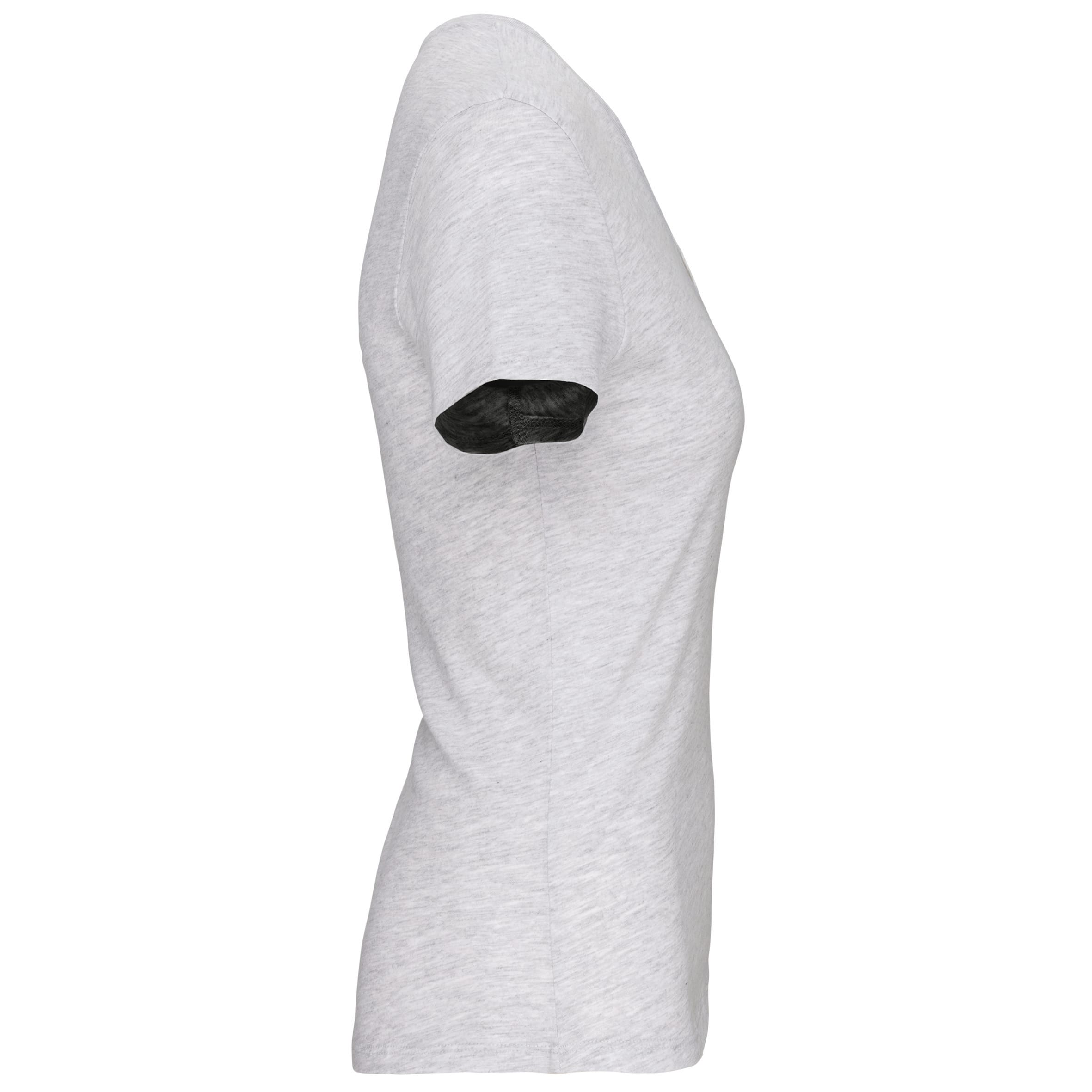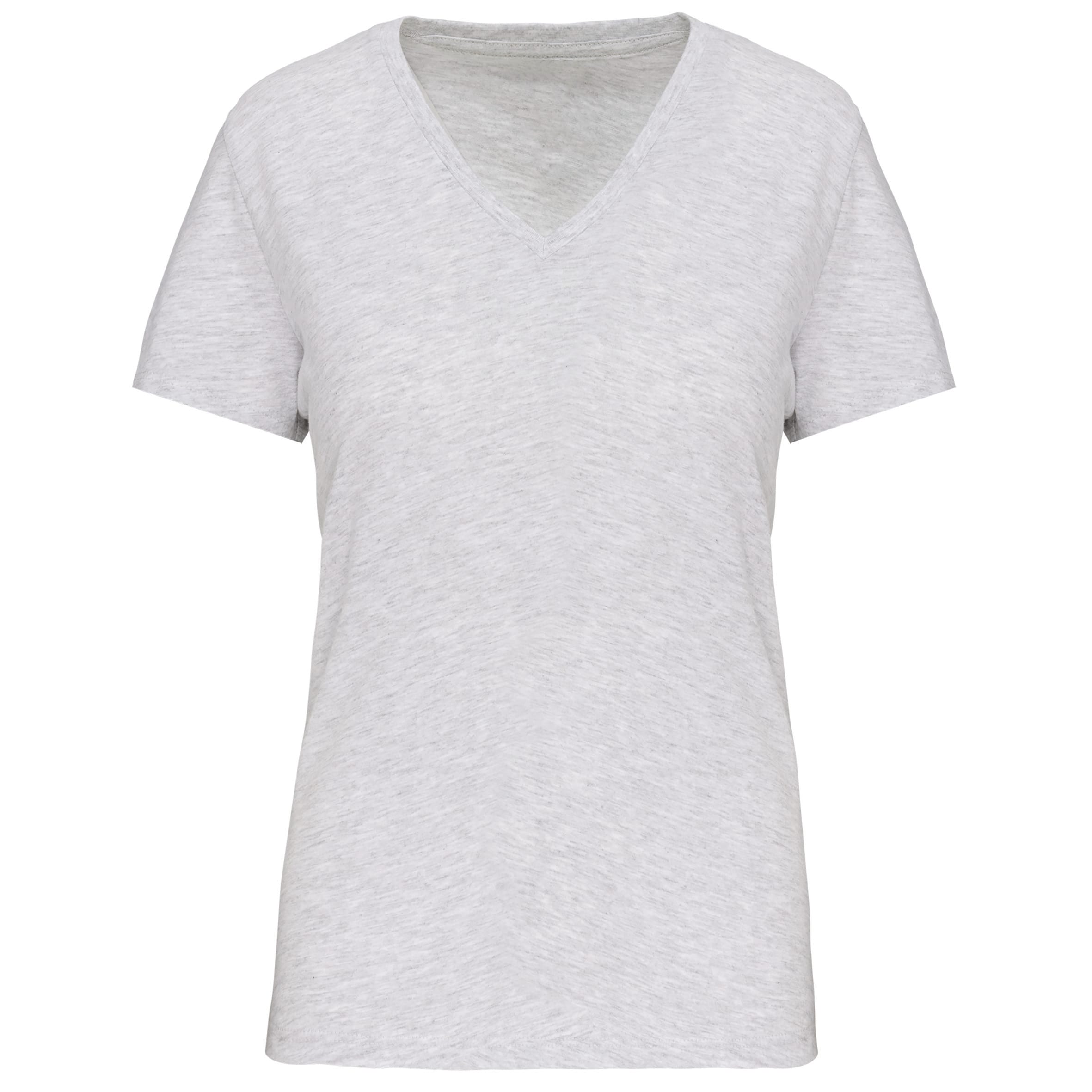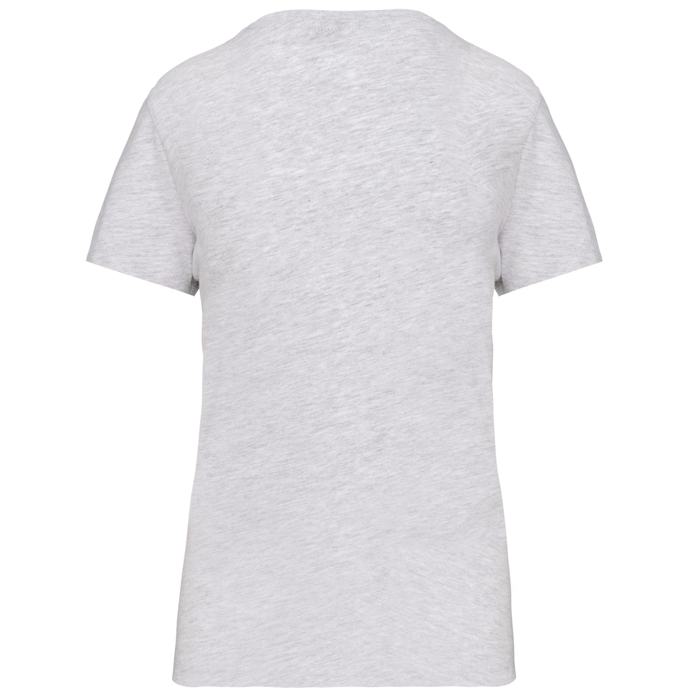 Effen kleuren : 100% katoen. Kleur Ash Heather 98% katoen / 2% viscose en Oxford Grey : 90% katoen / 10% viscose. Alle kleuren zijn gemaakt van biologisch katoen. V-hals in ribboord met elasthan. Toon op toon nektape. Dubbel stiksel aan mouwuiteinden en onderkant. Gecertificeerd STANDARD 100 by OEKO-TEX®N° CQ1007/7, IFTH.