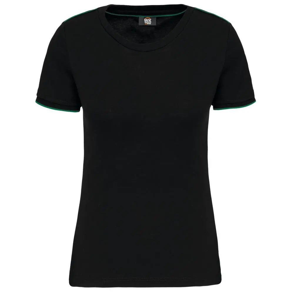 65% polyester / 35% katoen. Gekamd katoen jerseystof. Wasbaar op 60 °C. Anti-pluisbehandeling. Ronde hals met elasthan. Contrasterende bies aan binnenkant kraag en schouders. Mouwuiteinden in ribboord met contrasterend biesje. Afwerking met dubbel stiksel onderaan. Ideaal voor dagelijks gebruik. Gecertificeerd STANDARD 100 by OEKO-TEX®N° CQ1007/7, IFTH.