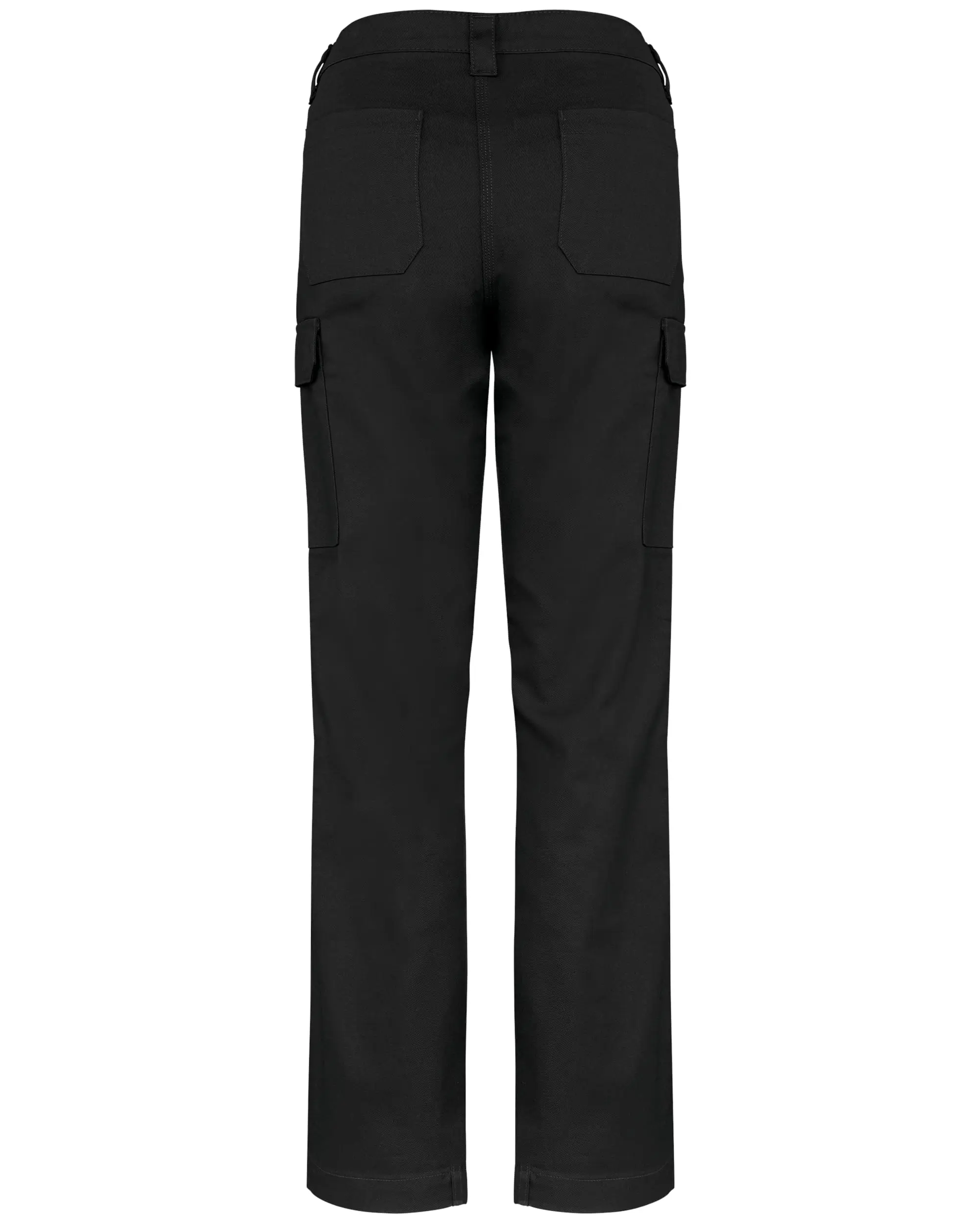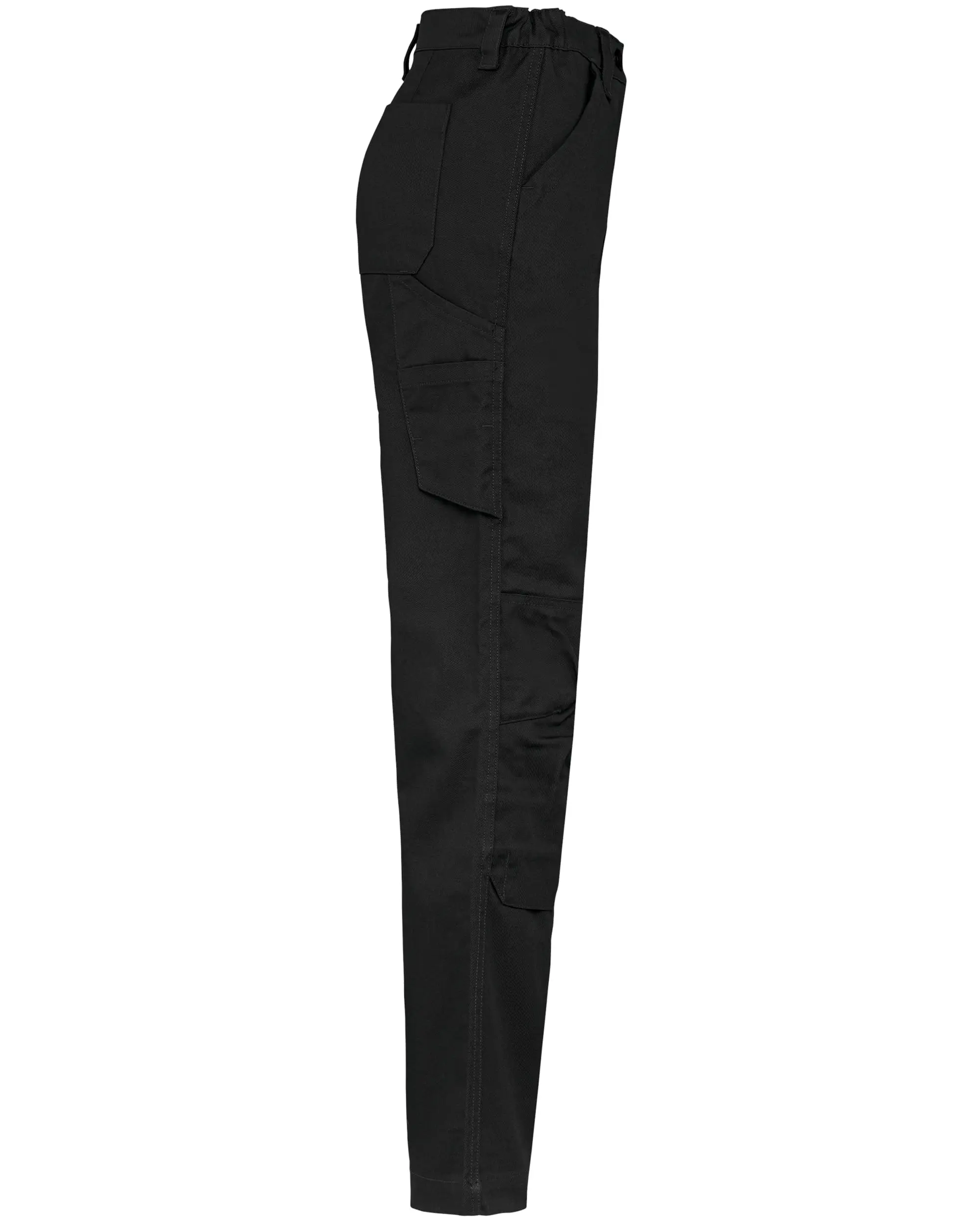 60% katoen / 40% polyester. Twillstof. Wasbaar op 60 °C. Rechte snit. 2 zakken aan de voorkant (binnenzakken in de hoofdstof). 1 zak met klep en klittenbandsluiting links (bij het dragen), 1 dubbele, open gereedschapszak rechts (bij het dragen), 2 opgezette achterzakken, 2 toon-op-toon kniebeschermerzakken met klittenbandsluiting en binnenklep om de kniebeschermers op hun plaats te houden en aan te passen. Gedeeltelijk elastische tailleband met lussen. Ritssluiting met knoop. Plastic knoop. Ruimteplooi voor extra stevigheid en bewegingsvrijheid tussen de benen. Dubbel stiksel in de zijnaden, drievoudig stiksel in de ruimteplooi en het kruis voor- en achteraan. Kniebeschermers niet inbegrepen. Biesstiksel tussen de benen. Zoom onderaan de broekspijpen. Afneembaar merklabel.