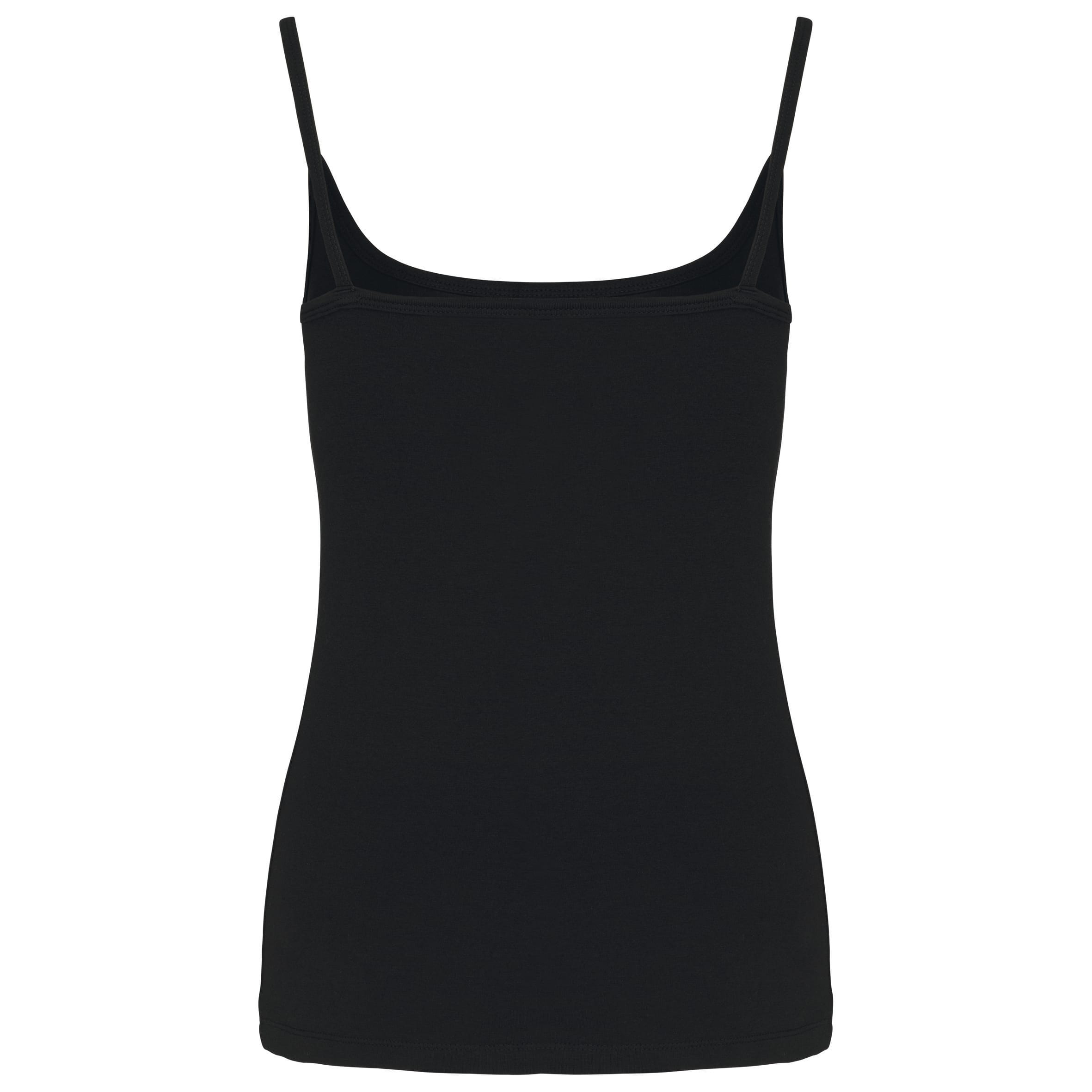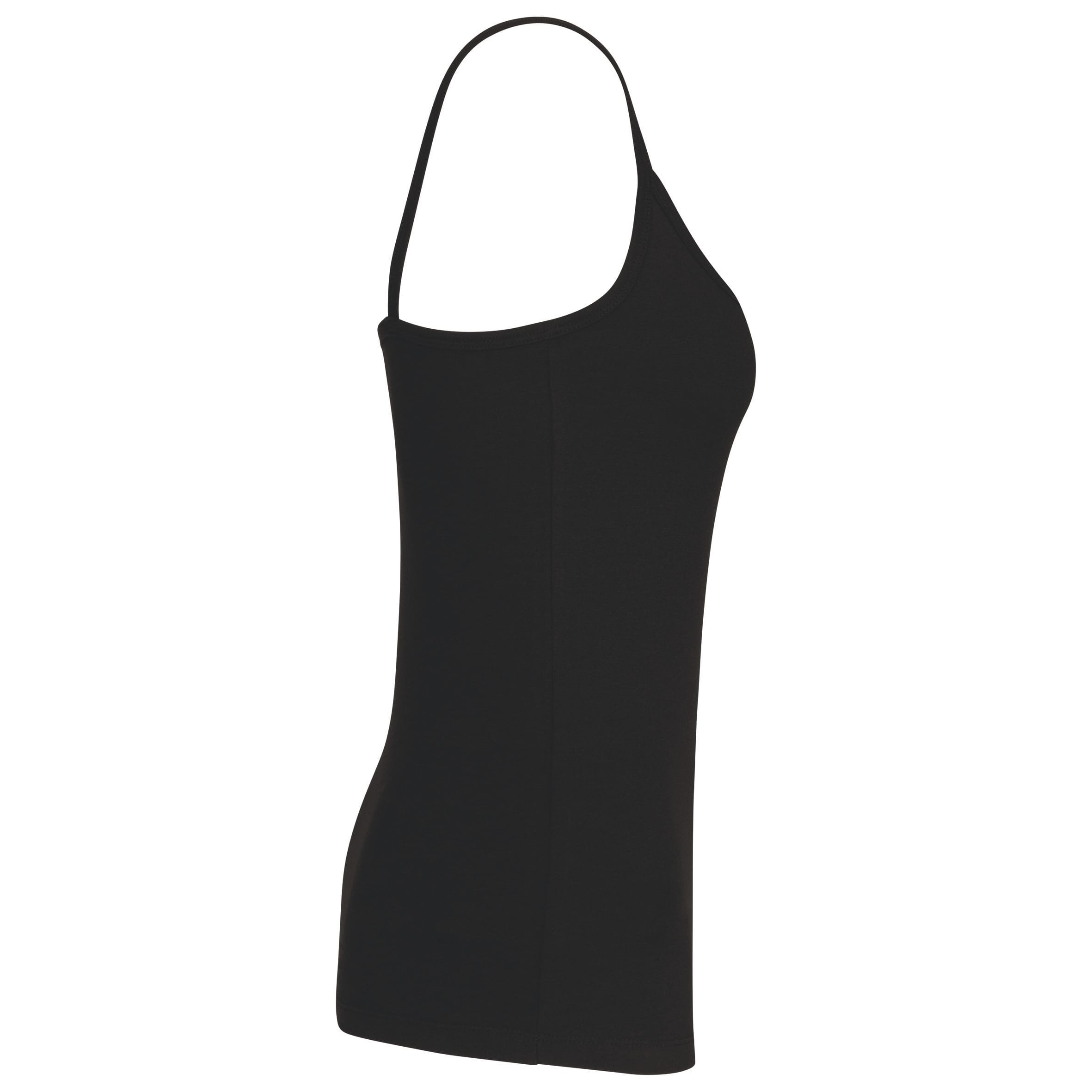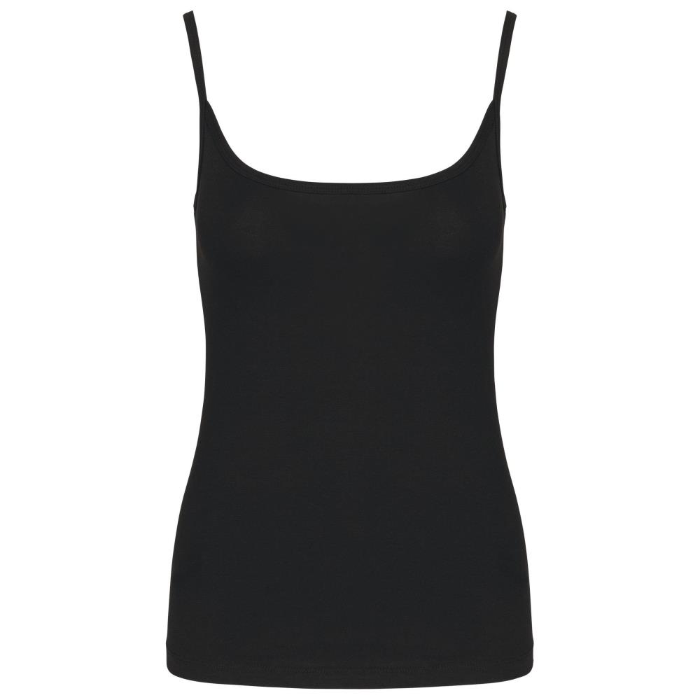 95% katoen / 5% elasthan. (Light Grey Heather : 87% katoen / 9% viscose / 4% elasthan). Gekamt katoen jersey. Dunne schouderbandjes en vrouwelijke pasvorm. Dun biesje aan de kraag en dubbel stiksel onderaan. Gecertificeerd STANDARD 100 by OEKO-TEX®N° CQ1007/7, IFTH.