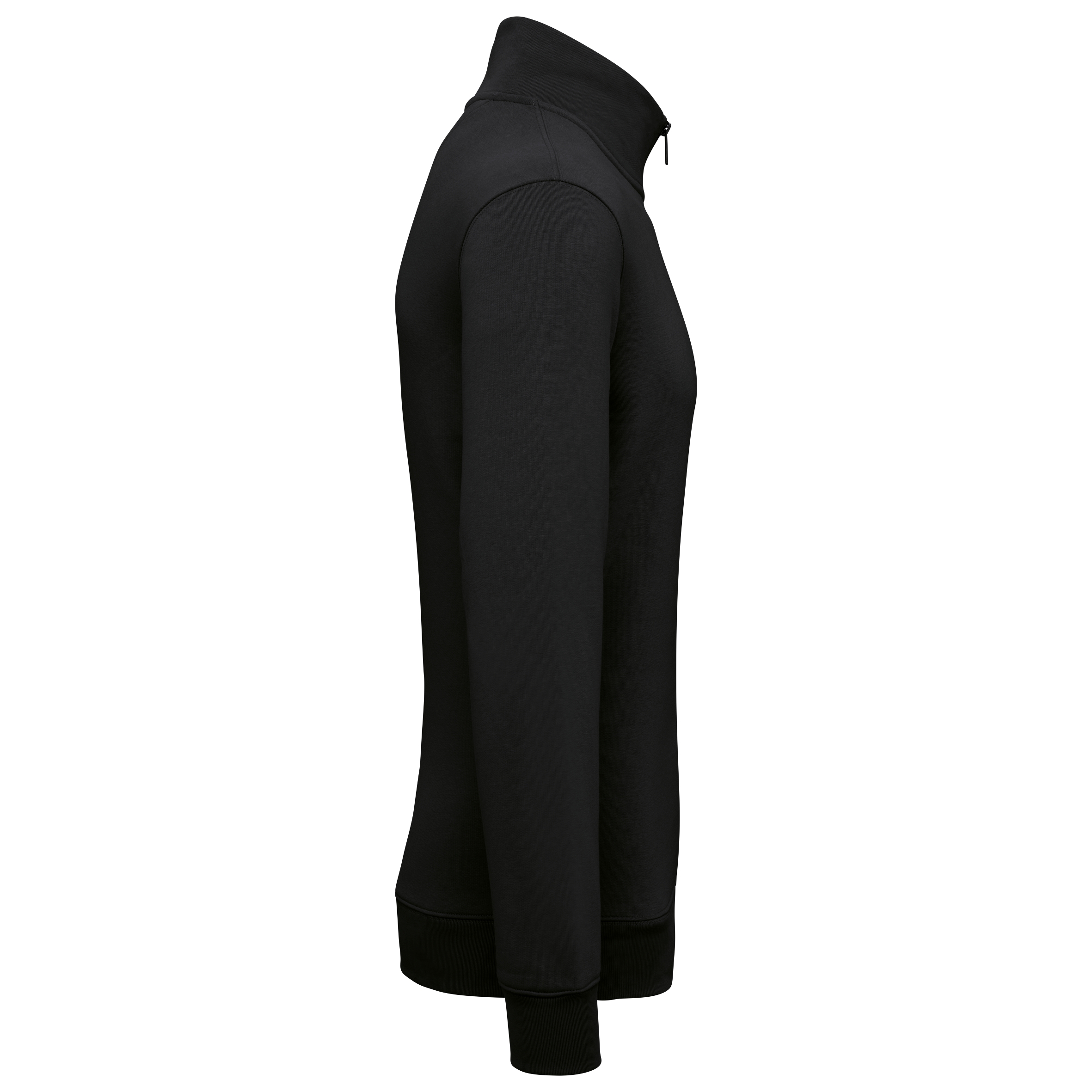 85% biologisch katoen / 15% post-consumer gerecycled polyester. Gekamd katoen. Fitted pasvorm. Enzymgewassen. Geborsteld fleece met 3 LSF-garens (Low Shrinkage Fleece: voorgekrompen fleece). Halvemaan op de achterkant. Opstaande kraag, gevoerd met de hoofdstof, met een rits in gerecycled metaal. Ton-sur-ton nektape in jersey om de binnenkant van de kraag af te werken. Hals, mouwuiteinden en onderkant in 1×1 ribboord.