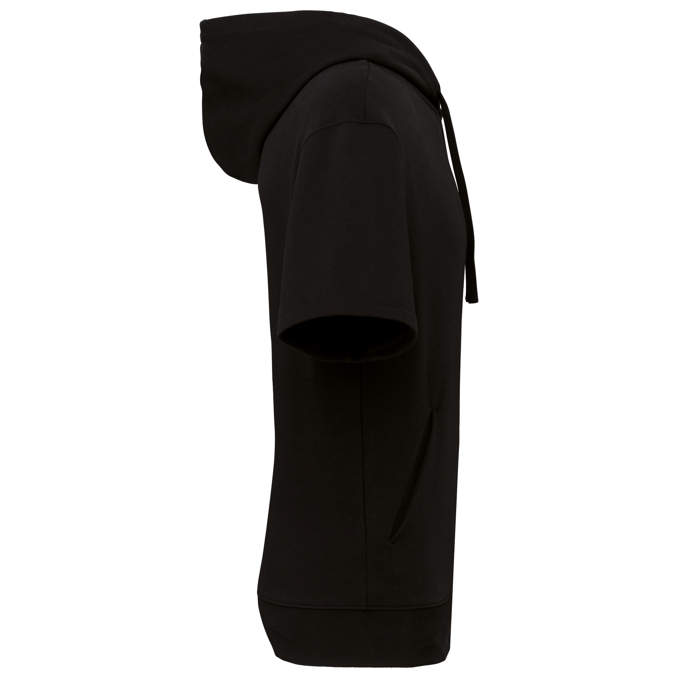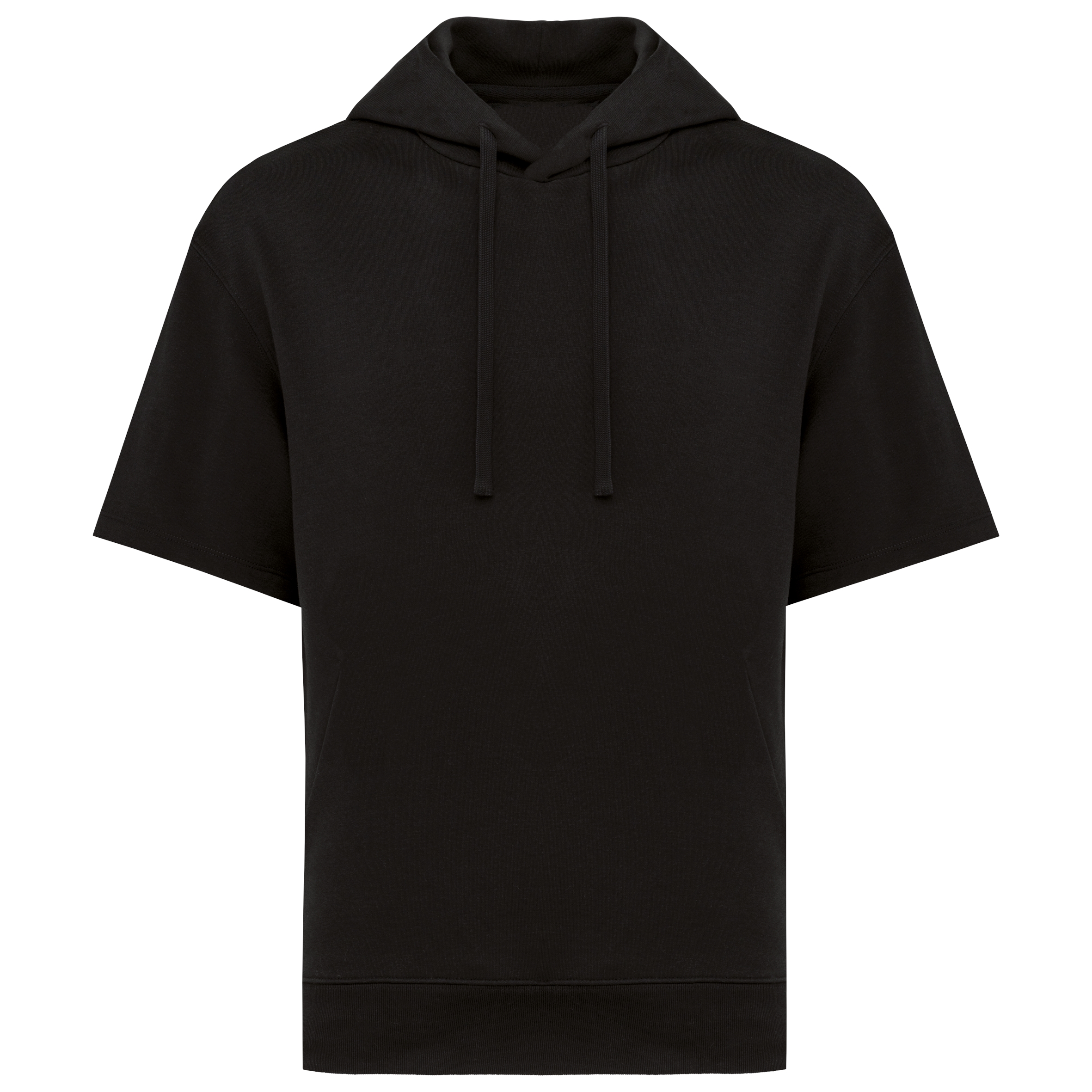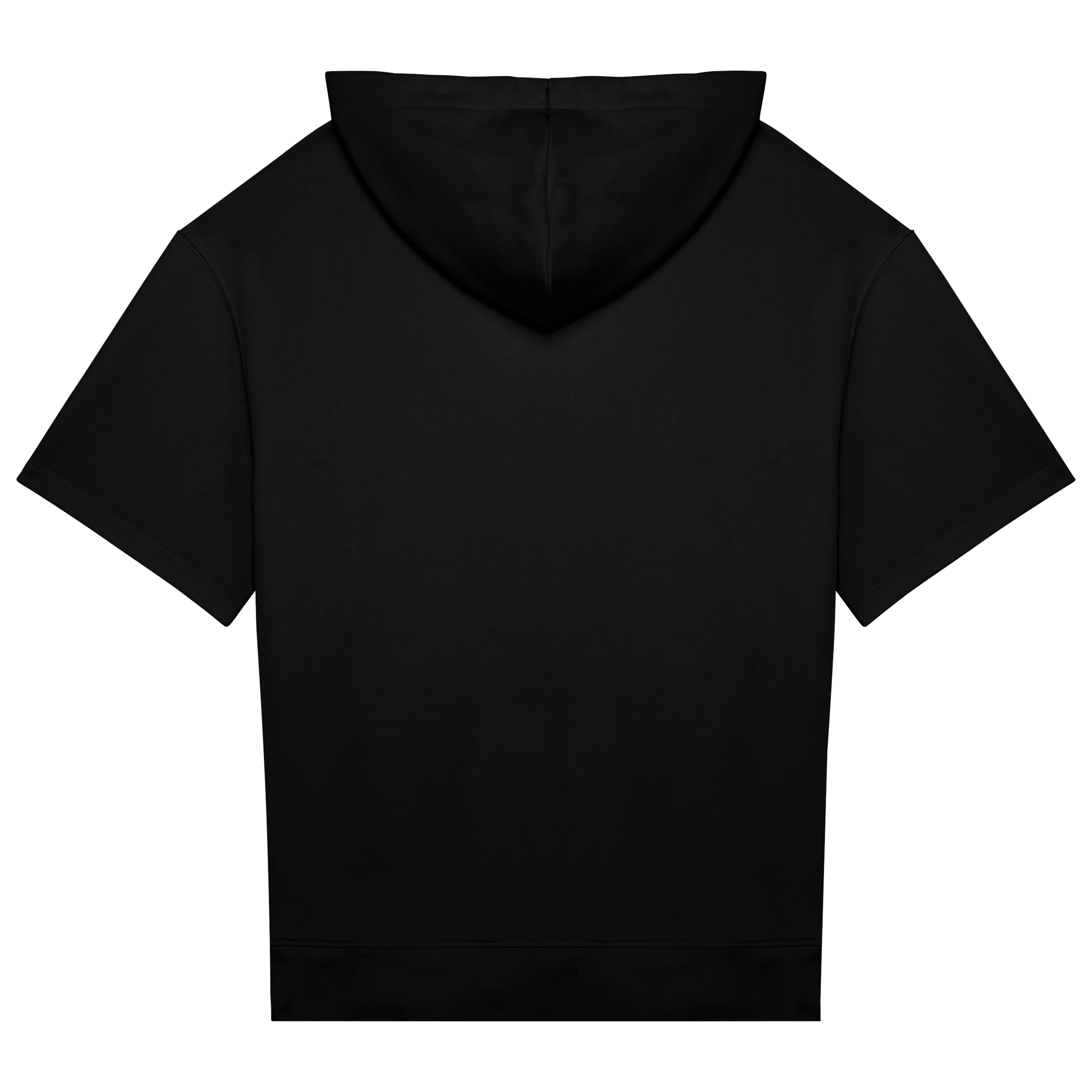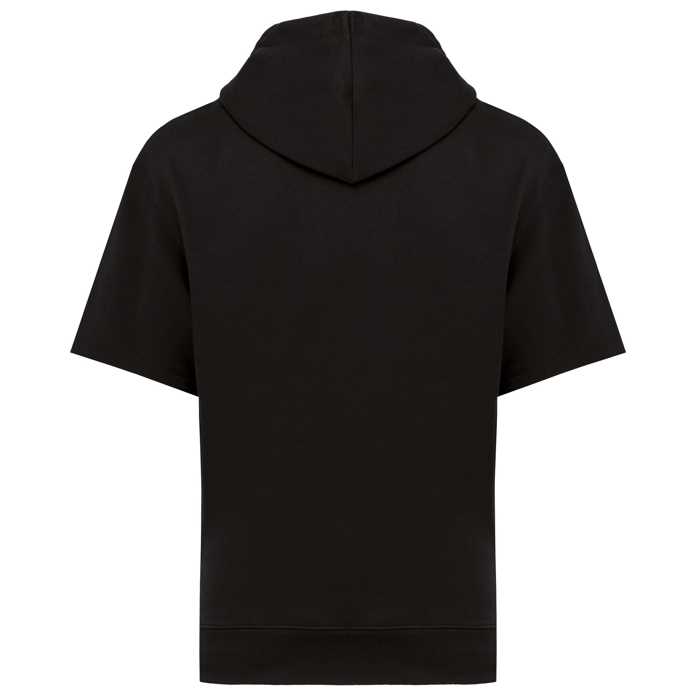 85% biologisch katoen / 15% post-consumer gerecycled polyester. Gekamd katoen. Rechte snit met afhangende schouders. Enzymgewassen. Ongeborsteld fleece met 3 LST-garens (Low Shrinkage Terry: voorgekrompen fleece). Halvemaan op de achterkant. Capuchon met 2 panelen, gevoerd met de hoofdstof en stiksel rondom. Geborduurde verluchtingsgaatjes. Platte koordjes afgewerkt met biesstiksel. Minimalistische zijzakken. Onderkant in 1×1 ribboord. Ton-sur-ton nektape in de hoofdstof om de binnenkant van de kraag af te werken.