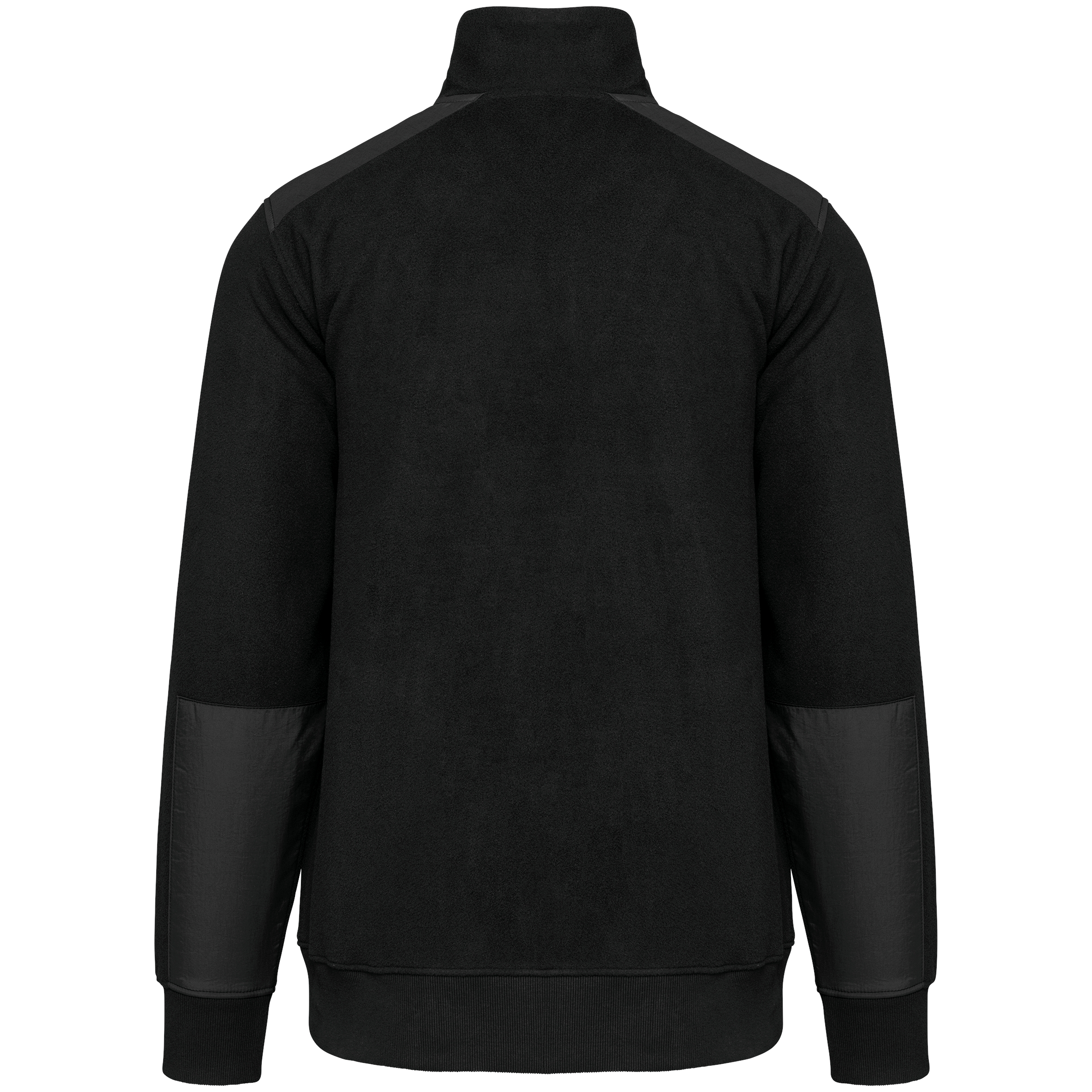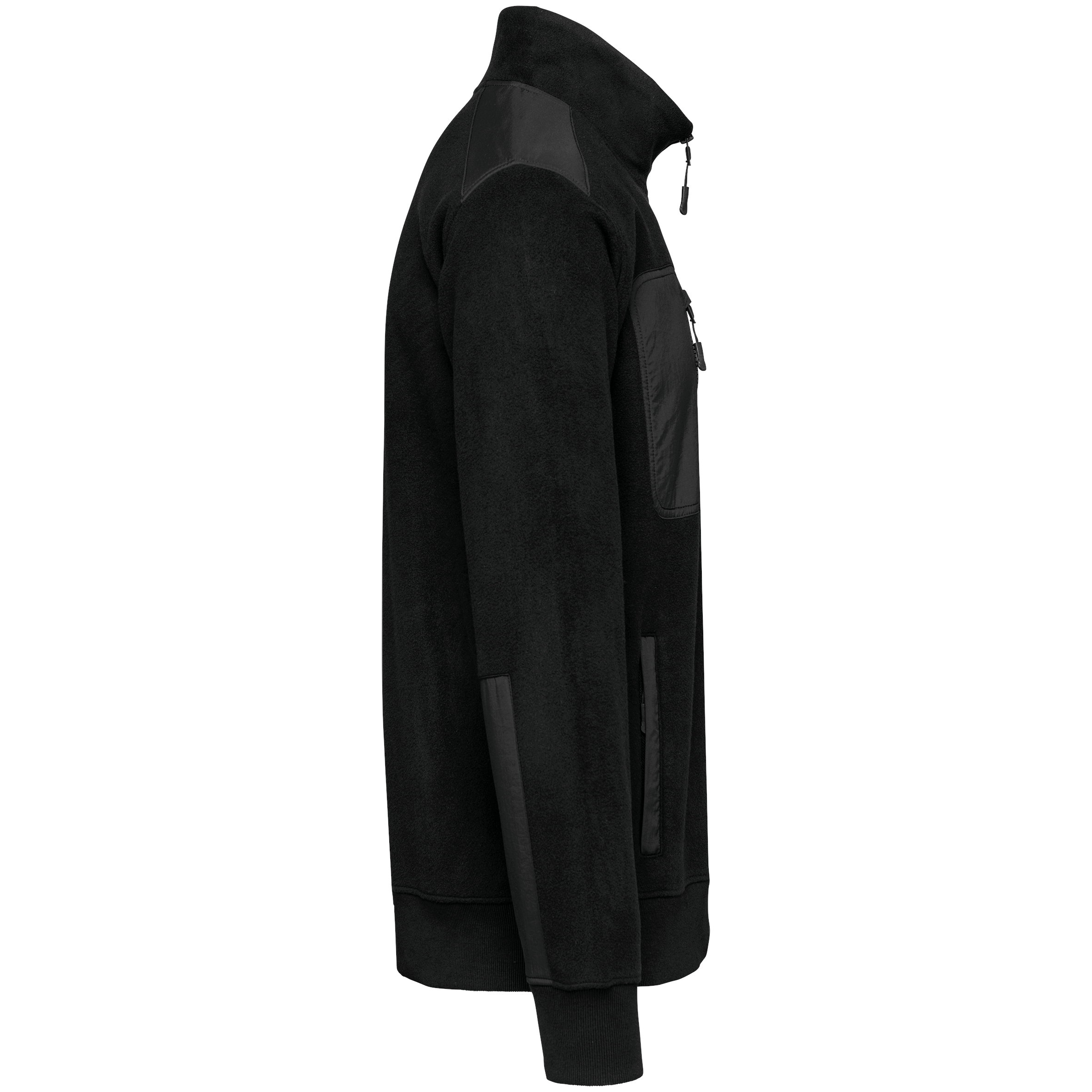 100% gerecycleerd polyester. Rechte snit. 2 ritszakken met bies in taslan met ritstrekker aan de voorkant. 1 afgerond borstzakje met rits en ritstrekker in taslan met toon-op-toon stiksel rechts (bij het dragen). Kraag gevoerd met 2×2 ribtricot en rits van gerecycleerd plastic + ophanglus in de kraag. Verstevigende inzetsels aan schouders en voorarm in taslan. 2×2 ribboord in buisconstructie aan de mouwuiteinden en de onderkant. Afneembaar merklabel.