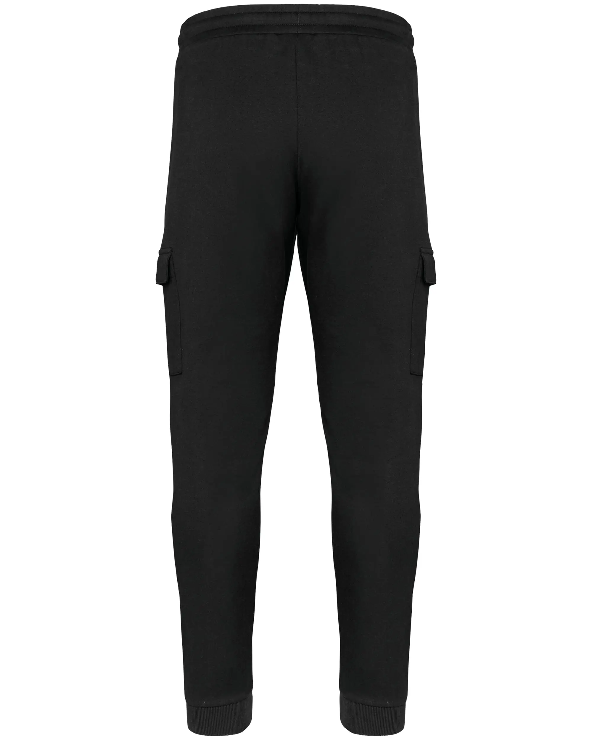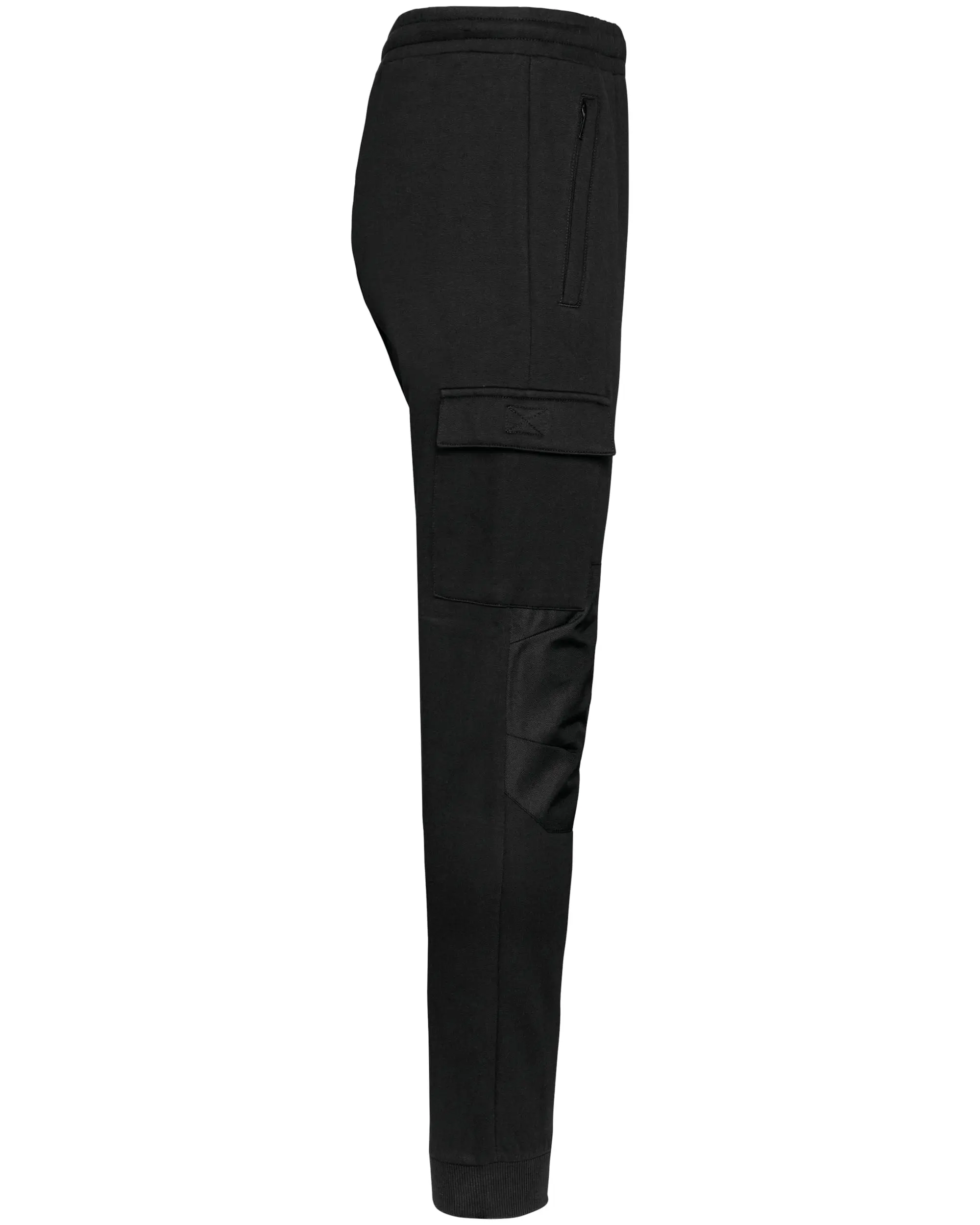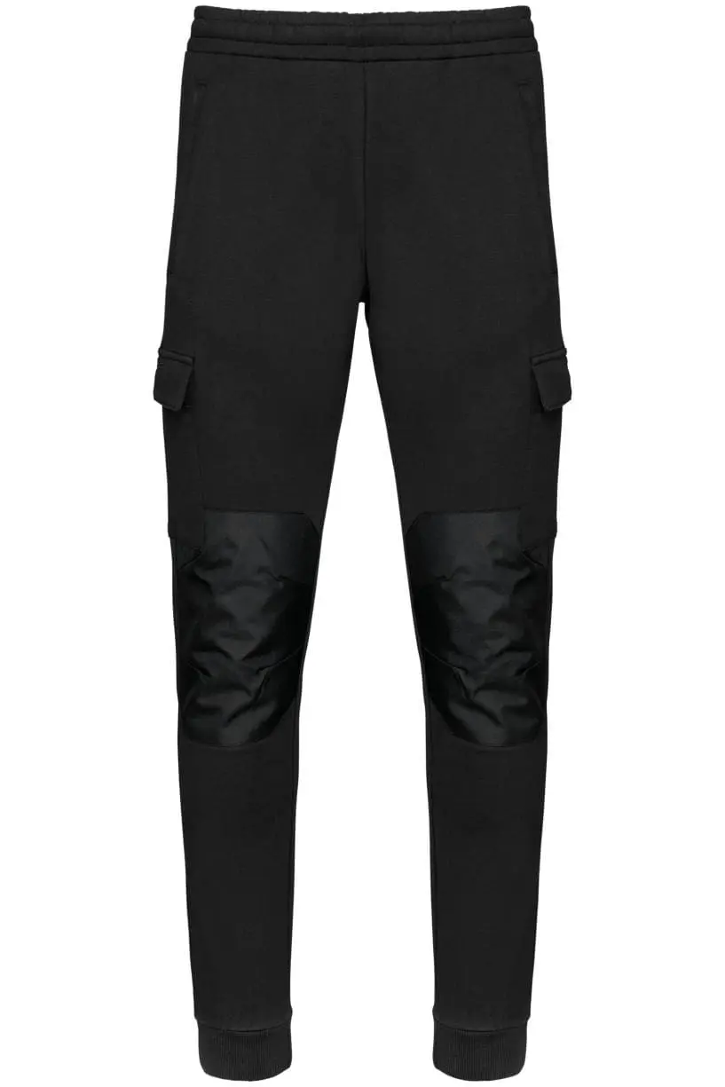 60% katoen / 40% gerecycleerd polyester. Enzymgewassen fleece 3 draden LSF (Low Shrinkage Fleece). Rechte snit. 2 omzoomde zakken aan de voorkant met binnenzakken in de hoofdstof en 2 opgezette cargozakken met klep en klittenbandsluiting. Elastische tailleband met aanrijgkoordjes met een rubberen uiteinde. Zwarte knielappen in Cordura® voor alle kleuren. De broekspijpen zijn afgewerkt met 2×2 ribboord in buisconstructie met elasthan erin. Afneembaar merklabel.