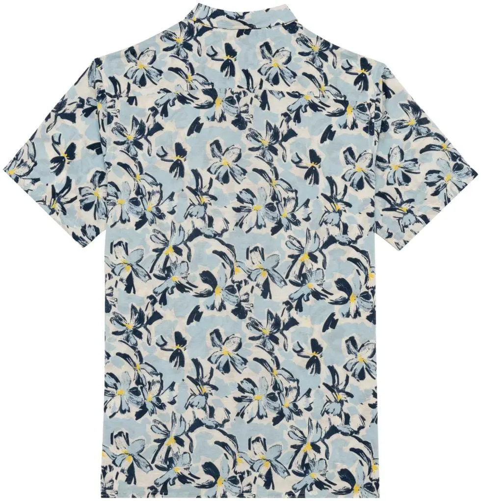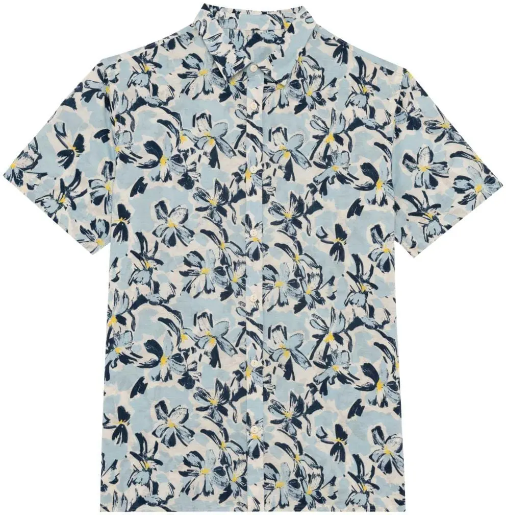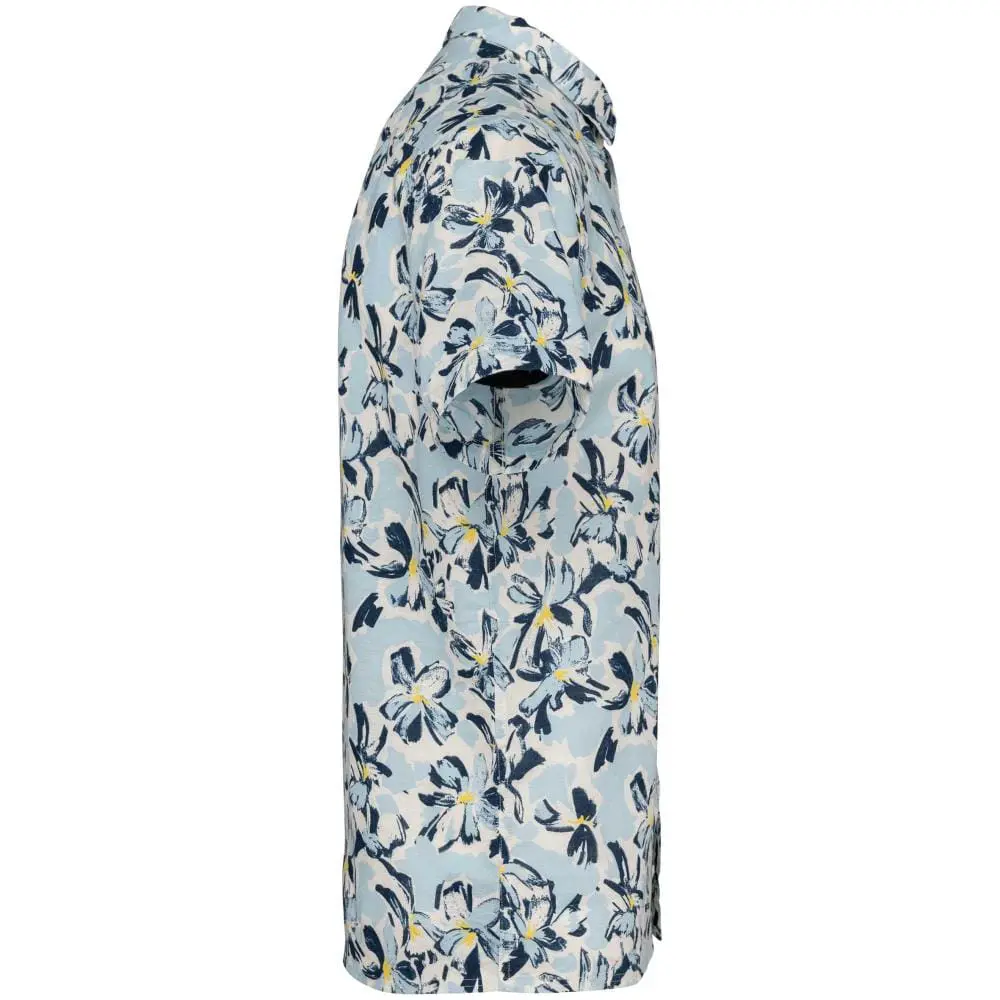 62% linnen / 38% biokatoen. Geweven. Fitted pasvorm. Zijnaden. Hemdskraag met staanders. Opgezette knooplijst met contrasterende knopen. Gevoerd inzetsel op de rug. Geweven met doorlopende gedrukte motieven. Kledingstuk gewassen na montage: kleuren kunnen per product verschillen.