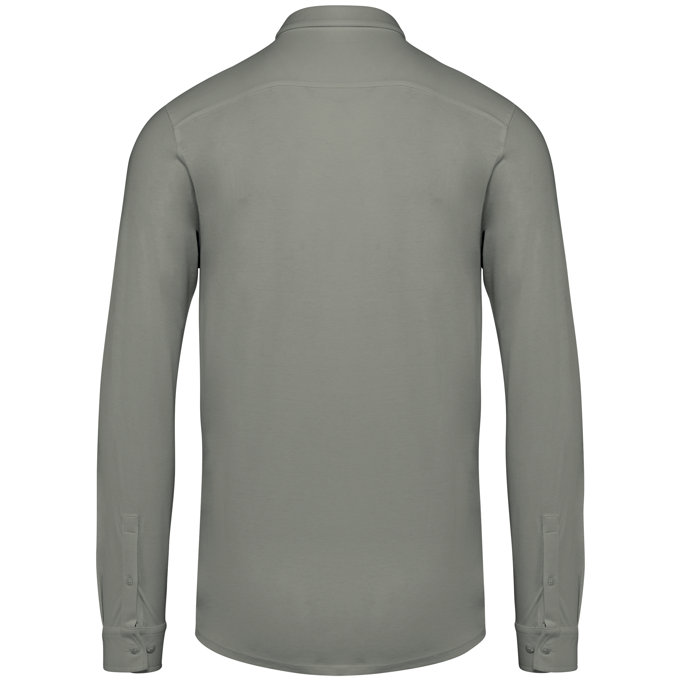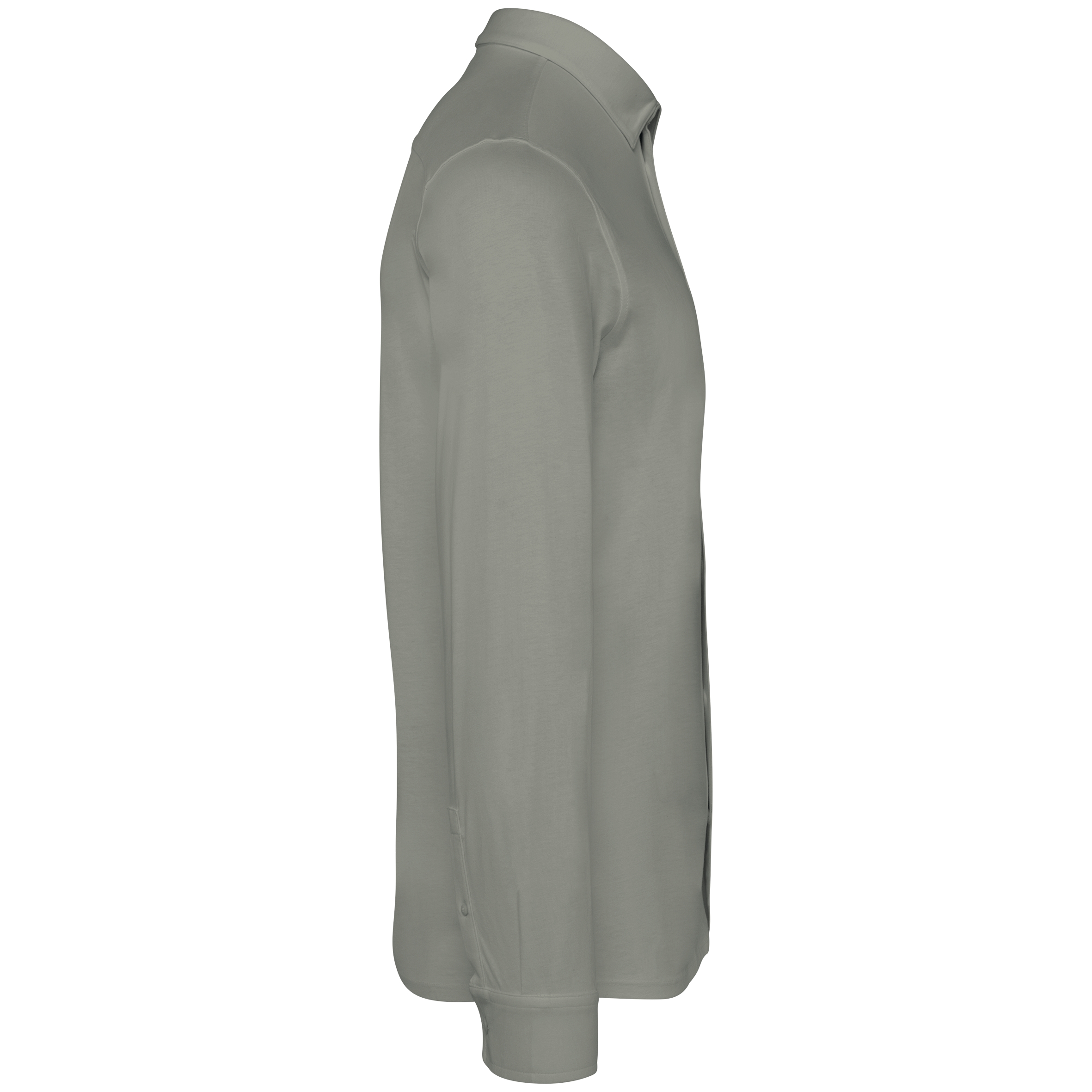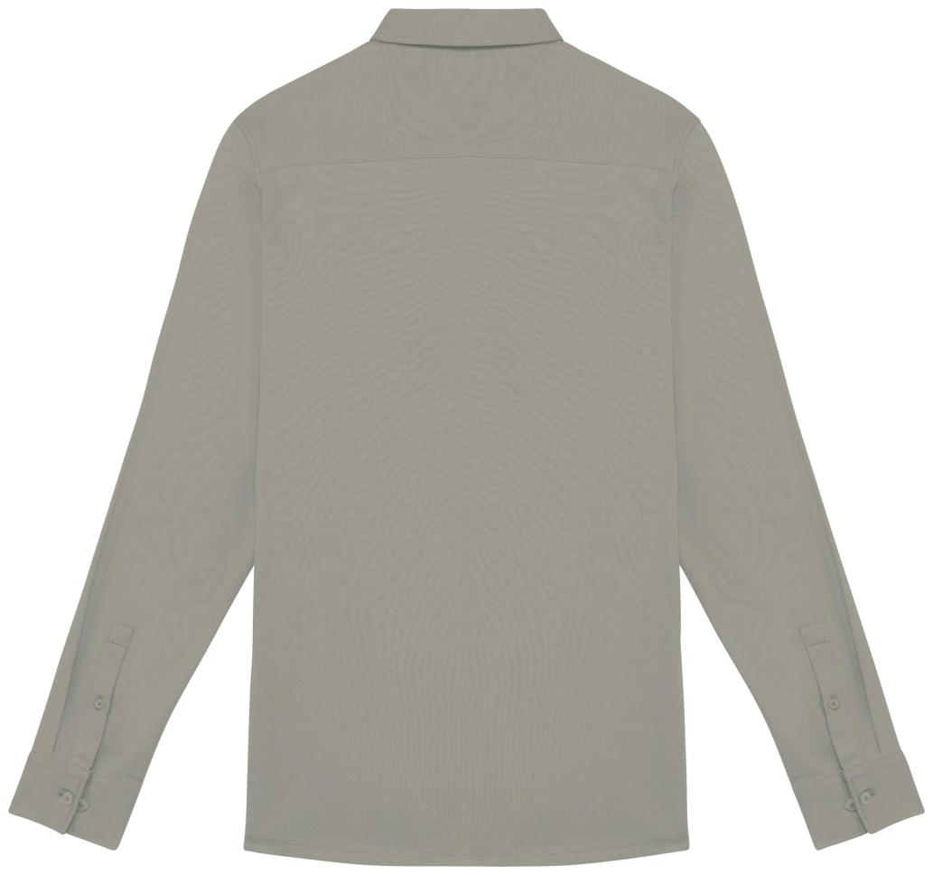 100 % biologisch katoen. Eenvoudige jersey. Fitted pasvorm. Enzymgewassen. Opstaande kraag in hoofstof. Toon op toon nektape in jersey aan de binnenkant. Knooplijst aan de voorkant met gerecyclede toon op toon knopen met parelmoerlook. Mouwboorden met puntvormige mouwlijst en knoopjes. Zijnaden met enkel stiksel Inzetsel aan de bovenkant van de rug. Zoom met dubbel stiksel onderaan. Afgeronde onderzijde.
