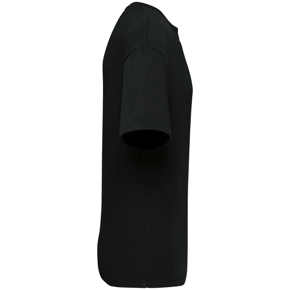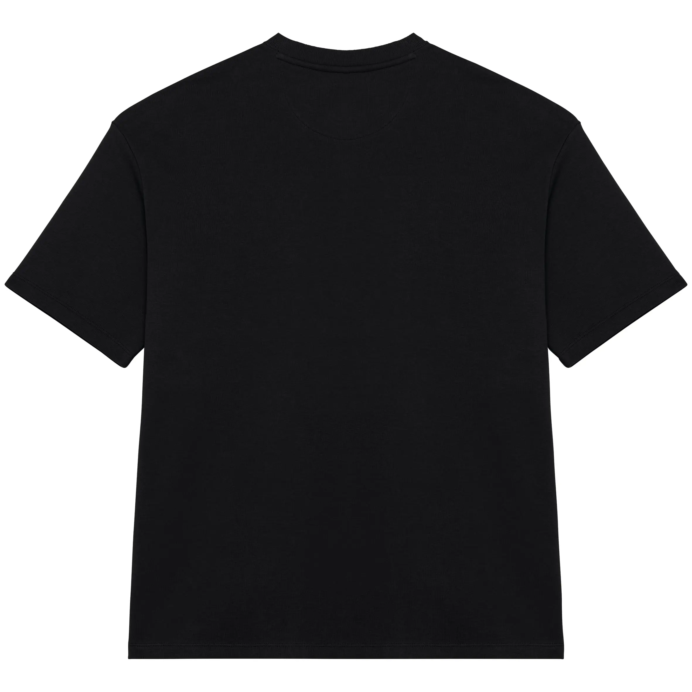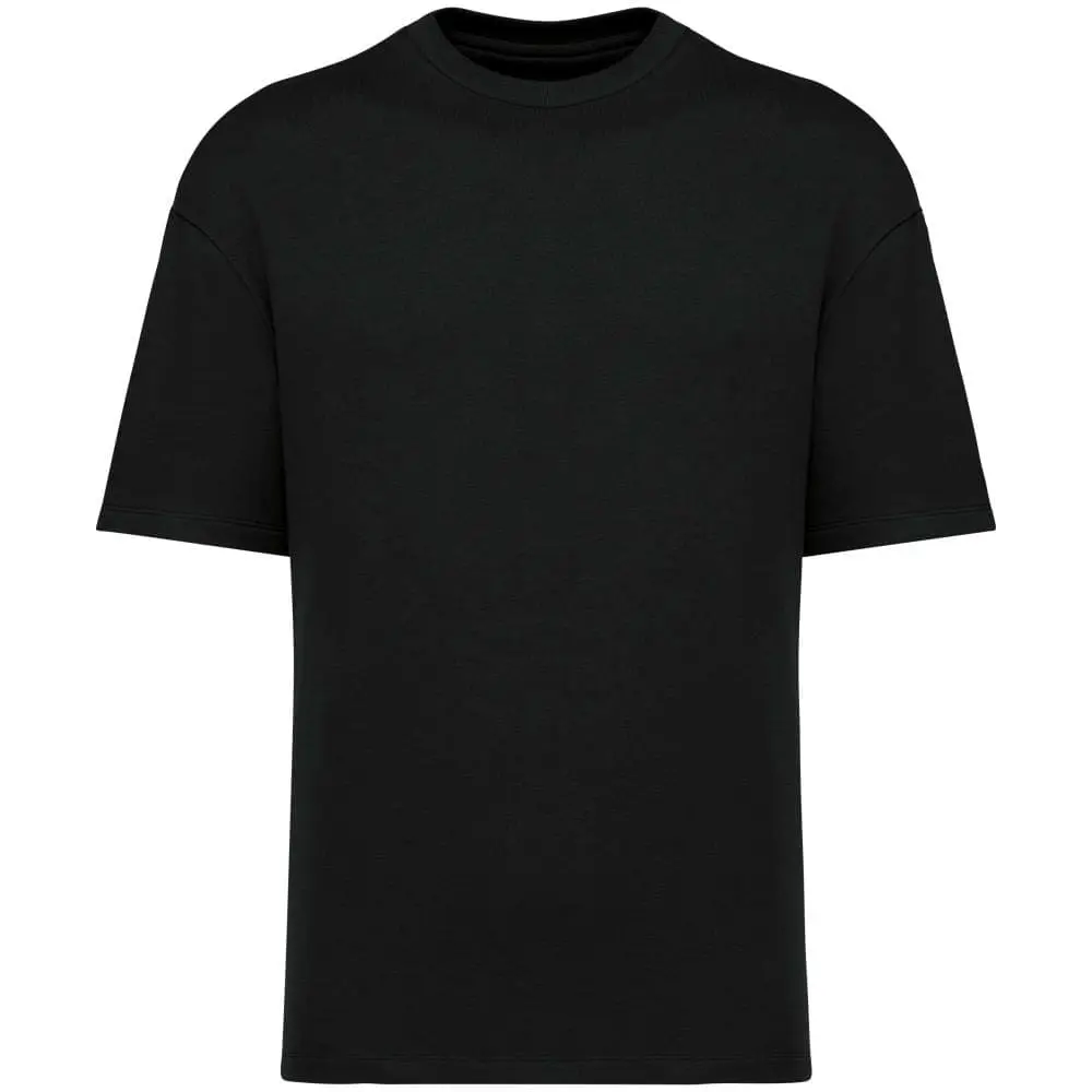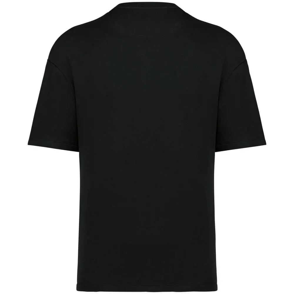 85% biologisch katoen / 15% post-consumer gerecycleerd polyester. Gekamd katoen. Oversized model. Product tussen een sweater en een T-shirt in. Ongeborstelde fleece 3 draden LST (Low Shrinkage Terry) Halvemaan op de achterkant. Enzymgewassen. Kraag in 1×1 ribboord. Dubbel stiksel aan mouwuiteinden en onderkant.