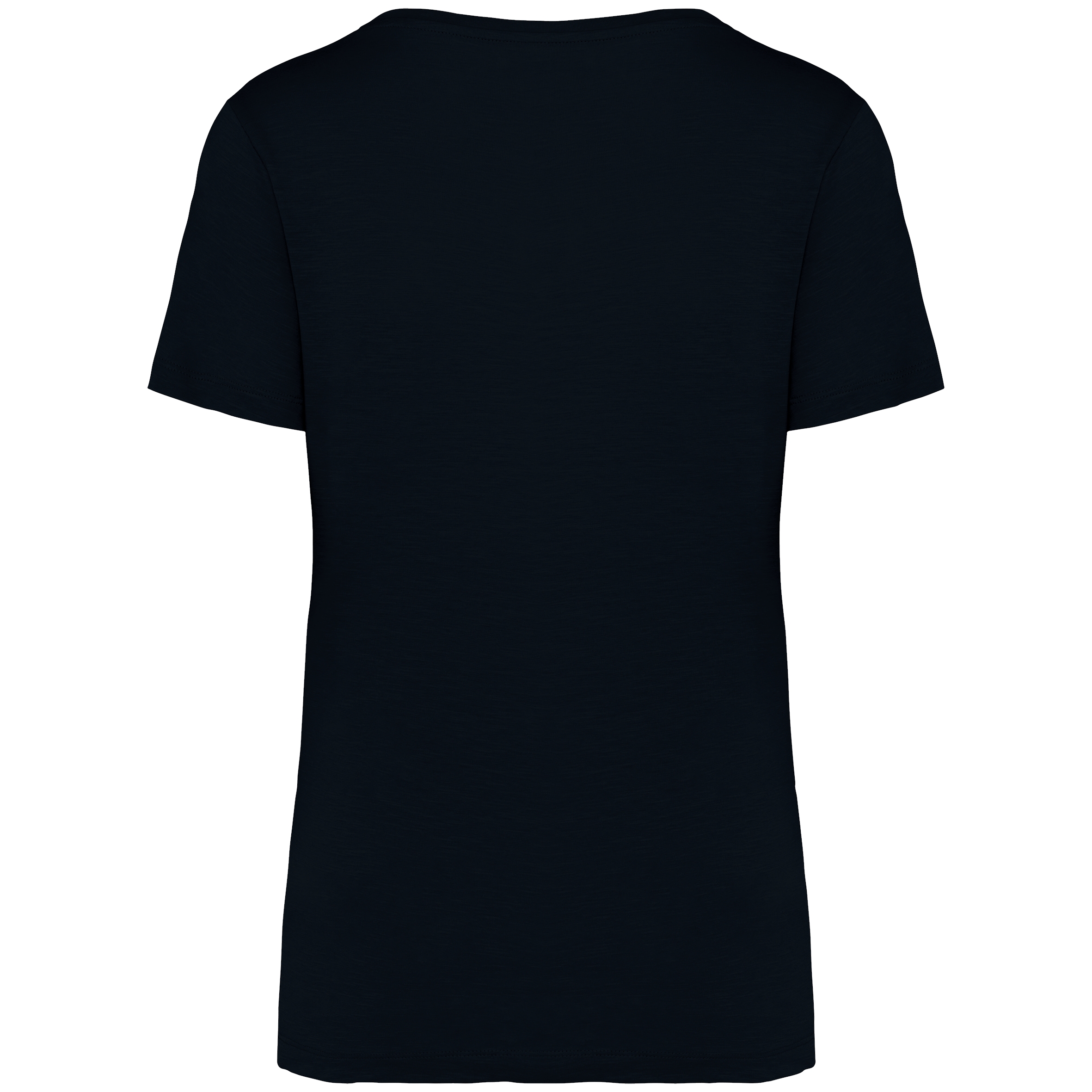 100 % biologisch katoen. Gekamd en ringgesponnen katoen. Stof in jersey met gevlamd effect. Regular snit. Zijnaden. Brede kraag met onafgewerkte boorden in de hoofdstof. Nektape in de hoofdstof in de kraag. Zoom met dubbel stiksel aan de mouwuiteinden en onderaan. Kledingstuk geverfd na montage: de kleuren kunnen licht variëren.