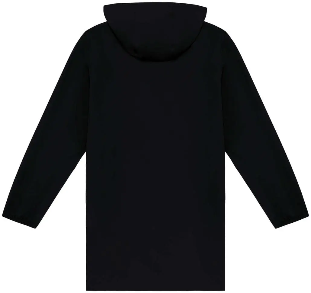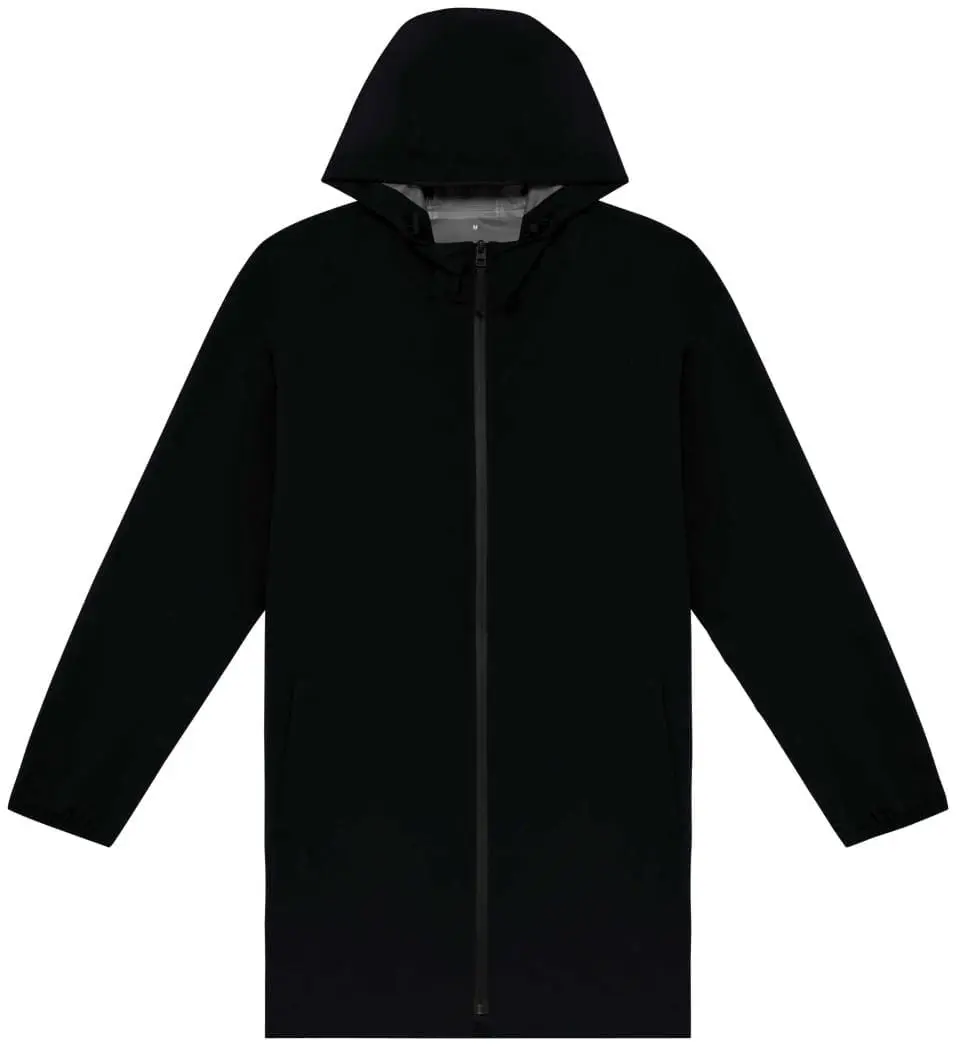 100 % post-consumer Gerecycled Polyester. Rechte snit. Waterdicht 4000 mm. Ademend 3000 gsm/24 u. Waterdichte gerecycleerde rits met ritstrekker van gerecycleerd metaal. Stof met binnenlaag en thermogelaste naden om het product waterdicht te maken. Twee omzoomde zakken met omgekeerde rits. Capuchon met aanrijgkoordjes. Elastische mouwuiteinden.