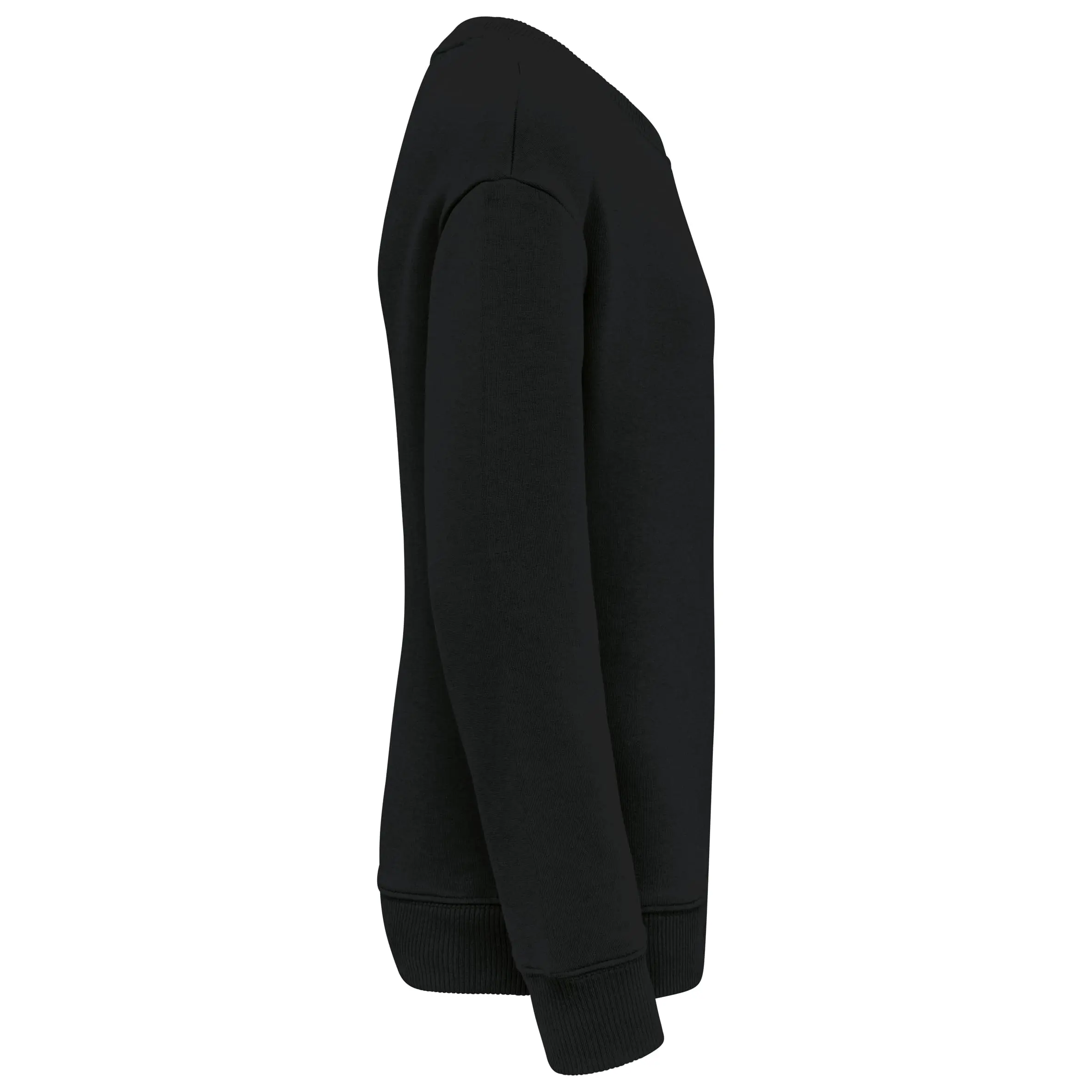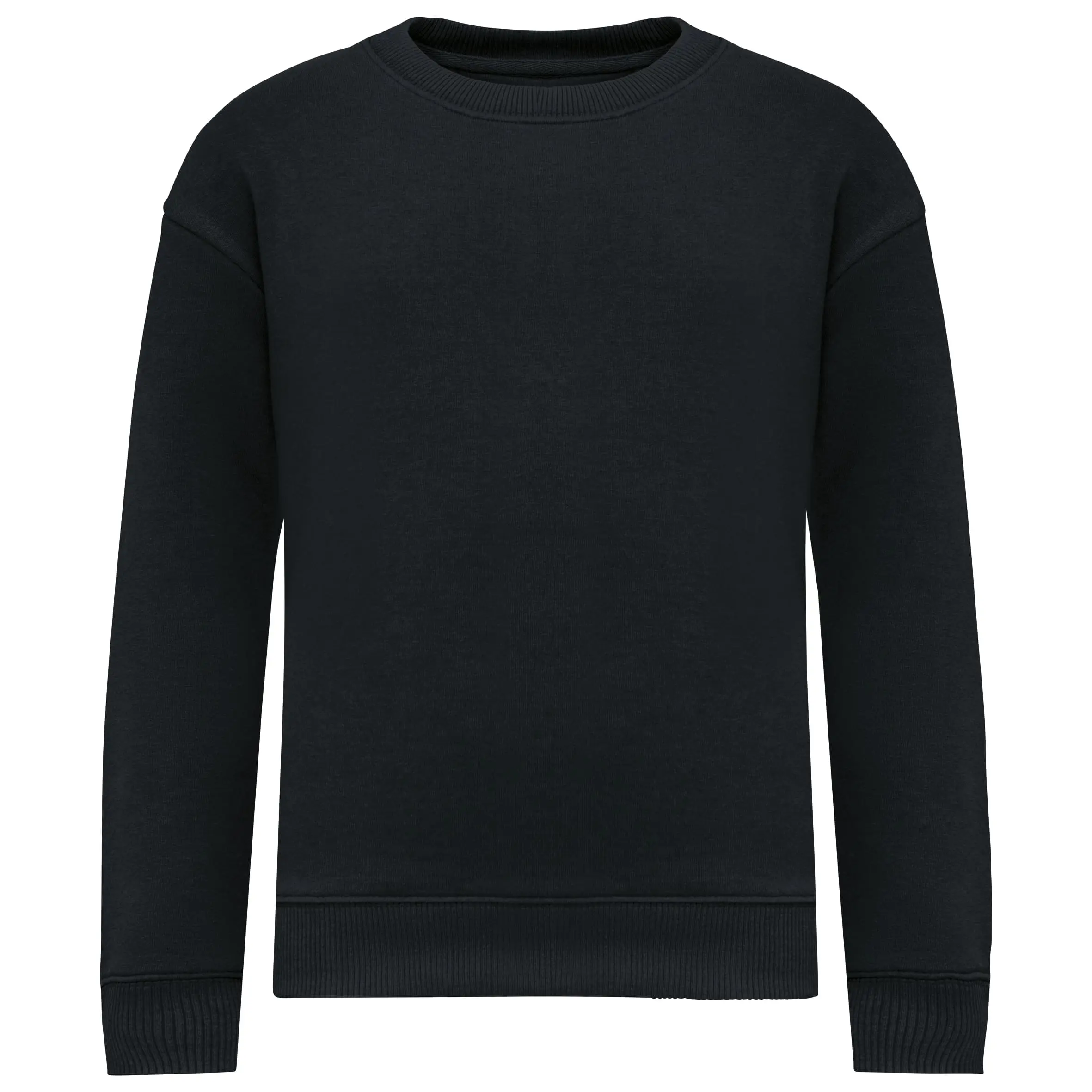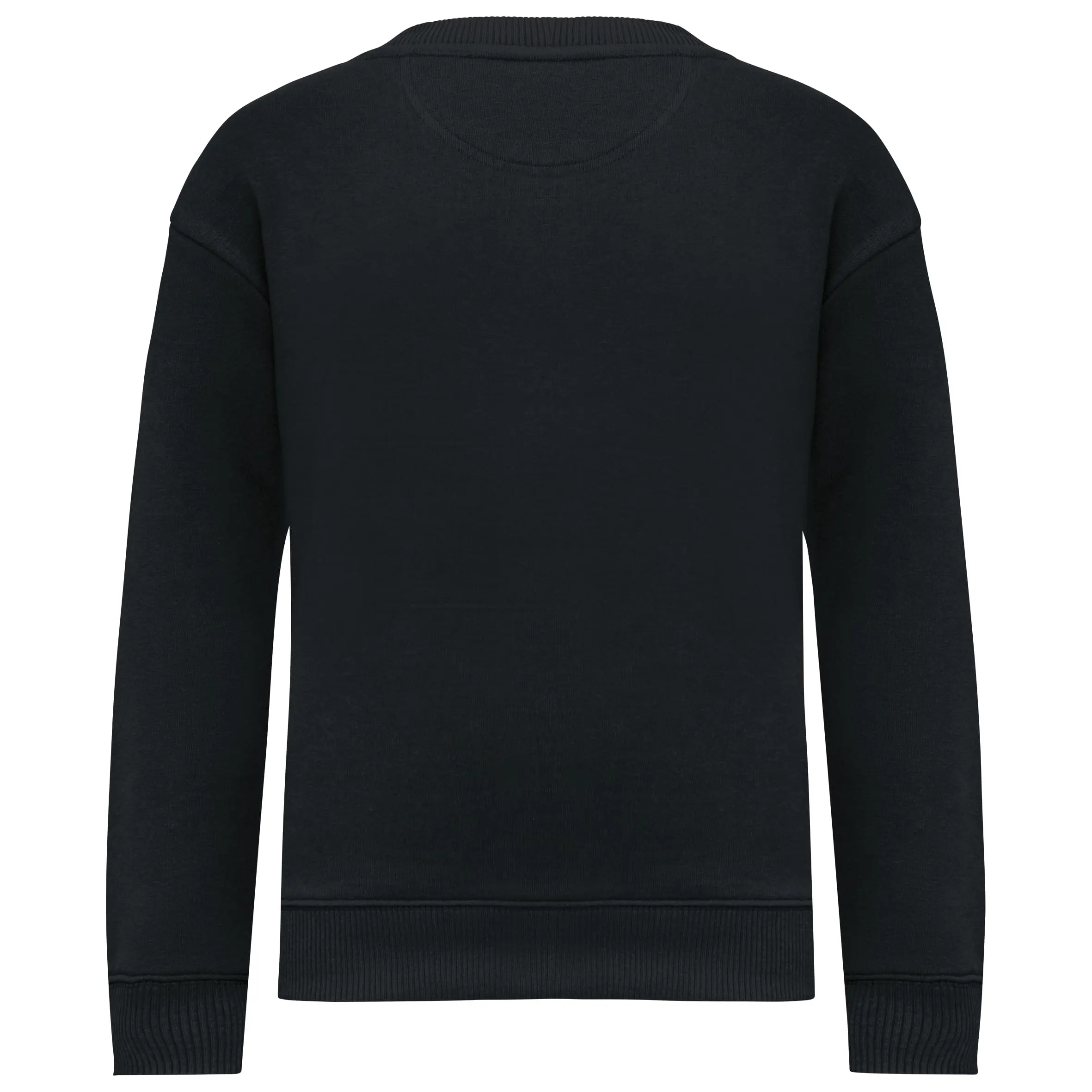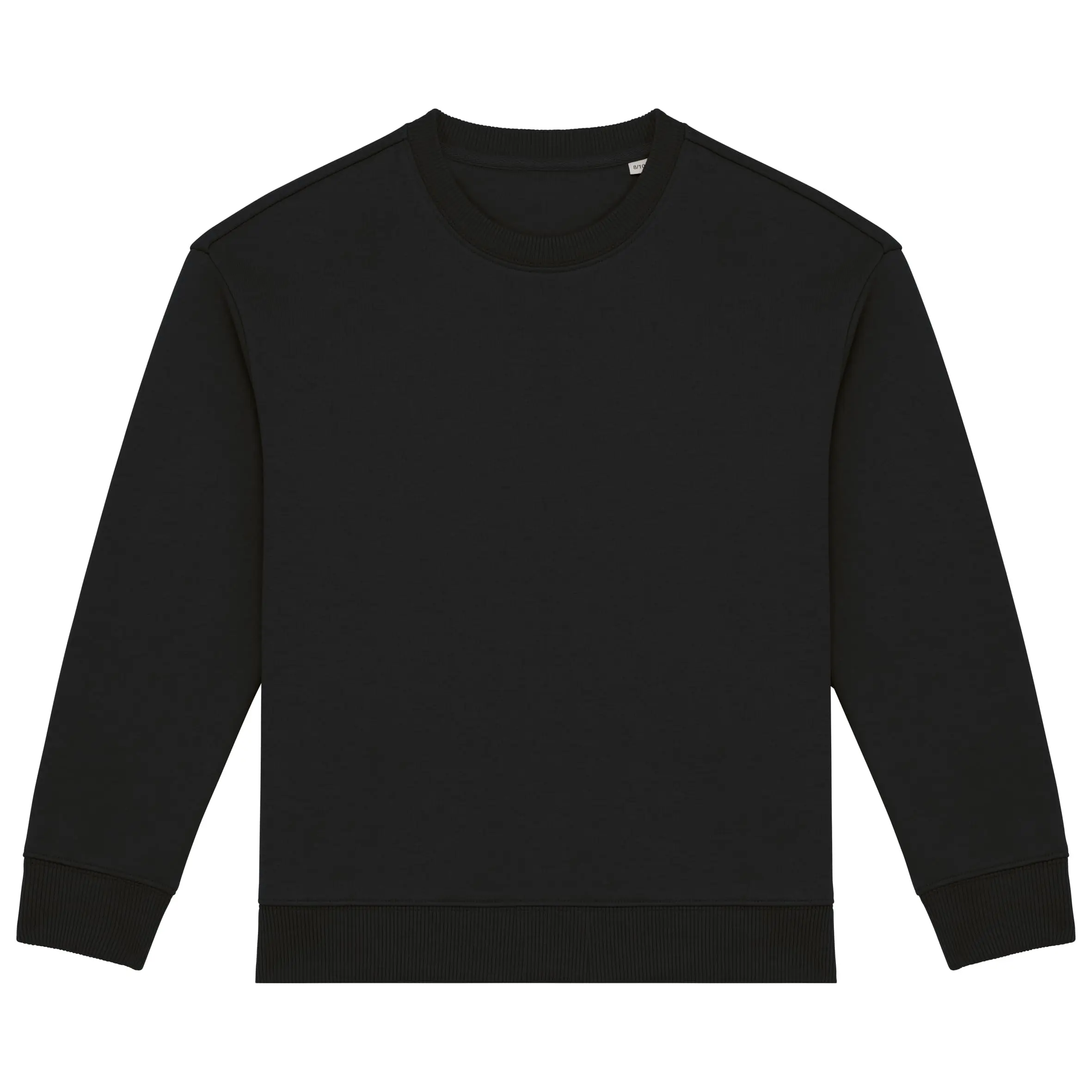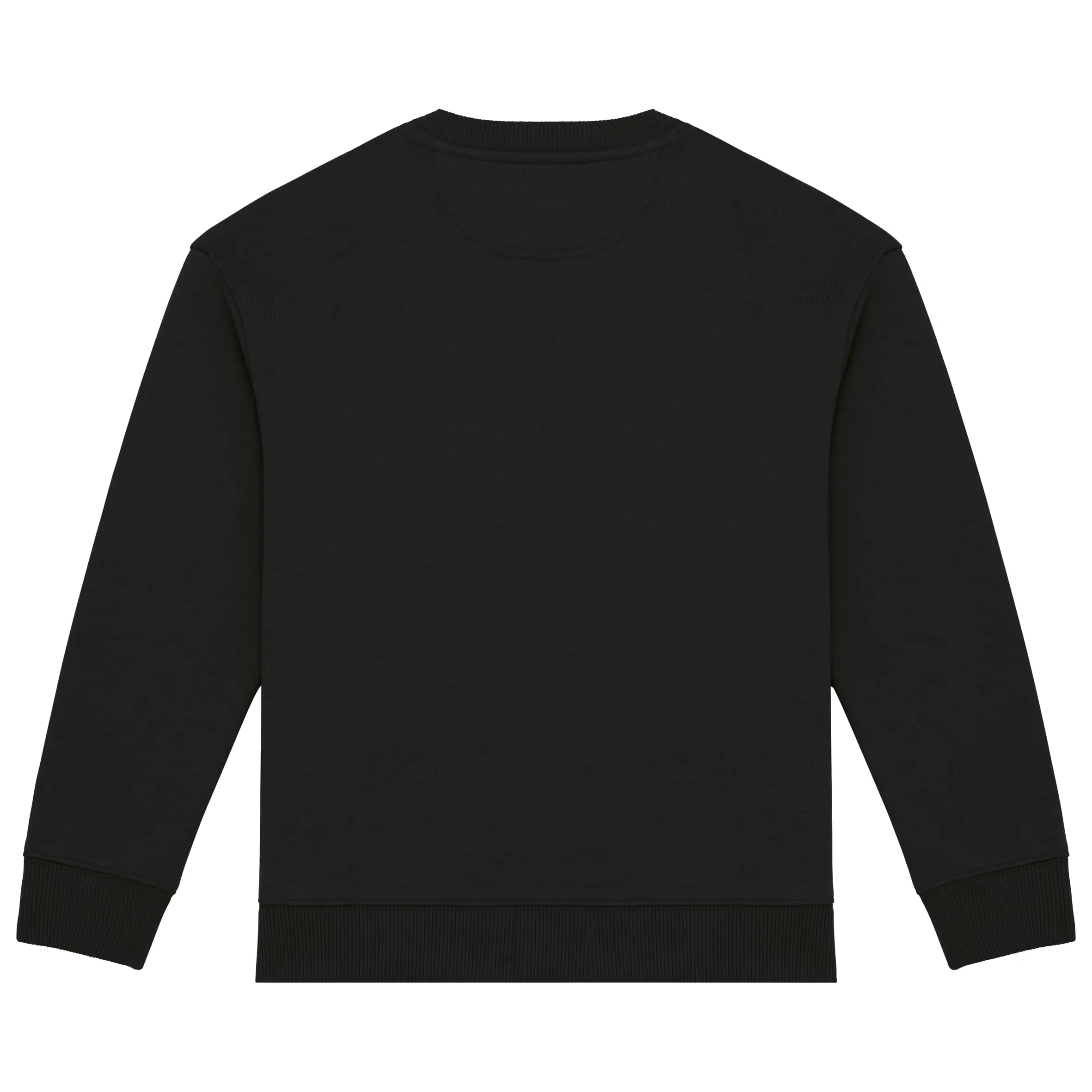 85% biologisch katoen / 15% post-consumer gerecycled polyester. Gekamd katoen. Enzymgewassen. Oversized model met afhangende schouders. Geborsteld fleece met 3 LSF-garens (Low Shrinkage Fleece: voorgekrompen fleece). Halvemaan op de achterkant. 2×1 ribboord aan hals, mouwuiteinden en onderkant. Ton-sur-ton nektape in kepermotief om de binnenkant van de kraag af te werken.