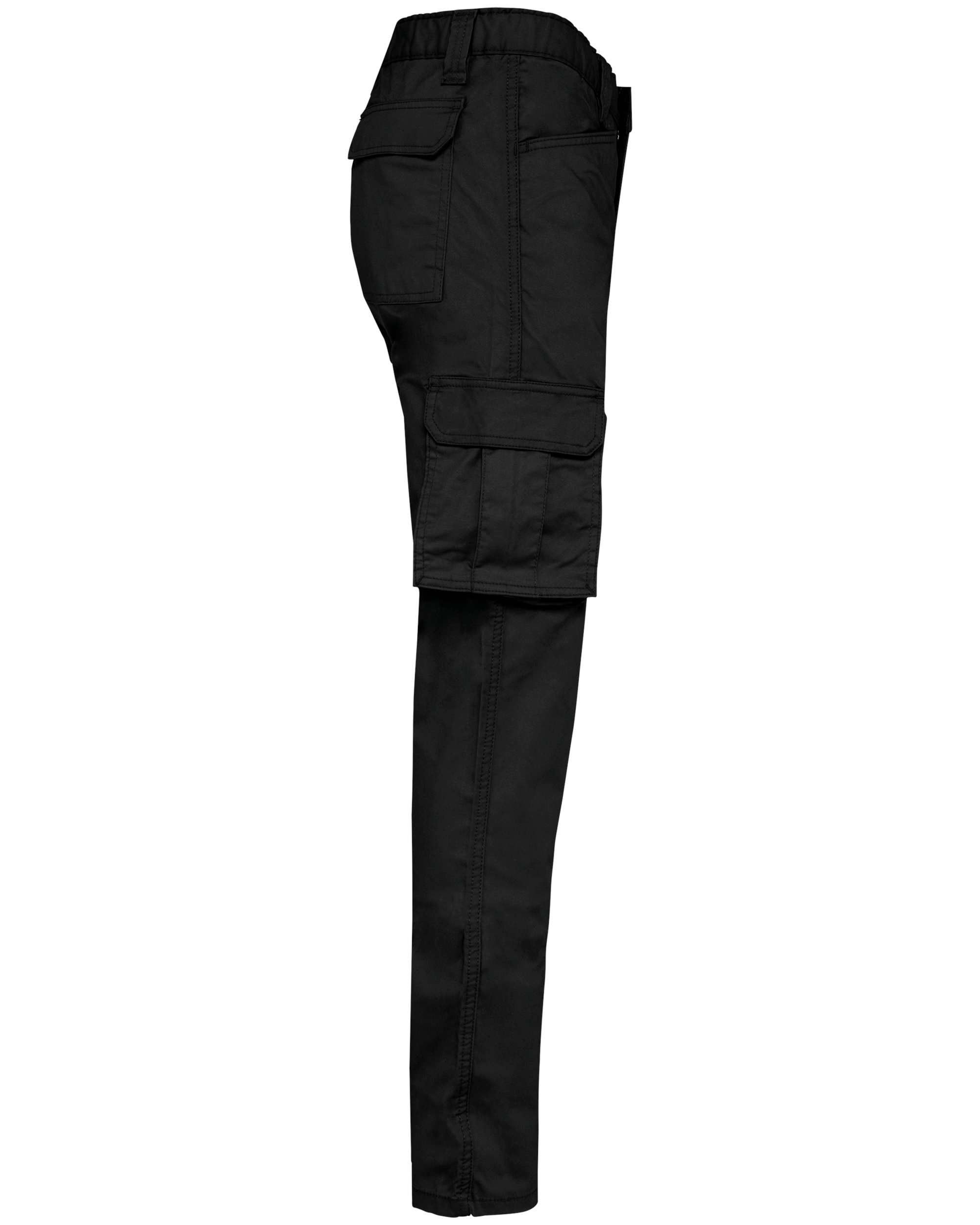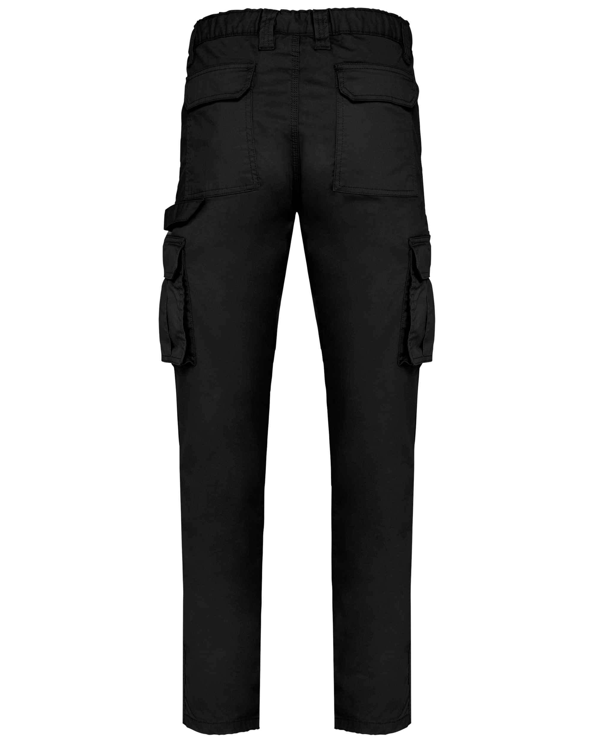 65% katoen / 33% polyester / 2% elasthan. Gemaakt van 65% biologisch katoen, 33% gerecycled polyester pré-consumer en 2% elasthan. Twillstof. Wassen op 60 °C. Ritssluiting en verborgen metalen knoop. Elastische tailleband en riemlussen voor meer comfort. Kruisnaad versterkt door driedubbele stiksels. 2 Italiaanse zakken aan de voorkant, waarvan de rechter met muntzak. 2 plooizakken aan de zijkanten en 2 achterzakken met klep en klittenbandsluiting. Bevestigingslint voor materiaal op de linker achterzak. Bevestigingslint voor binnenriem. Verstevigde naden op de zakken voor meer stevigheid. Dubbel stiksel. Gecertificeerd STANDARD 100 by OEKO-TEX®N° CQ1007/8, IFTH.