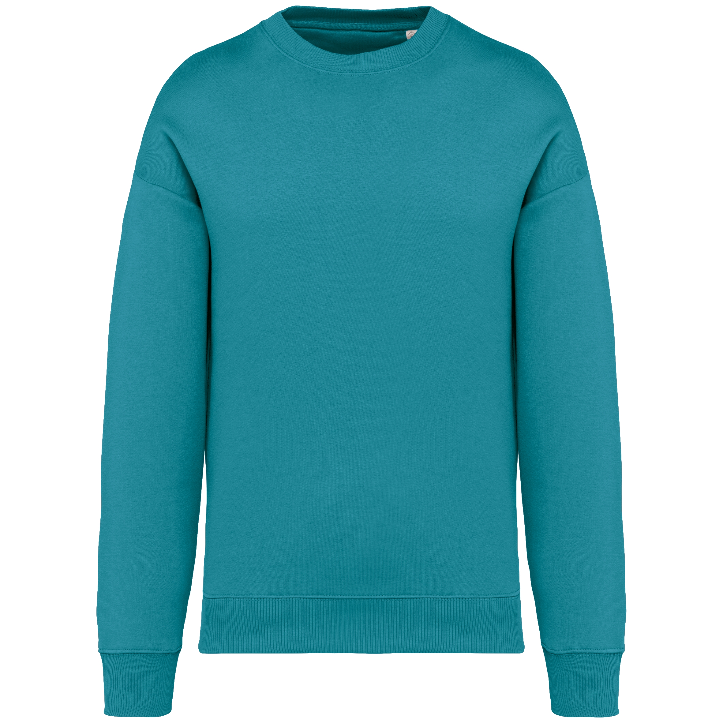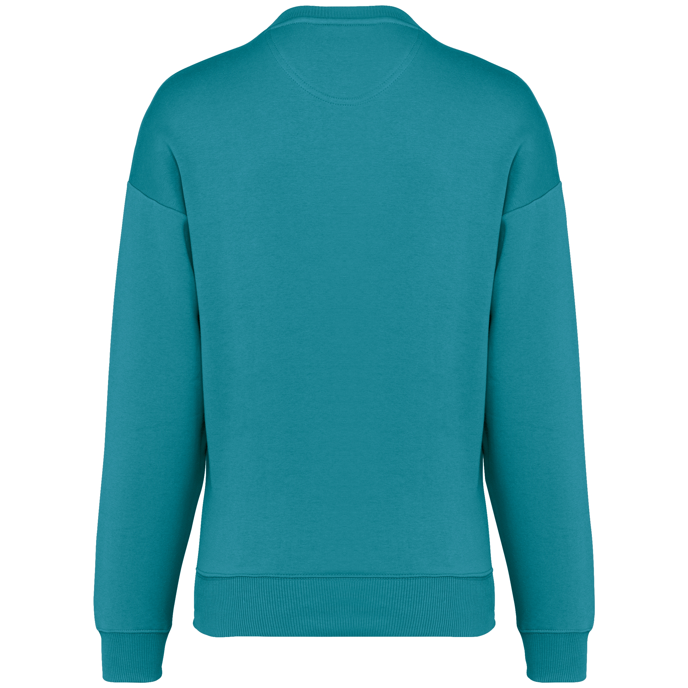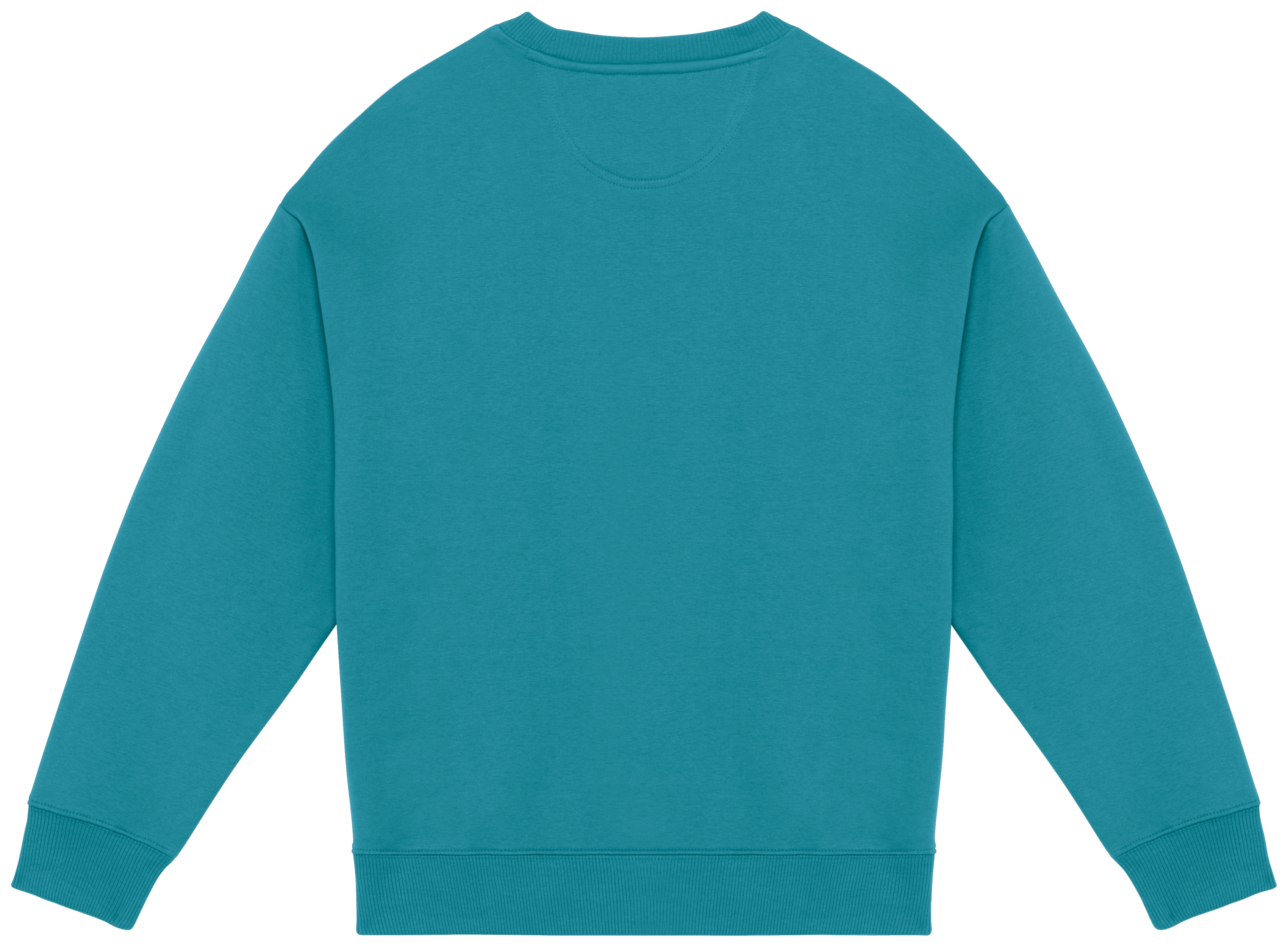 85 % biologisch katoen / 15 % post-consumer gerecycled polyester. Gekamd en ringgesponnen katoen. Enzymgewassen. Oversized model met afhangende schouders. Geborsteld fleece 3 draden LSF (Low Shrinkage Fleece). Halvemaan op de achterkant 2 x 1 ribboord aan de kraag, de zoom en de mouwboorden. Dubbel stiksel aan weerszijden van de kraag, op de mouwboorden en de zoom. Toon op toon nektape met kepermotief in de halsopening.