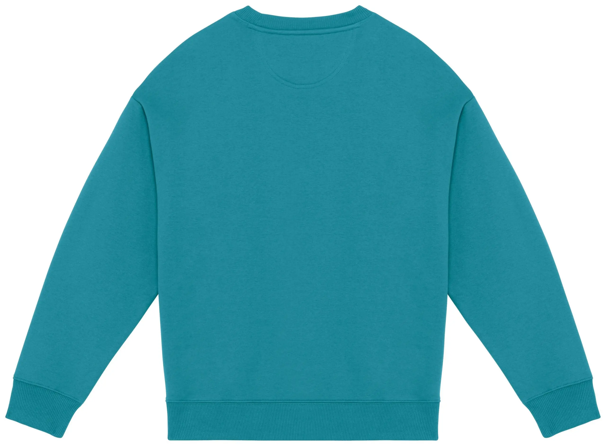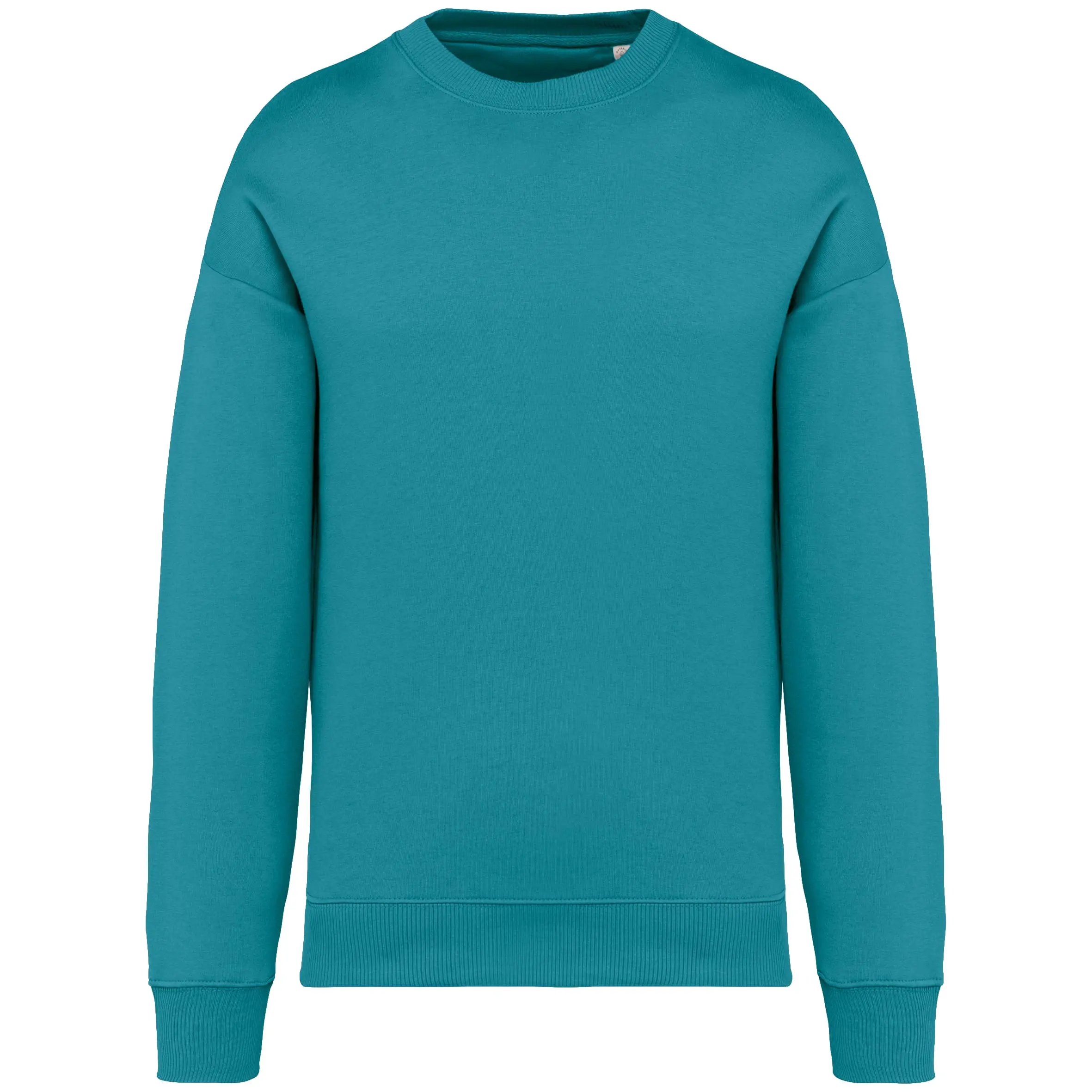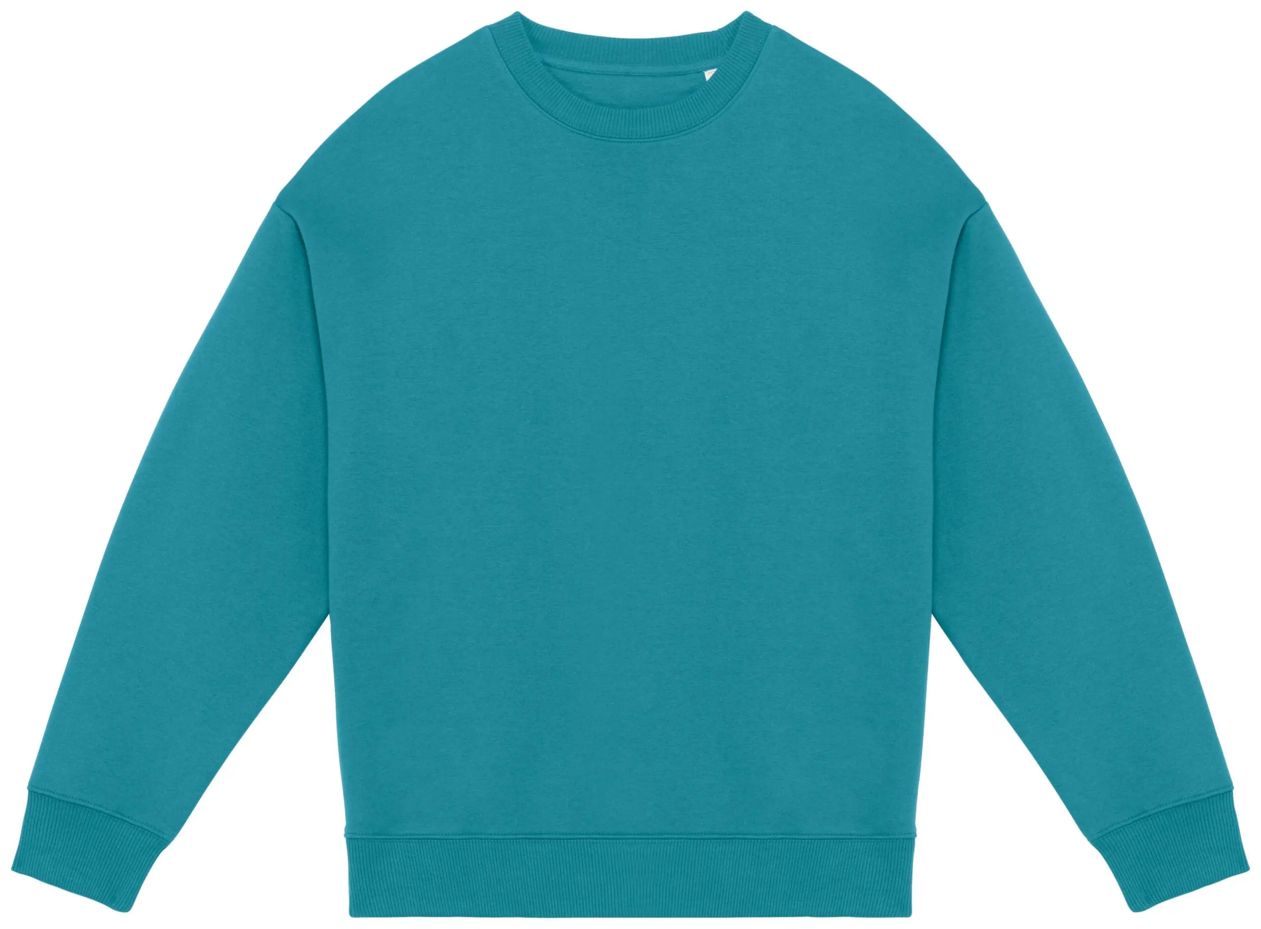 85 % biologisch katoen / 15 % post-consumer gerecycled polyester. Gekamd en ringgesponnen katoen. Enzymgewassen. Oversized model met afhangende schouders. Geborsteld fleece 3 draden LSF (Low Shrinkage Fleece). Halvemaan op de achterkant 2 x 1 ribboord aan de kraag, de zoom en de mouwboorden. Dubbel stiksel aan weerszijden van de kraag, op de mouwboorden en de zoom. Toon op toon nektape met kepermotief in de halsopening.