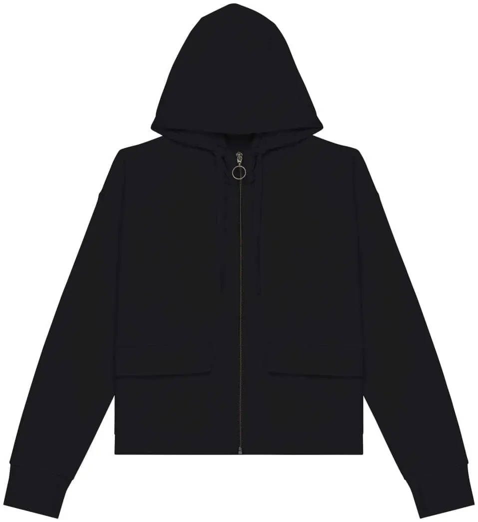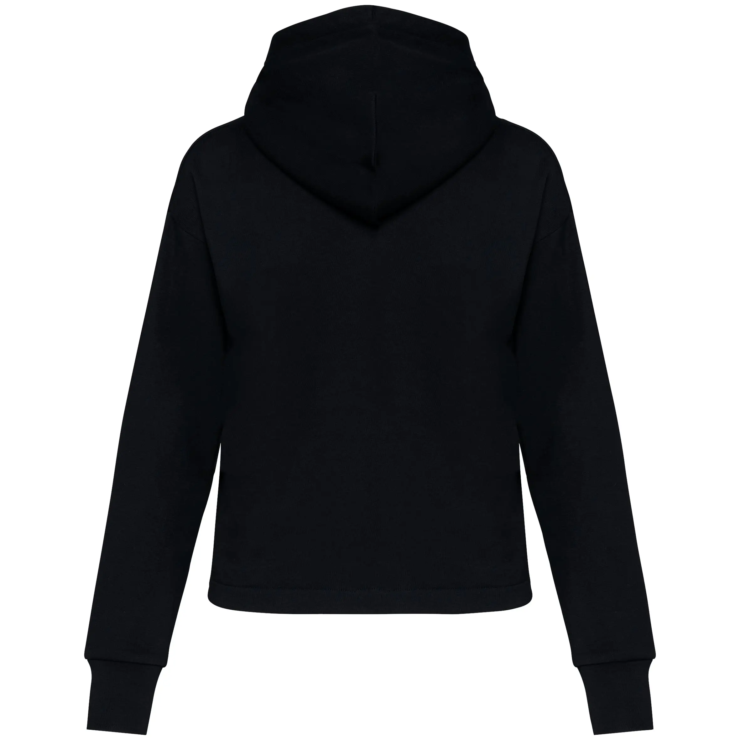 85 % biokatoen / 15 % post-consumer gerecycled polyester. Gekamd katoen. Ruime snit en afhangende schouders. Binnenkant van fleece met 3 LST-garens (Low Shrinkage Terry). Halvemaan op de achterkant. Enzymwas. Rits van gerecycled metaal met afgeronde ritstrekker. Twee opgezette zakken met klep aan de voorkant. Knijpcapuchon gevoerd in de hoofdstof. Platte aanrijgkoordjes van biokatoen. Nektape met kepermotief in de halsopening. Mouwuiteinden afgewerkt met 1 x 1 ribboord. Onderkant afgewerkt met een enkel gestikte zoom. Binnenafwerking van de rits met biesje in jersey.