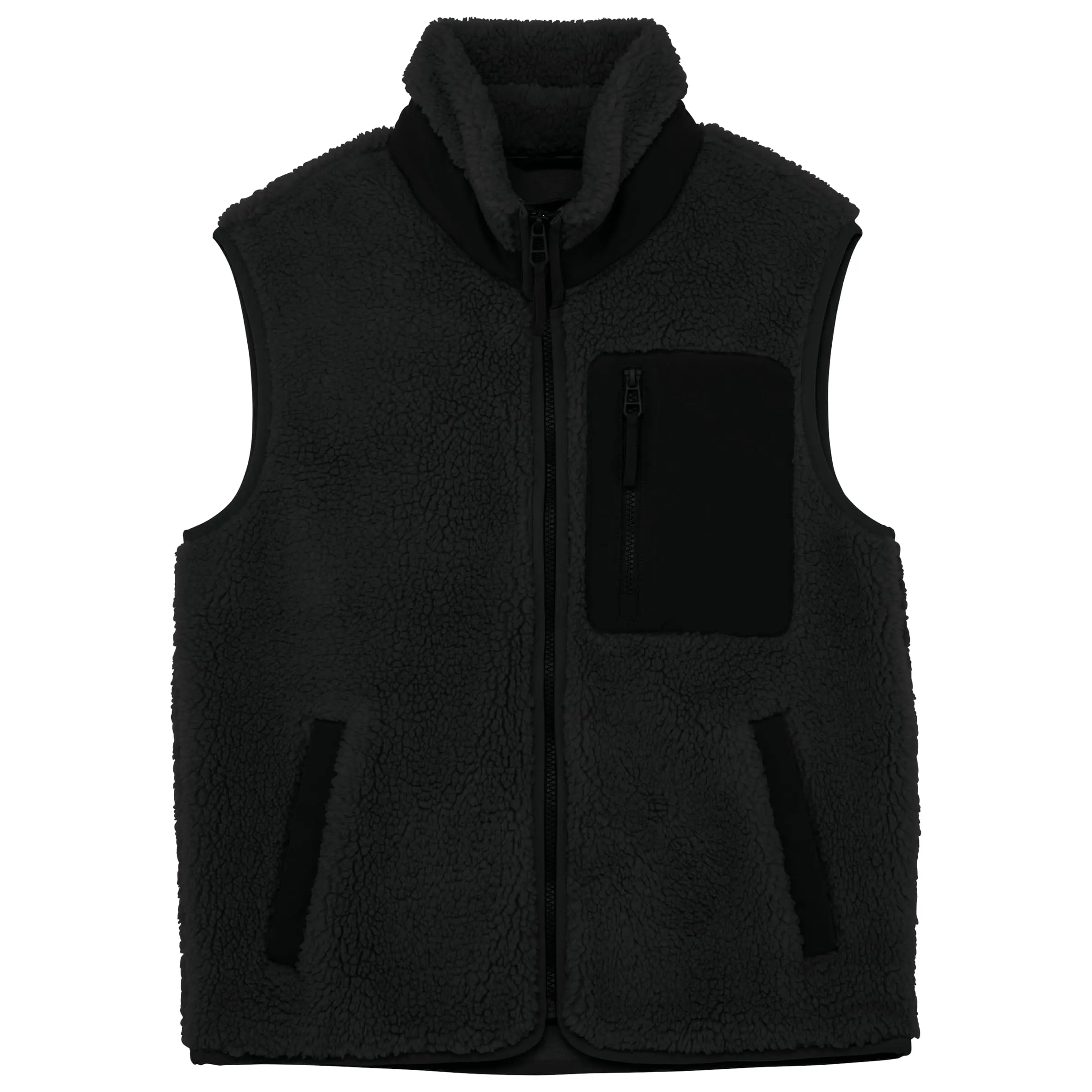 100% post-consumer gerecycled polyester. Dubbelzijdige sherpa-stof met ton-sur-ton fleece aan de binnenkant. Borstzak op hartzijde en paspelzak op zijkant in contrasterend ripstop materiaal op kleur Wet Sand/Driftwood en ton sur ton op kleur Black. Bi-materiaal kraag. Ritssluiting van gerecycled plastic met ritstrekker bij opening middenvoor en borstzak. Elastische biesje middenvoor, armsgaten en contrasterende zoom op Wet Sand/Driftwood en ton sur ton op Black. Binnenkraag van sherpa-materiaal en ophanglus middenachter. Ton sur ton jersey voering aan de binnenkant van de kraag.