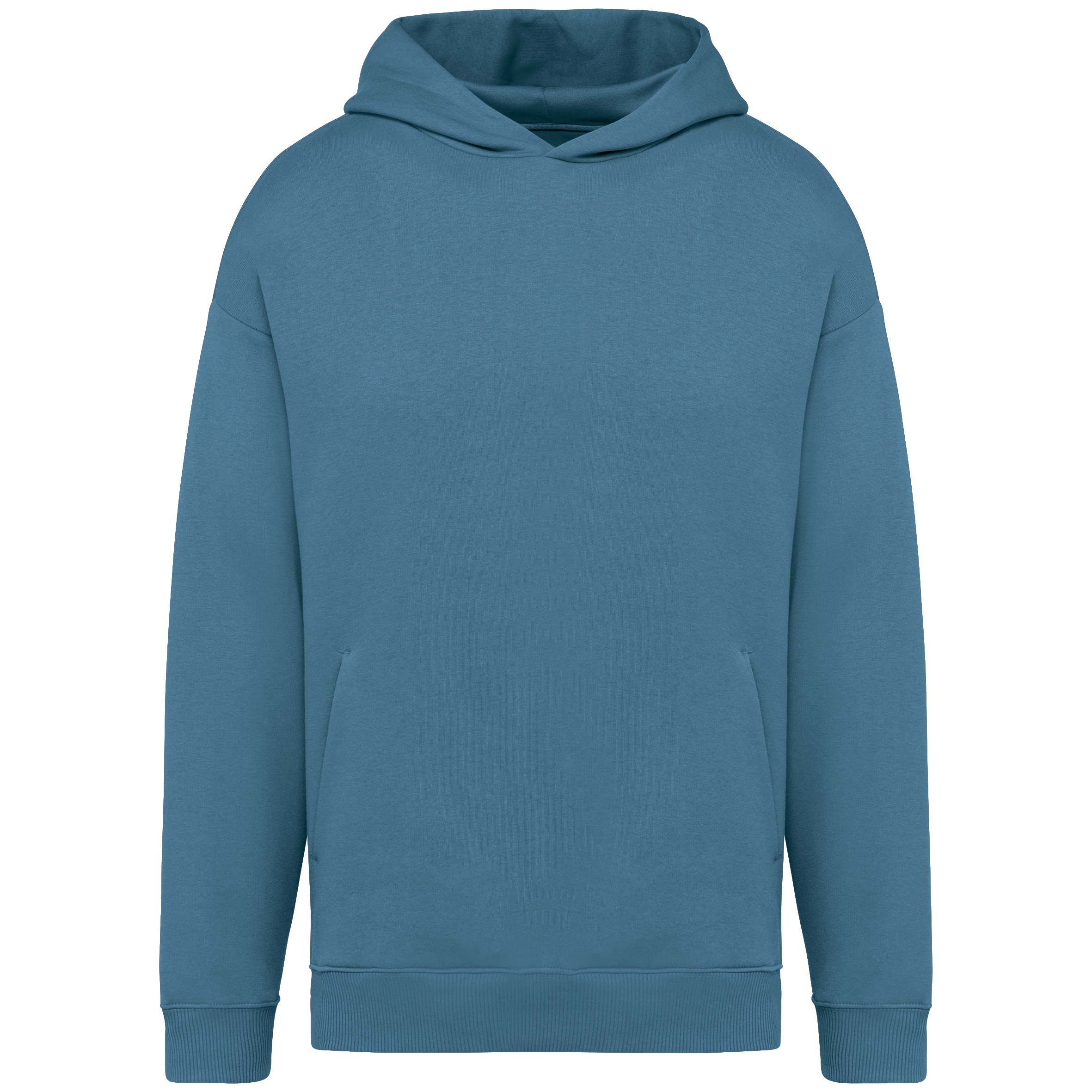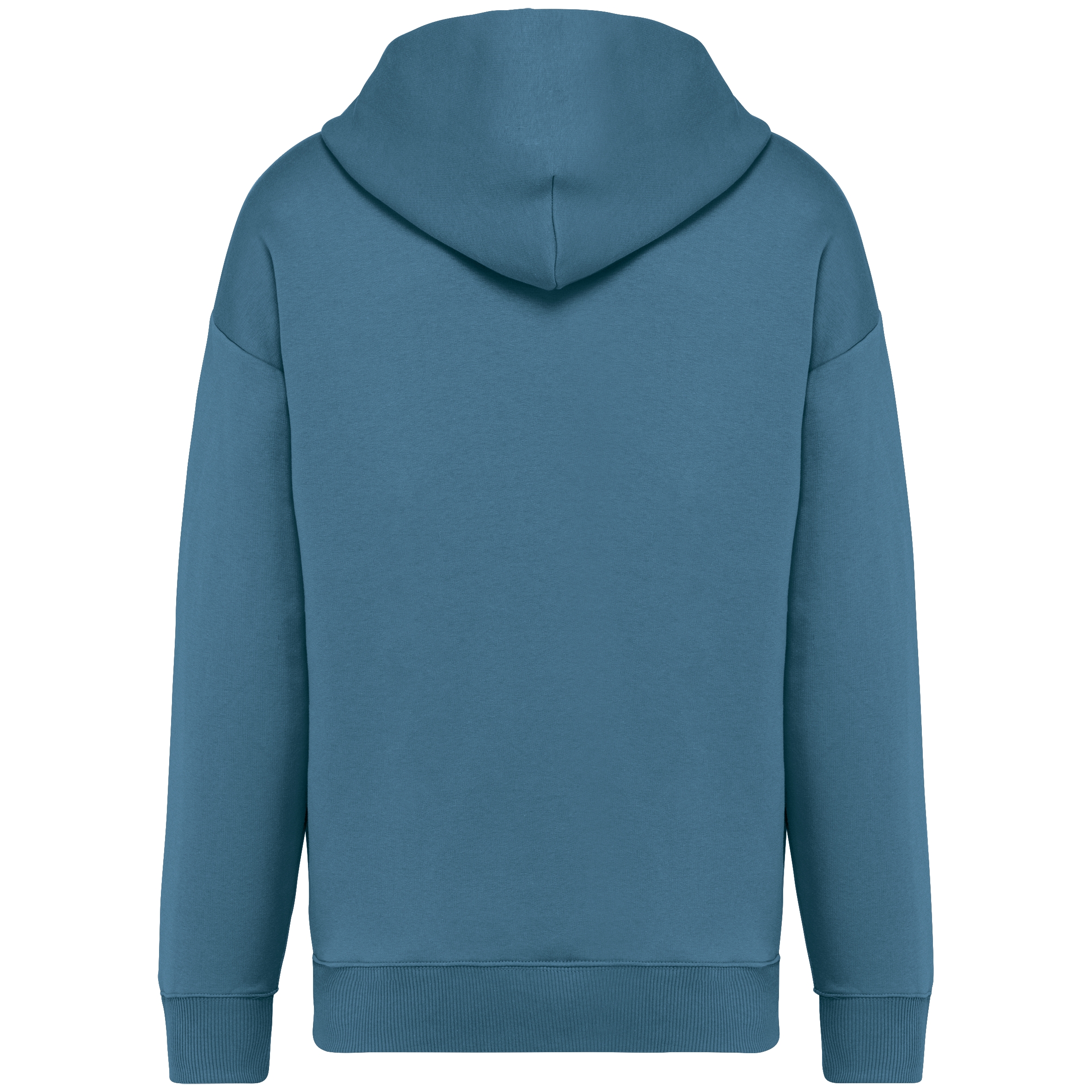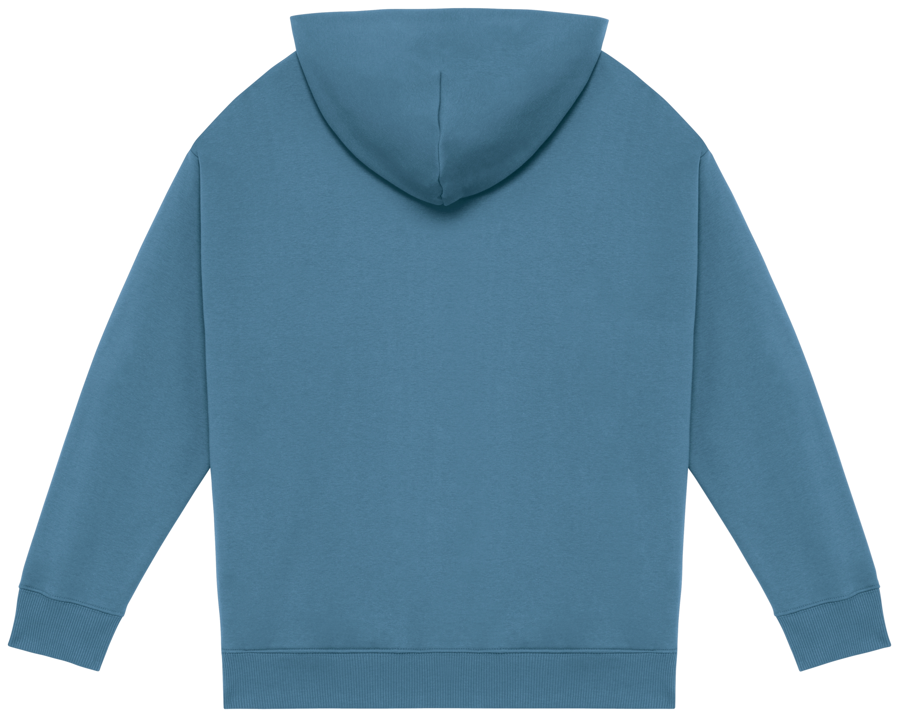 85 % biologisch katoen / 15 % post-consumer gerecycled polyester. Gekamd en ringgesponnen katoen. Oversized model met afhangende shouders. Enzymgewassen. Geborsteld fleece 3 draden LSF (Low Shrinkage Fleece). Halvemaan op de achterkant. Gevoerde capuchon in de hoofdstof. Minimalistische zijzakken. 2 x 1 ribboord aan de kraag, de zoom en de mouwboorden. Dubbel stiksel aan weerskanten van de kraag, de zoom en de mouwboorden. Halsopening met nektape met kepermotief aan de binnenkant.
