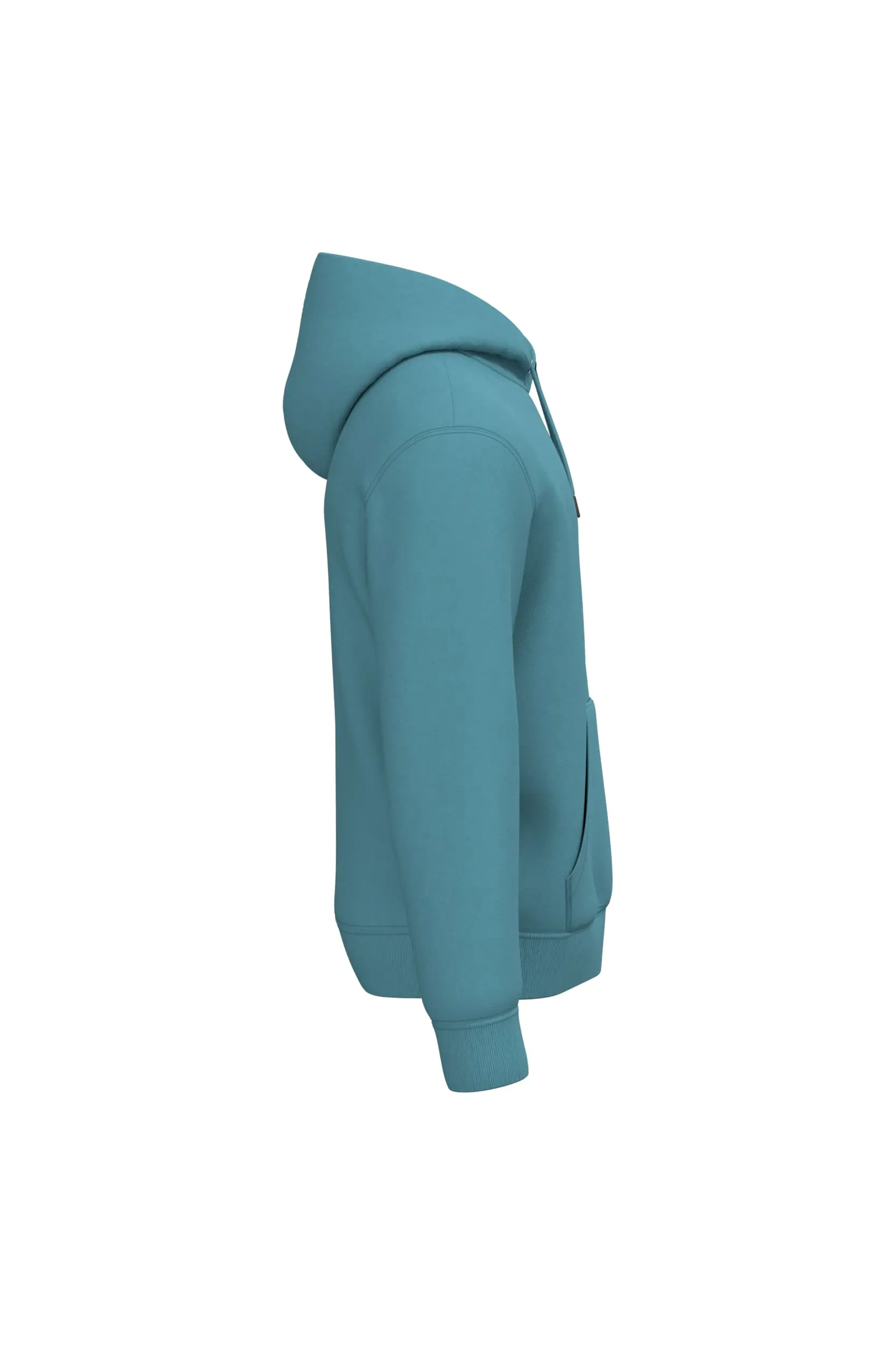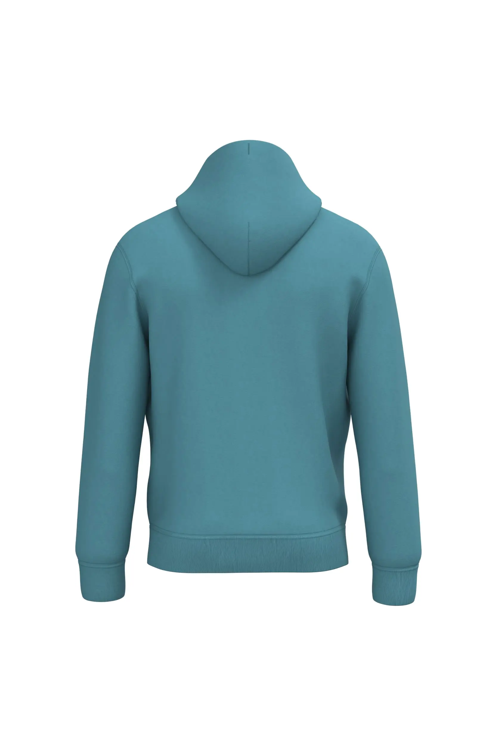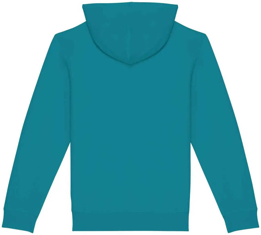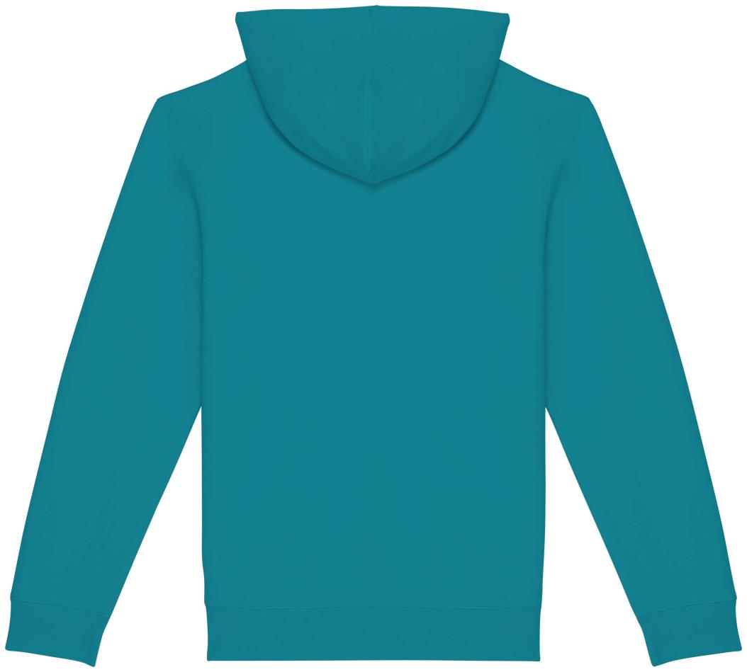 85 % biokatoen / 15 % post-consumer gerecycled polyester. Gekamd en ringgesponnen katoen. Fitted pasvorm. Enzymgewassen. LSF-geborsteld fleece LSF 3 draden (Low Shrinkage Fleece: voorgekrompen fleece). Halvemaan op de achterkant. Kangoeroezak. 1 x 1 ribboord aan de zoom en de mouwboorden. Dubbel stiksel aan de mouwboorden, de mouwinzetten de zoom en de halvemaan. Nektape op de binnenzijde achteraan. Gevoerde capuchon in de hoofdstof met koordstopper. Rond koord met uiteinden en oogjes van gerecycled metaal.