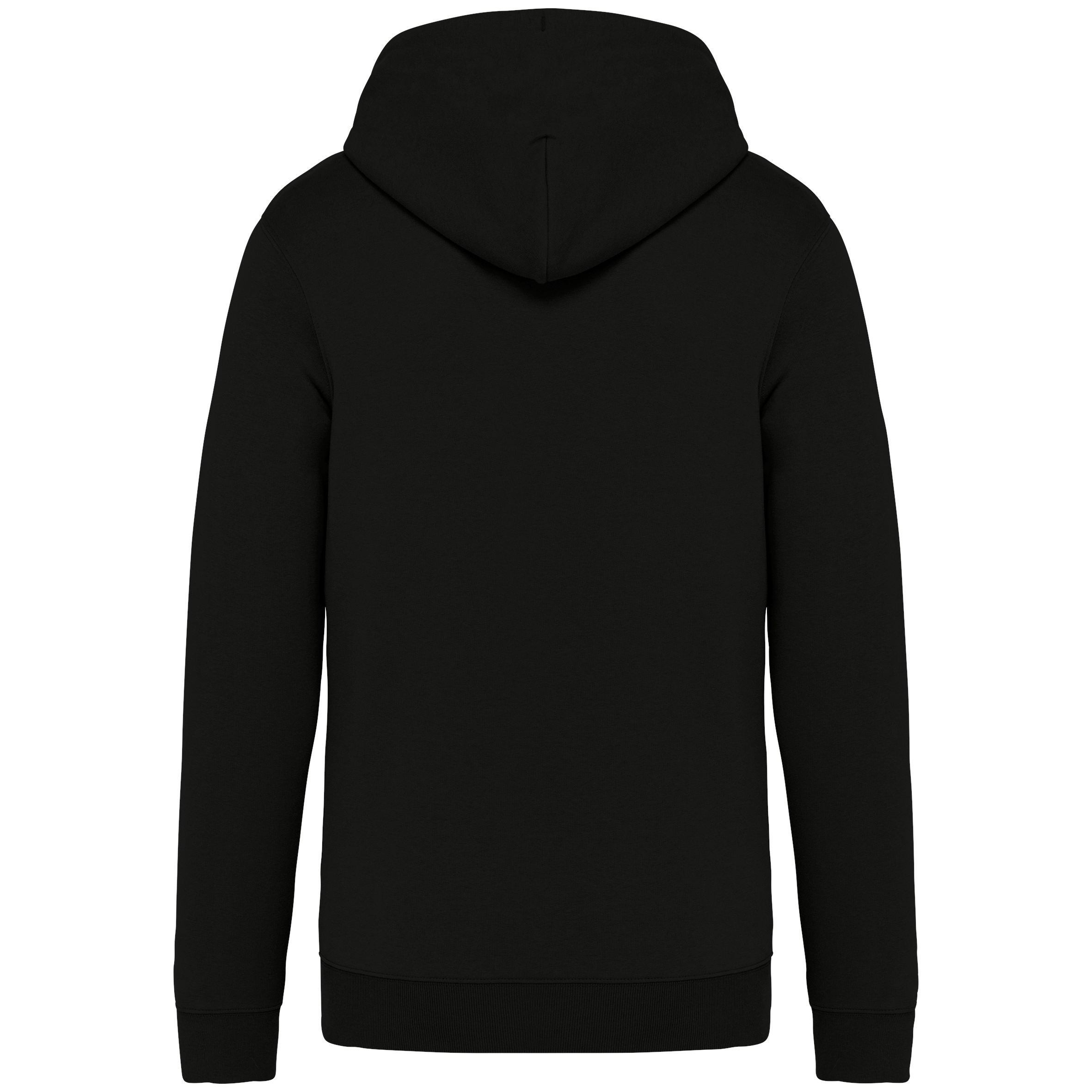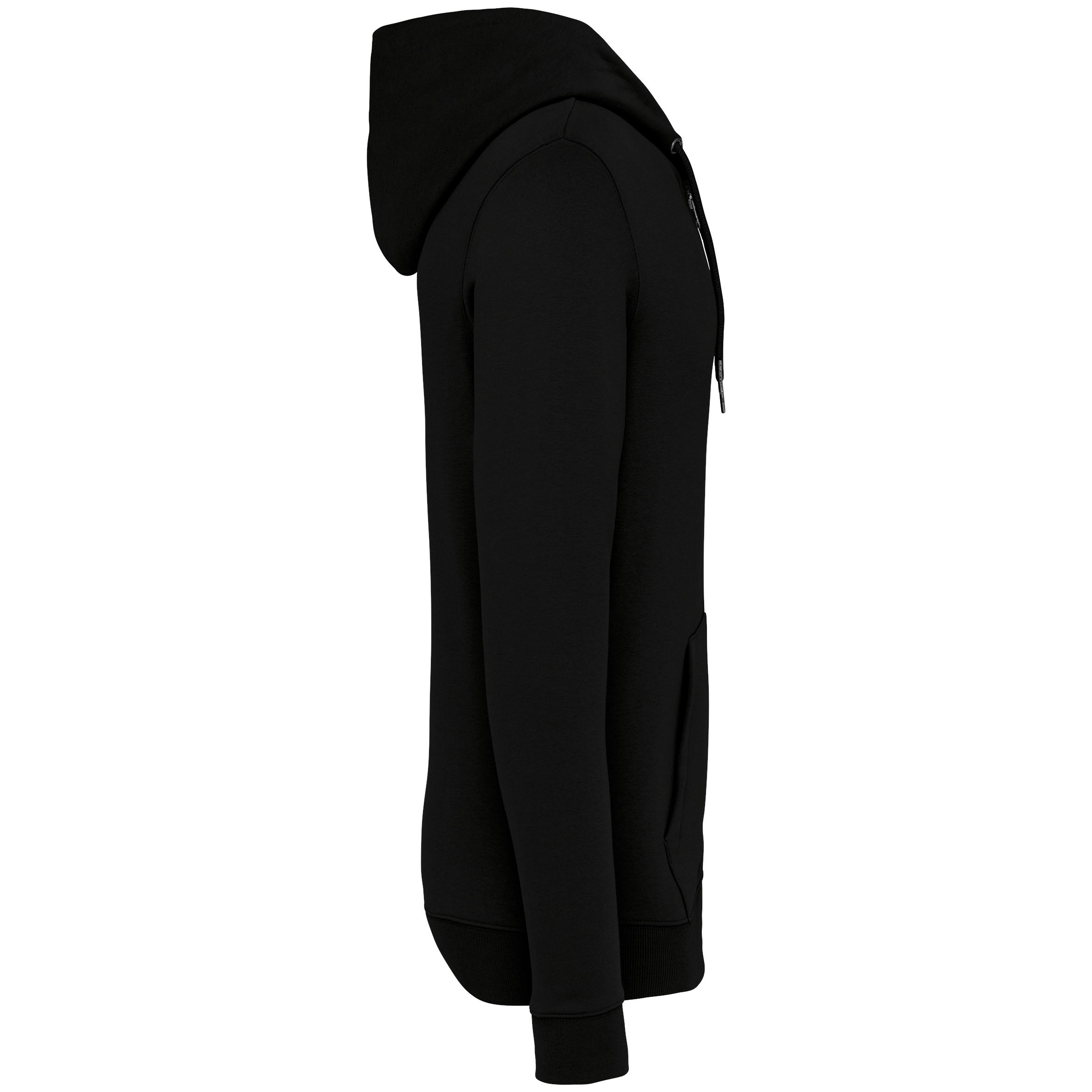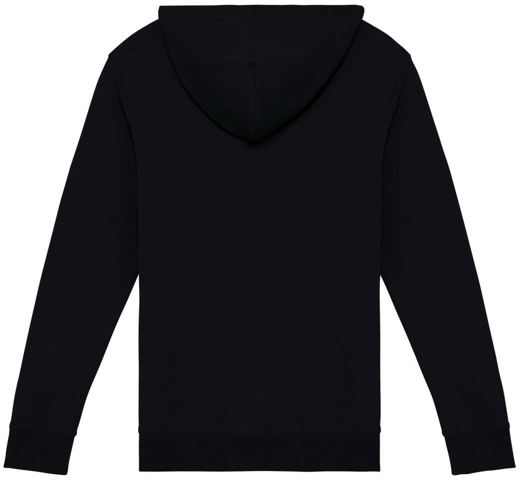 85 % biologisch katoen / 15 % post-consumer gerecycled polyester. Gekamd en ringgesponnen katoen. Fitted pasvorm. Enzymgewassen. Geborsteld fleece 3 draden LSF (Low Shrinkage Fleece). Metalen rits. Halvemaan op de achterkant. 2 kangoeroezakken. 1 x 1 ribboord aan de zoom en de mouwboorden. Dubbel stiksel aan de mouwboorden, de mouwinzetten en de zoom. Gevoerde capuchon in de hoofdstof. met koordstopper. Rond koord met uiteinden en oogjes van gerecycled metaal. Nektape met kepermotief aan de binnenkant.