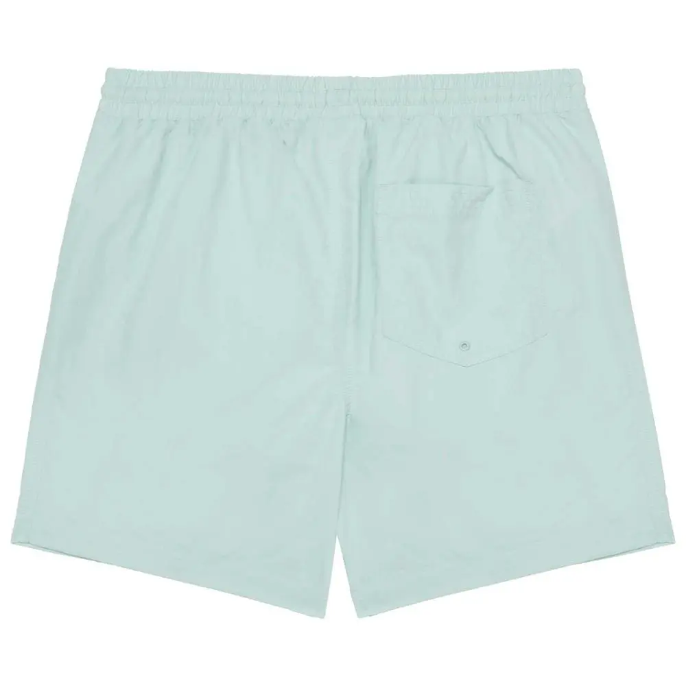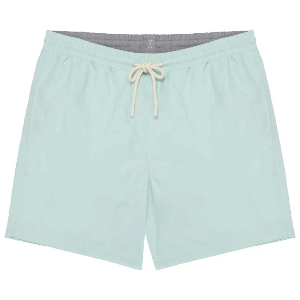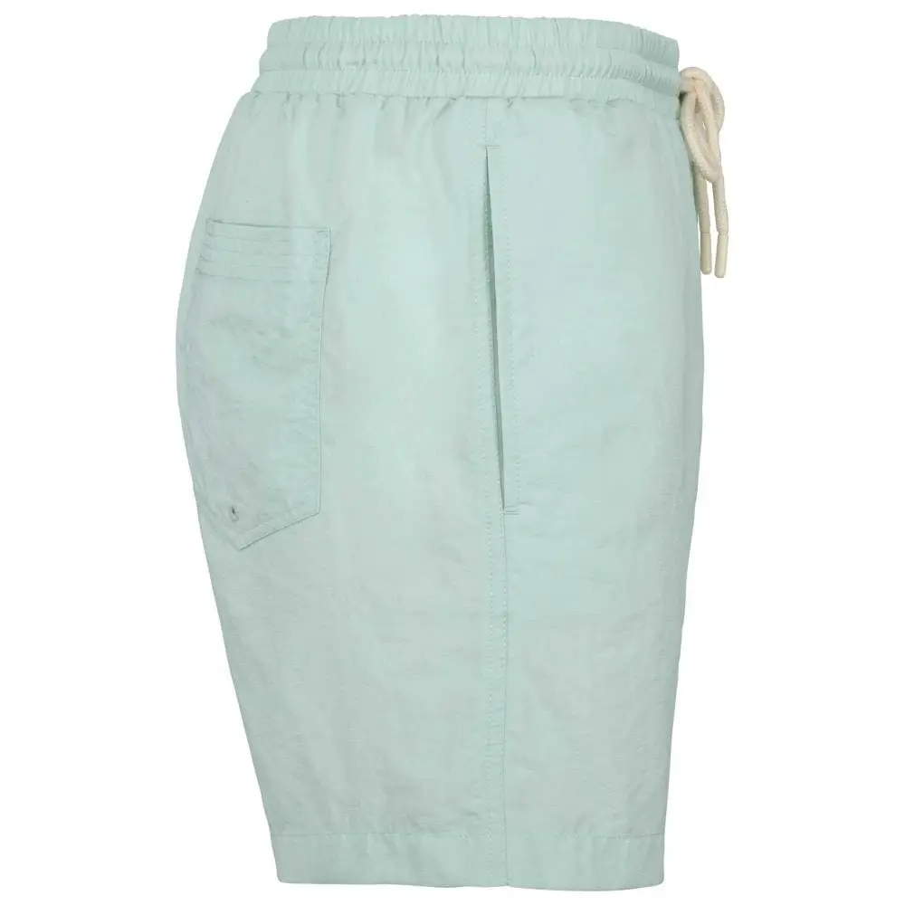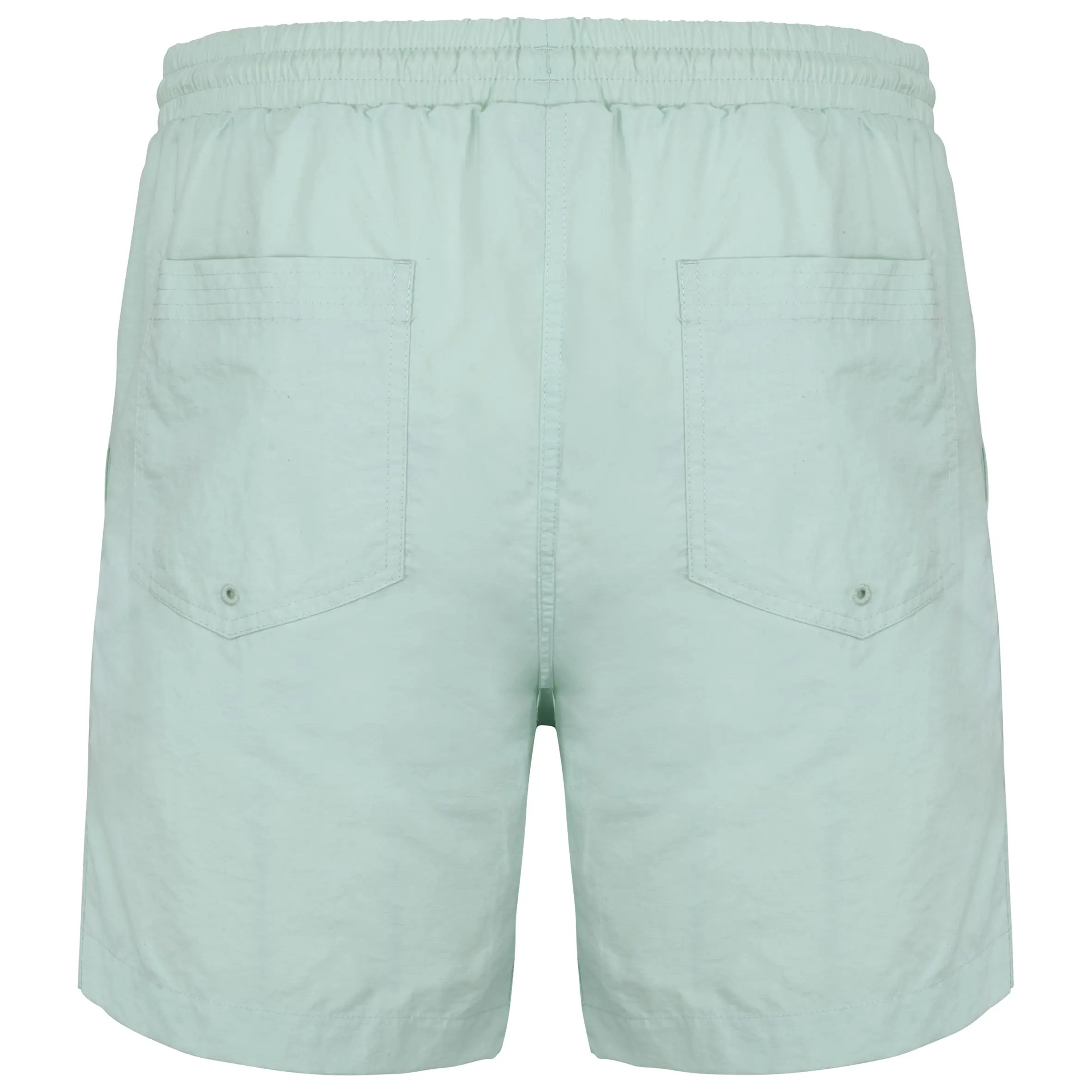 Buitenkant: 100% pre-consumer gerecycled polyamide. Binnenvoering van mesh: 100% post-consumer gerecycled polyester. Ripstop-stof. 2 zijzakken met stiksel. Dubbele stiksels op de zijkant, tussen de been, kruis voor en achter. Elastische tailleband met rond aanrijgkoordje van biologisch katoen en contrasterend uiteinde op alle kleuren. Contrasterende elastische binnenband op alle kleuren. Binnenslip van mesh, afgewerkt met een elastisch biesje. Opgezette achterzak met stiksels aan de opening van de zak en geborduurd verluchtingsgaatje. Versteviging tailleband midden achterkant om het aanrijgkoordje op zijn plaats te houden. Enkel stiksel op de zoom onderaan. Certificering in behandeling.