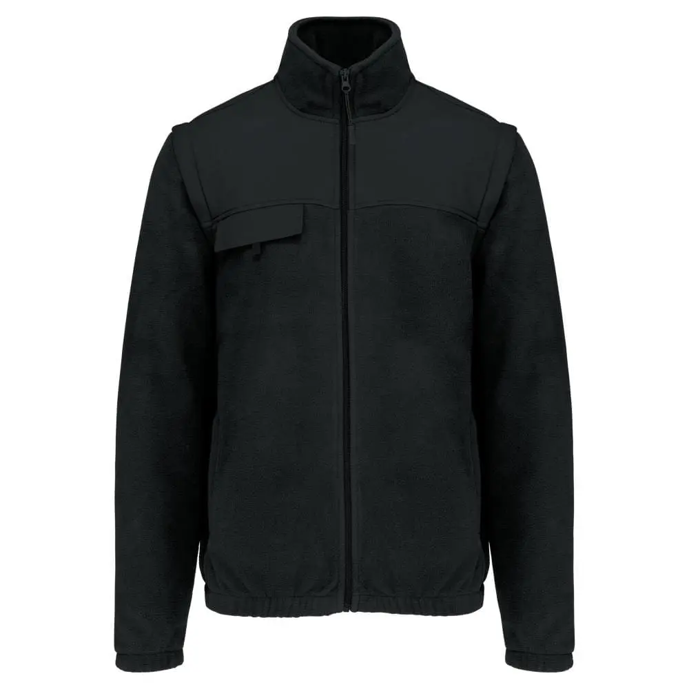 100% polyester. Buitenkant: fleece 100% polyester 400 g/m². Versteviging 100% polyester taslon met acrylcoating. Voering binnenkant mouwen polyester 210T. 2-in-1-fleecejas. 2 ritszakken aan de voorkant en 1 borstzak met klep en klittenband. Toon op toon inzetstukken aan de voor- en achterkant en onderarmen. Eenvoudige personalisatie voor- en achteraan. Afneembare mouwen met voering van polyester, voor meer comfort. Elastische mouw- en jasboorden. Gecertificeerd STANDARD 100 by OEKO-TEX®N° CQ 1007/8, IFTH.