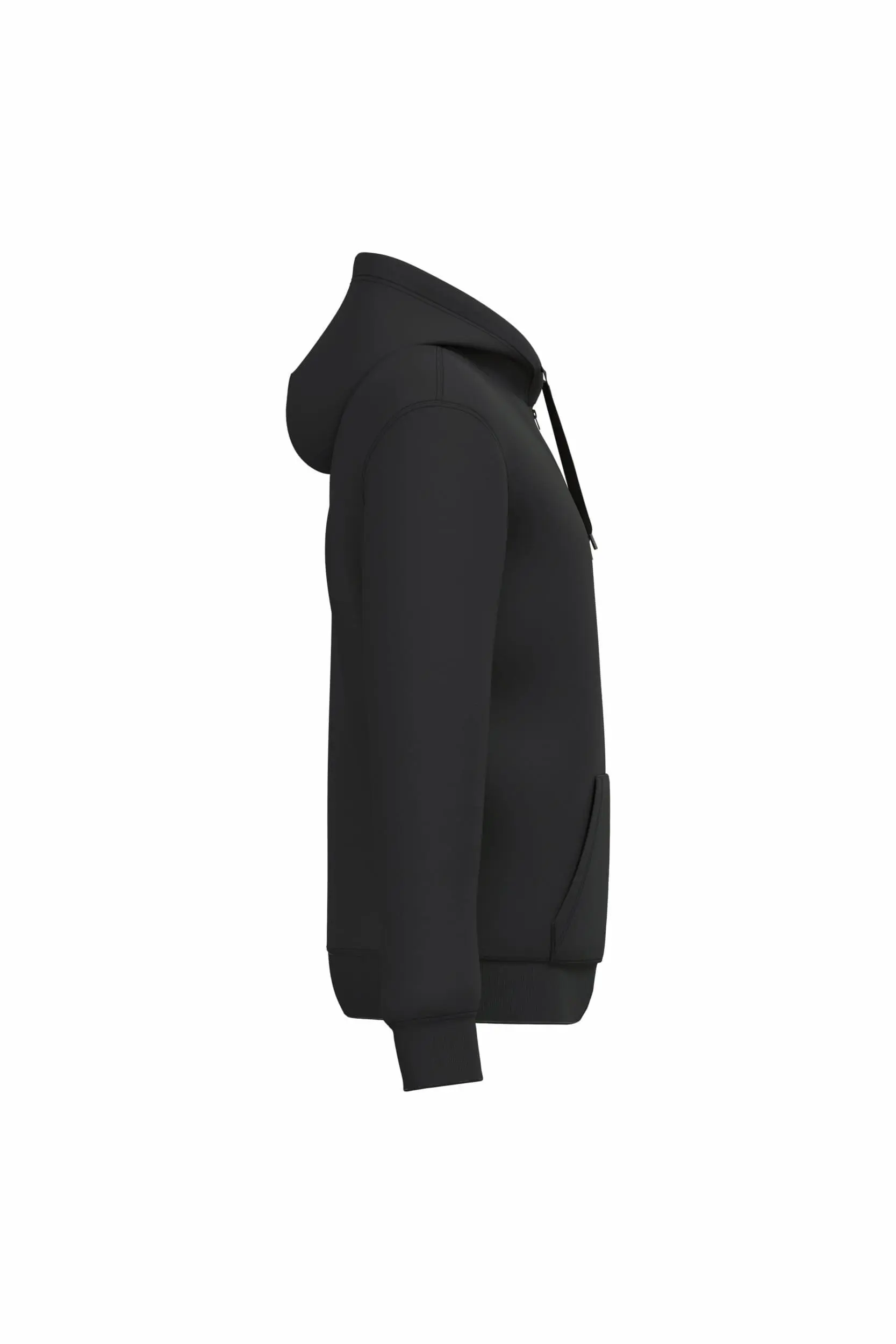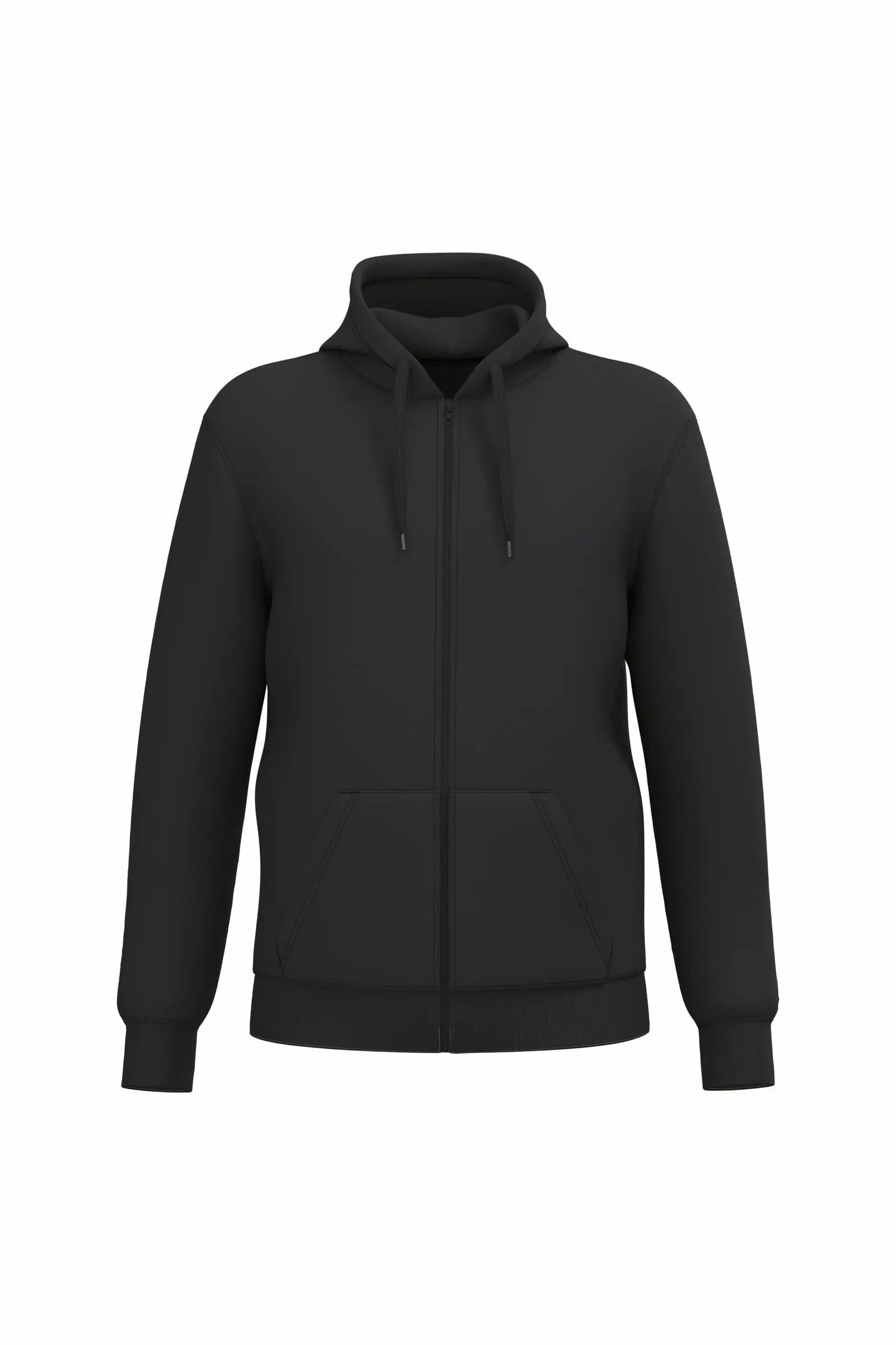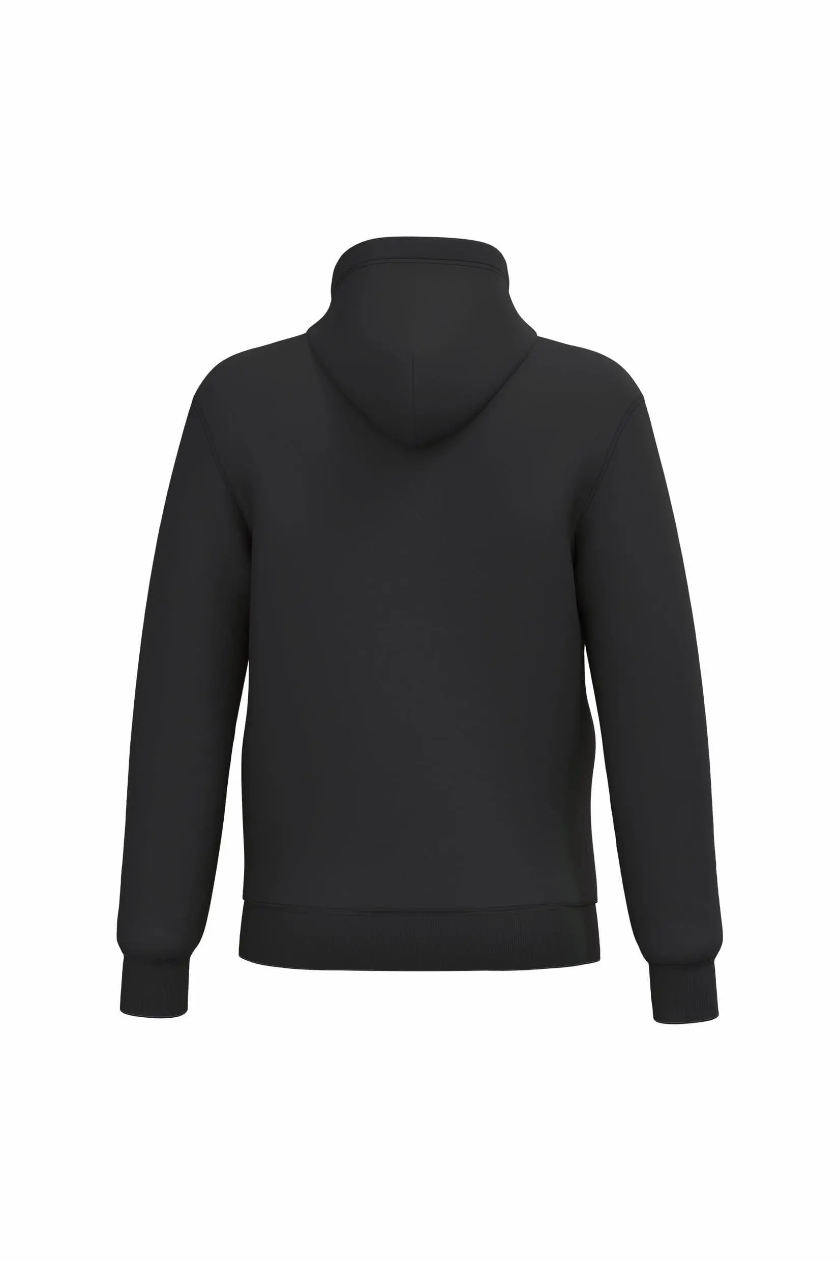 50% ringgesponnen katoen / 50% gerecycled polyester post-consumer. Geborsteld fleece aan de binnenkant. Straight snit. Cut-and-sew-techniek. 2×1 ribboord in buisconstructie voor een betere afwerking aan de hals, de mouwuiteinden en de onderkant. Kangoeroezak. Ritssluiting in nylon. Gevoerde capuchon in jersey-polykatoen met platte aanrijgkoordjes. Toon-op-toon nektape in jersey in de kraag. Geen merklabel in de kraag, maar enkel een maatlabel voor eenvoudige personalisatie.