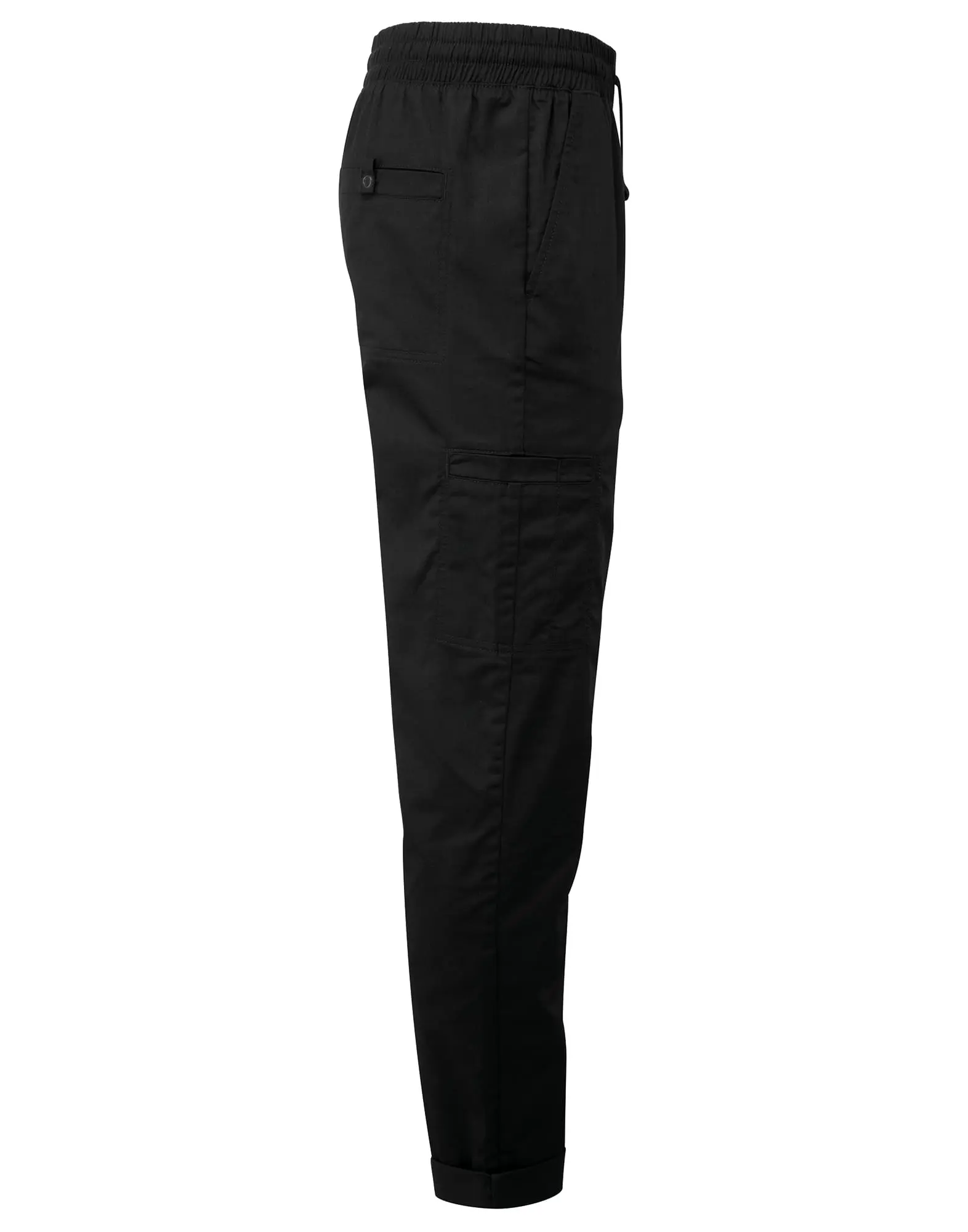 65% gerecycled polyester / 35% katoen. Elastische tailleband met trekkoord. Gulp met nepnaad. Taps toelopende broekspijp met opgerolde zomen.