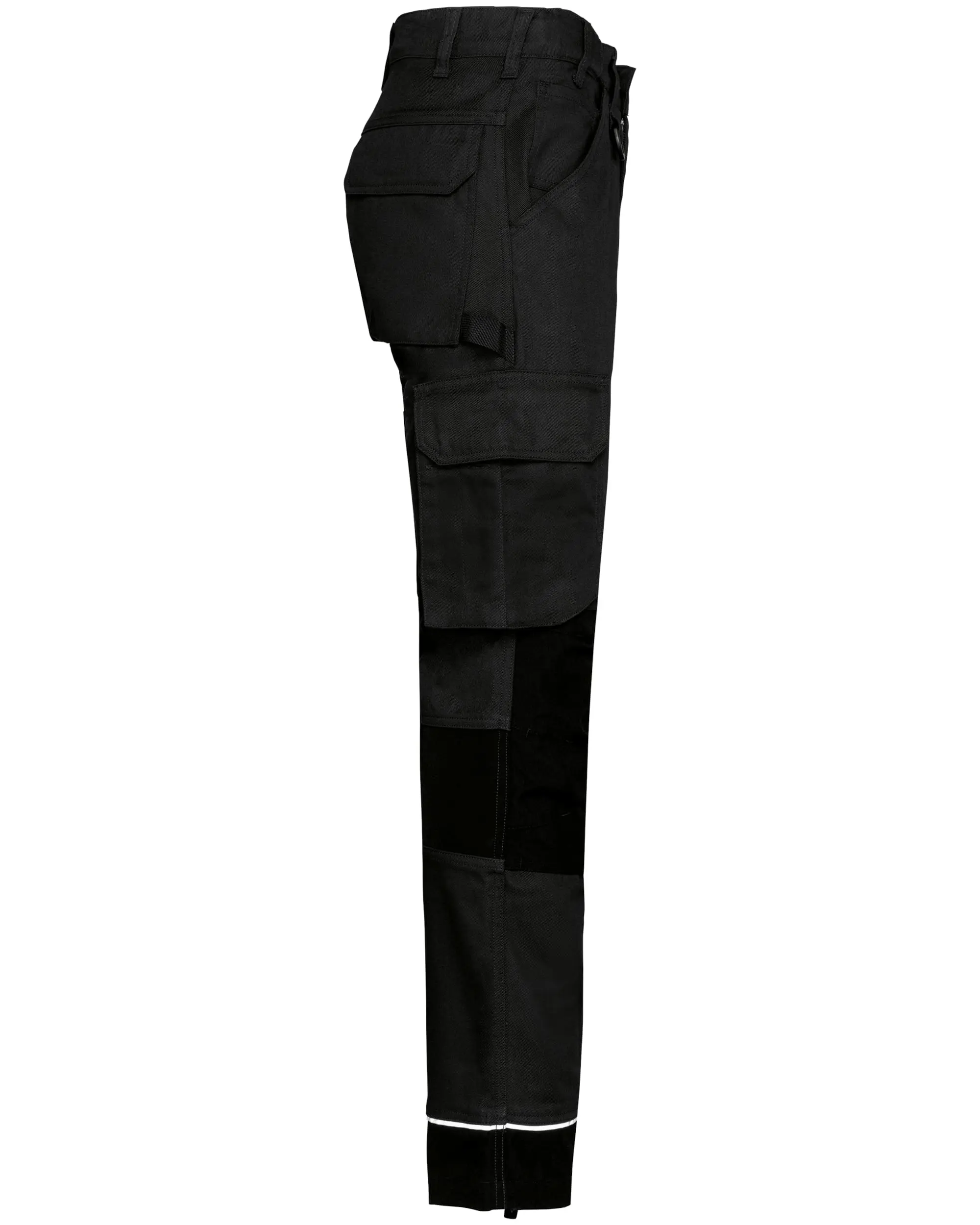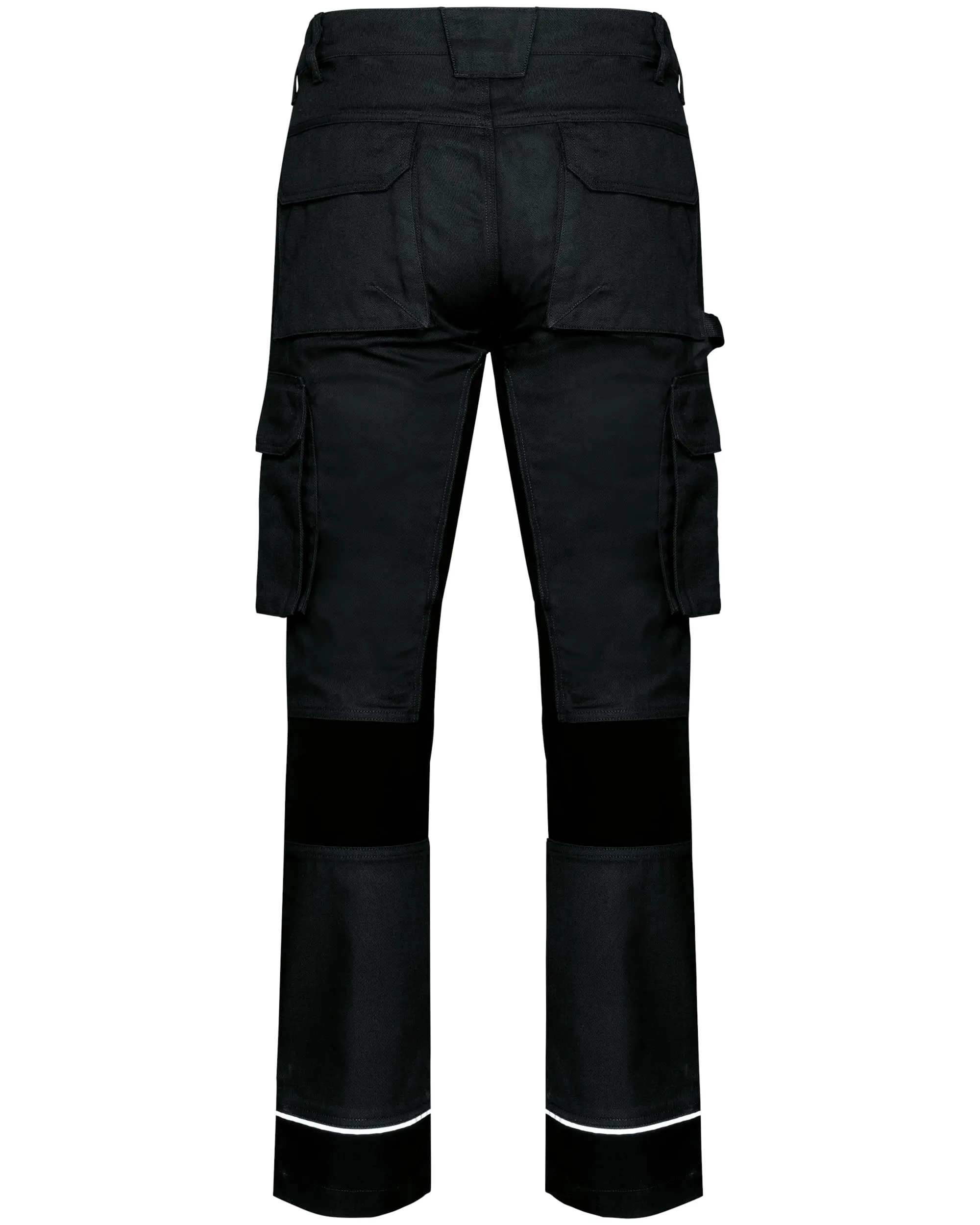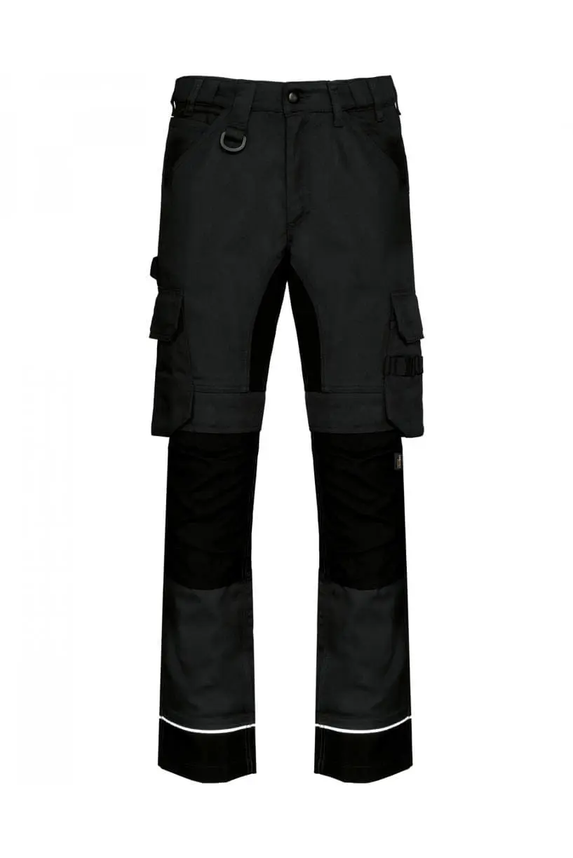 60% katoen / 40% gerecycleerd polyester. Wasbaar op 60 °C. Rechte snit. 2 zakken aan de voorkant (binnenzakken in de hoofdstof), waarvan 1 met ticketzak. 2 losse cargozakken met ruimteplooi en klep met klittenbandsluiting, waarvan één met 2 vakken en plaats voor gereedschap. Pennenzakje rechts (bij het dragen). 2 achterzakken met ruimteplooi en klep met klittenbandsluiting. Hamerlus links (bij het dragen). Schuimrubber in een zak op de knie in contrasterend Cordura (zwart voor alle kleuren). Rekbaar en contrasterend (behalve voor zwart) inzetsel tussen de benen en achteraan de knieën, voor extra stevigheid en bewegingsvrijheid. Inzetsel onderaan de broekspijpen in Cordura®, met silver biesje en een verstelbare zoom van 5 cm. Drievoudig stiksel in het kruis voor- en achteraan. Dubbel stiksel opzij en tussen de benen. Riem met plastic gesp + lussen die verstelbaar zijn dankzij een elastiek. Brede lus op de achterkant van de tailleband. Ritssluiting met knoop (metalen knoop bekleed met plastic). Afneembaar merklabel.