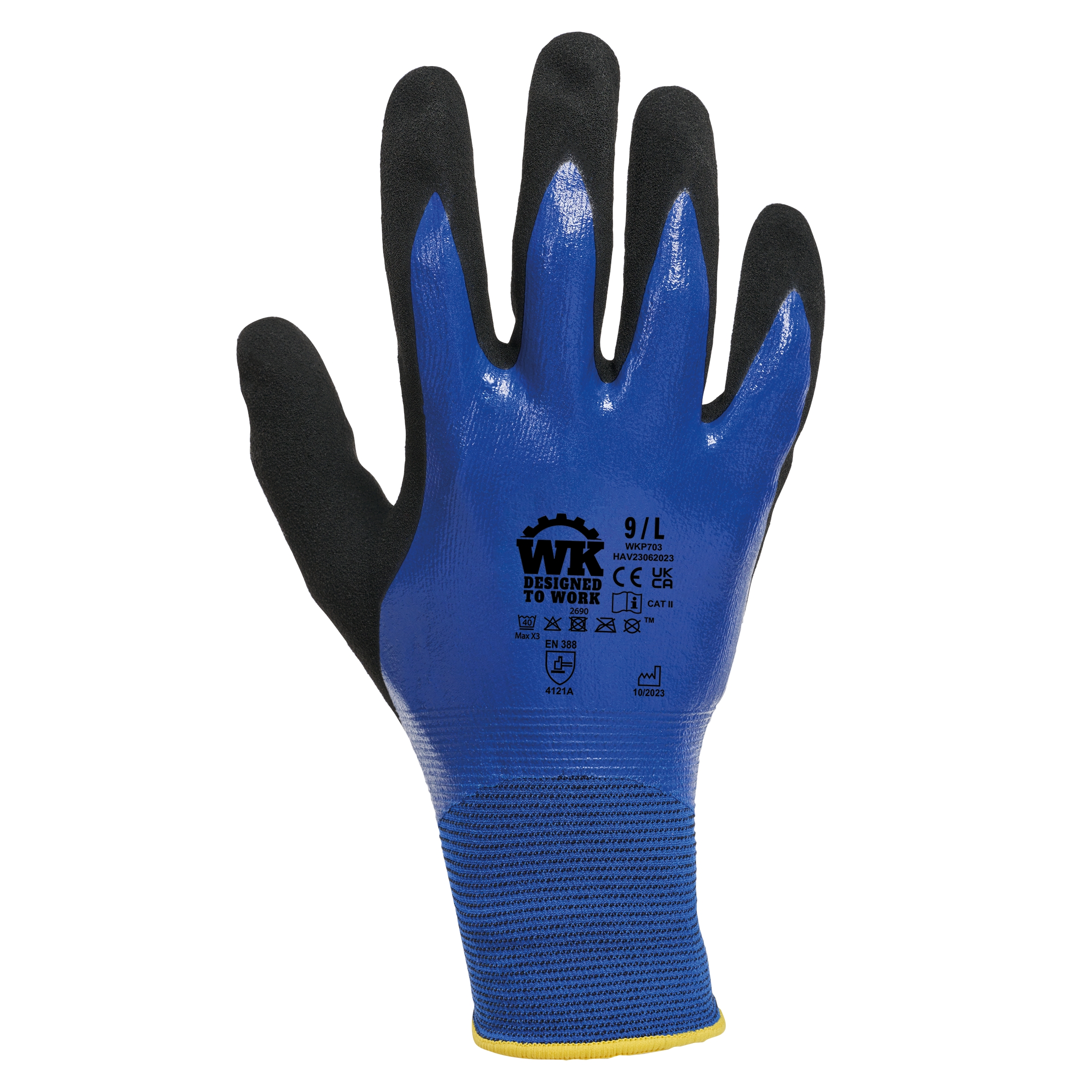 Gebreid in polyamide en elastaan. Gauge 18. Coating van glad nitril op de bovenkant van de handschoen en coating van ruw nitril op handpalm en vingers. Elastische polsboord met elastisch overlockstiksel in een kleur die varieert naargelang de handschoenmaat. Wasbaar op 40 °C op een programma voor fijne was. PBM Klasse II. Normen NF EN ISO 20420:2020 + NF EN ISO 21420/A1:2024 (Beschermende handschoenen – Algemene eisen en testmethodes), NF EN 388+A1:2018 (Beschermende handschoenen tegen mechanische risico’s): prestatieniveaus 4121A. Gewicht van een paar handschoenen in maat 10: 84 g
