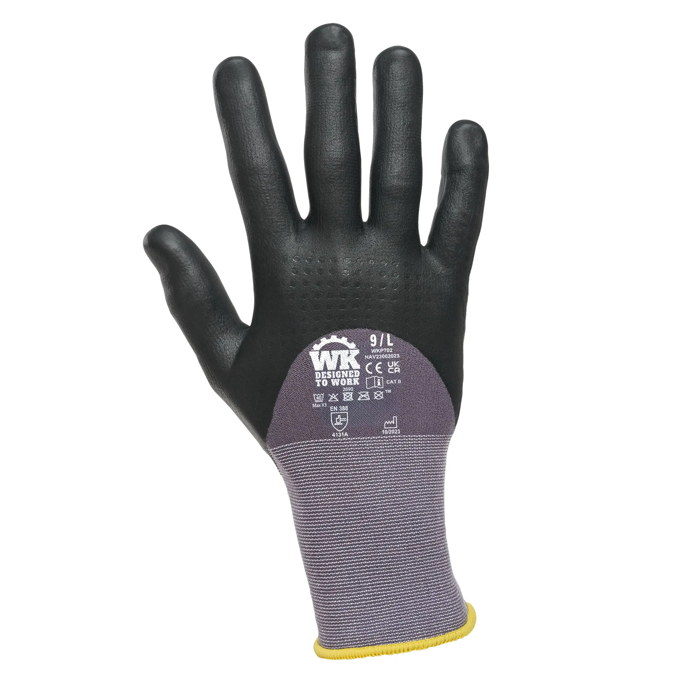 Gebreid in polyamide en elastaan. Gauge 15. Coating van micro-nitrilschuim op handpalm,, vingers en 3/4 van de rug van de hand. Noppen in nitril op de handpalm en de binnenkant van de vingers. Elastische polsboord met elastisch overlockstiksel in een kleur die varieert naargelang de handschoenmaat. Wasbaar op 40 °C op een programma voor fijne was. PBM Klasse II. Normen NF EN ISO 20420:2020 + NF EN ISO 21420/A1:2024 (Beschermende handschoenen – Algemene eisen en testmethodes), NF EN 388+A1:2018 (Beschermende handschoenen tegen mechanische risico’s): prestatieniveaus 4131A. Gewicht van een paar handschoenen in maat 10: 48 g