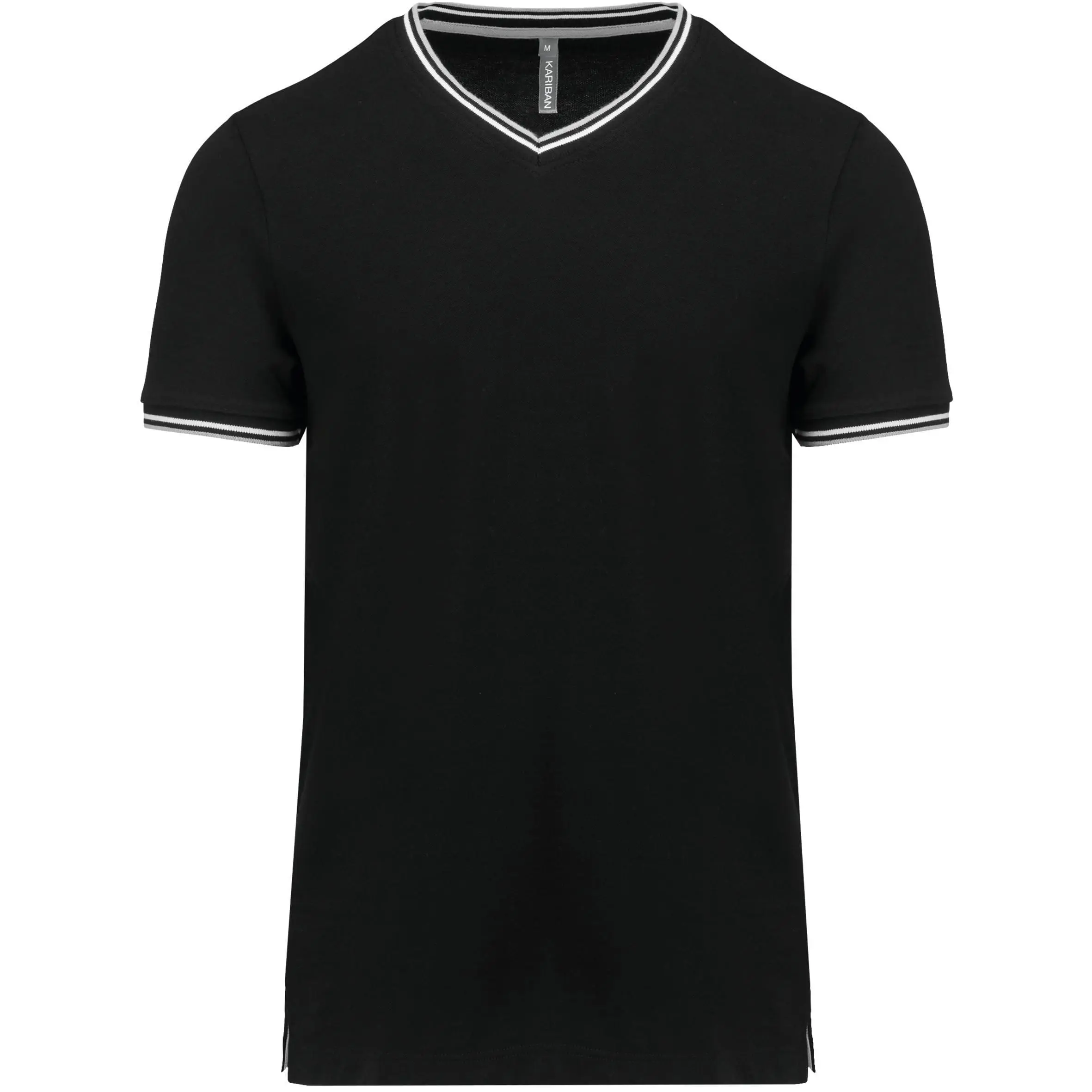 – Ribboord met contrasterende strepen aan kraag en mouwuiteinden.