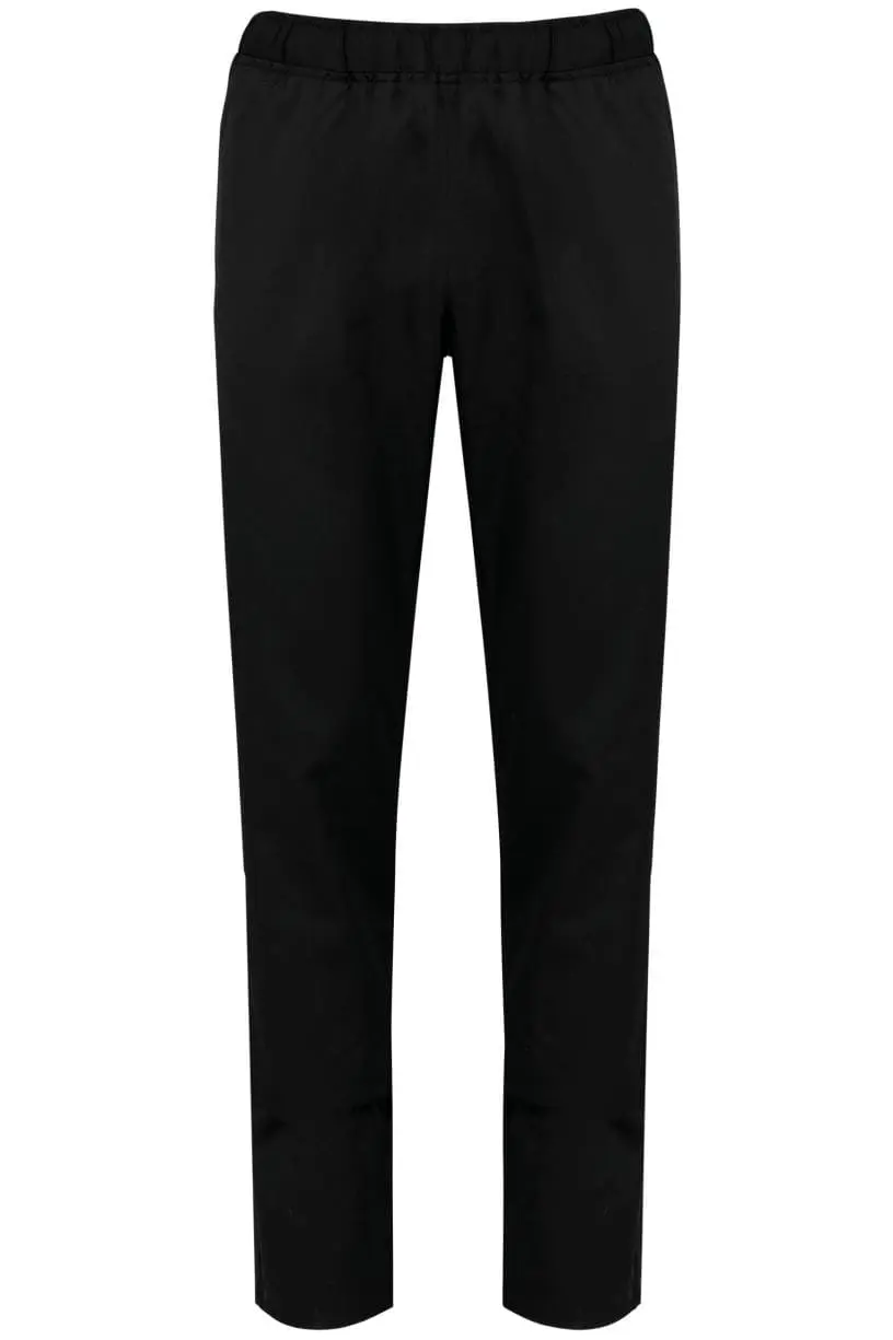65% polyester / 35% katoen. Twillstof. Norm ISO 15797 Industrieel wassen 75 °C (20 wasbeurten). 2 Italiaanse zijzakken + 1 opgezette achterzak met verstevigingen. Elastische tailleband met aanrijgkoordjes aan de binnenkant. Tear-away merklabel.