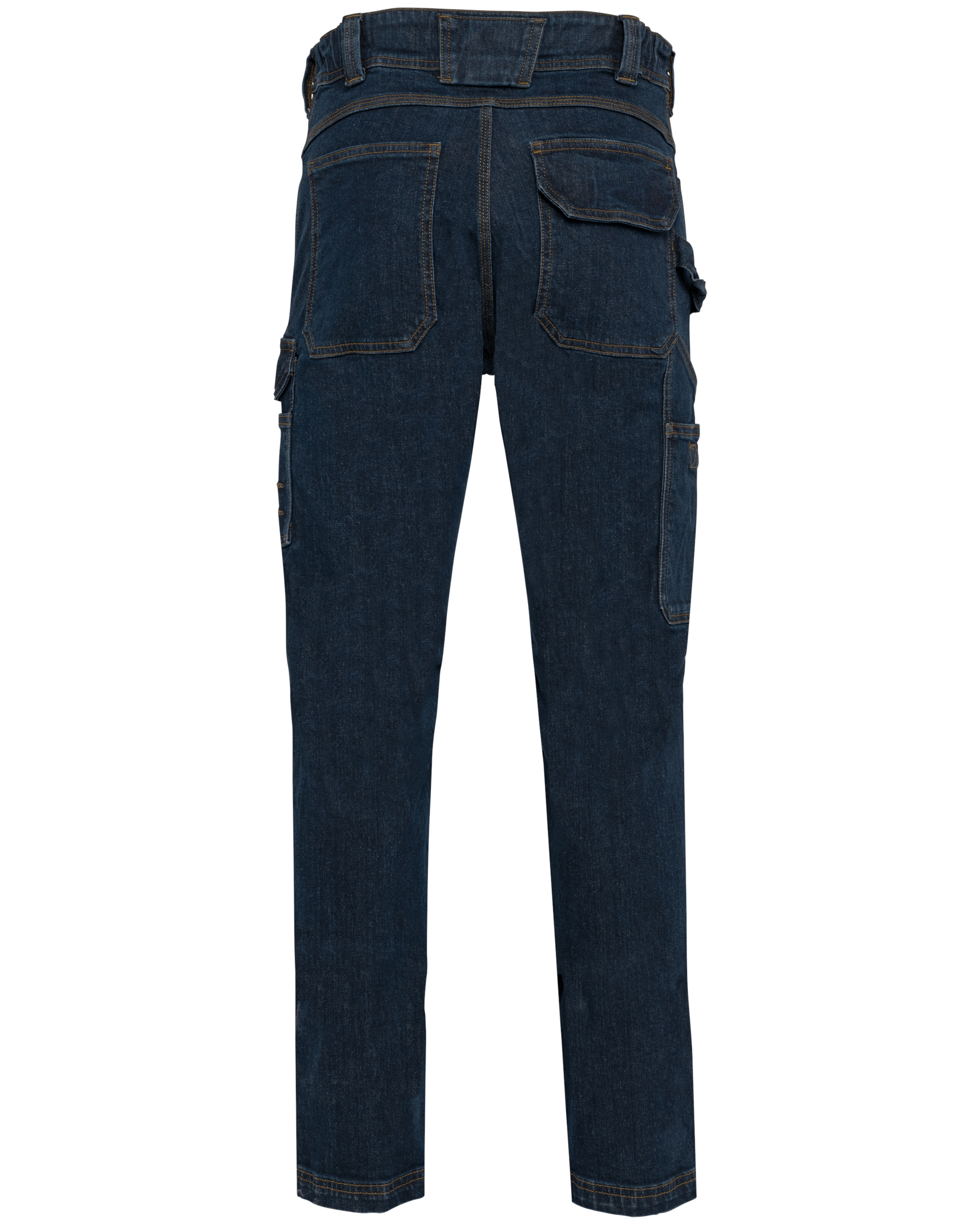 99% katoen / 1% elasthan. Denim. Wasbaar op 60 °C. Fitted pasvorm. Knoopsluiting met knoopklep en metalen rits. Aan de voorkant: 2 zakken met schuine opening. Linkerkant: zak met verstevigende naad en klep met klittenbandsluiting + overzak met 3 vakjes, waarvan 1 met pennenlus. Rechterkant: hamerlus, meterzak + overzak met klittenbandsluiting. Achterkant: 2 opgezette zakken met verstevigende naden, waarvan één met een klep met klittenbandsluiting. Afgeronde tailleband aan de achterkant met brede, elastische en antislip-binnenband voor optimale ondersteuning. Oranje gesp aan de binnenkant in het midden op de rug. Lussen met verstevigende naden, waaronder een grote midden op de rug en 1 plastic ring aan de voorkant. Ruimteplooien aan de knieën, voor meer comfort. Verstevigde kruisplooi voor extra stevigheid en bewegingsvrijheid. Driedubbele stiksels aan zijkanten, binnenkant been en kruis achteraan. Afwerking met dubbel stiksel onderaan de broekspijp. Tear-away merklabel.