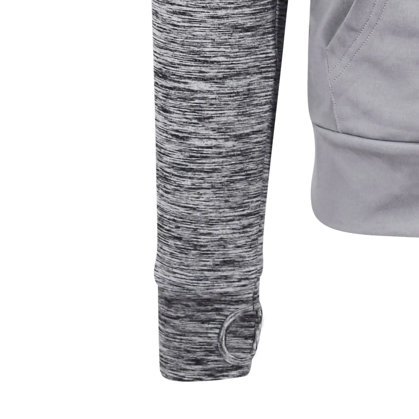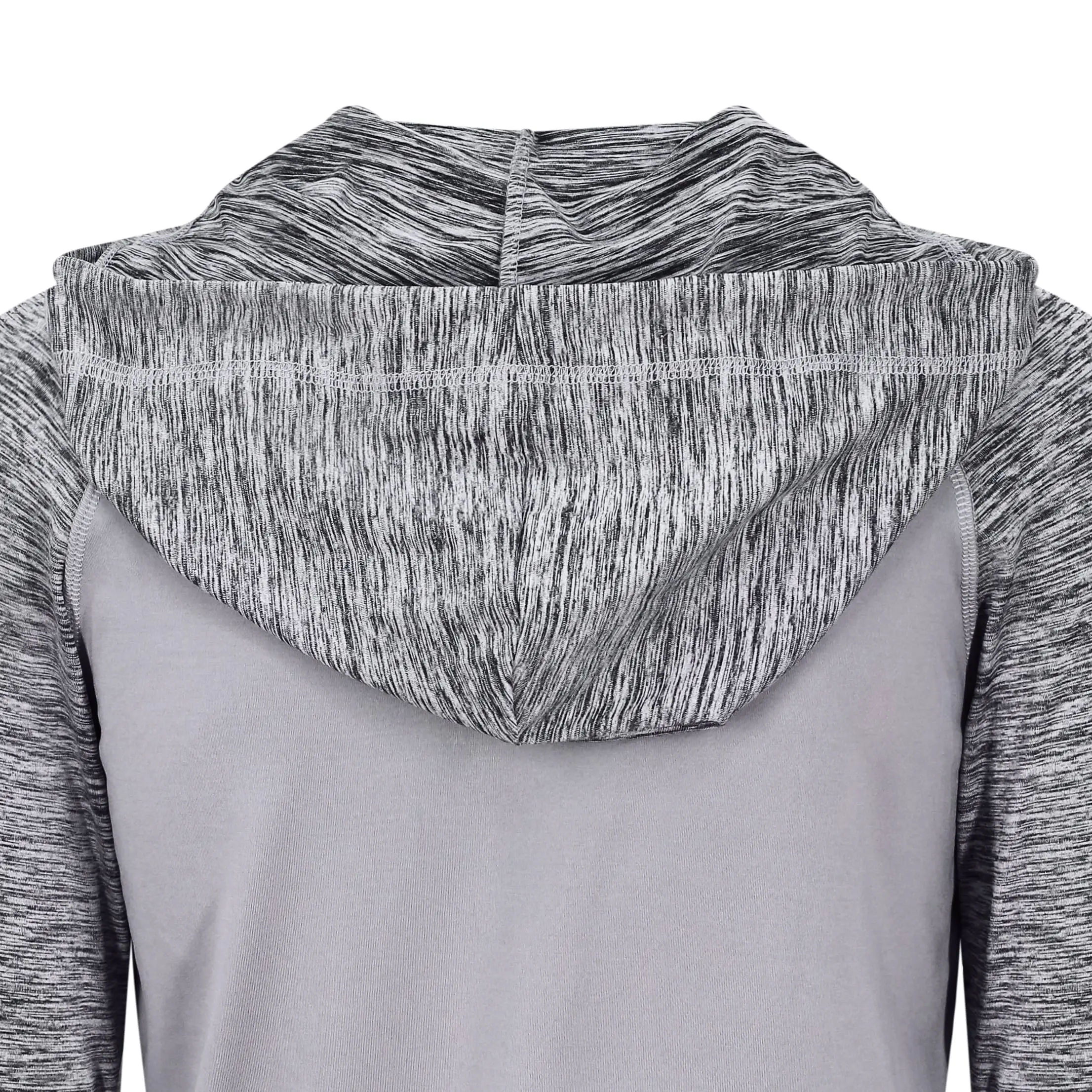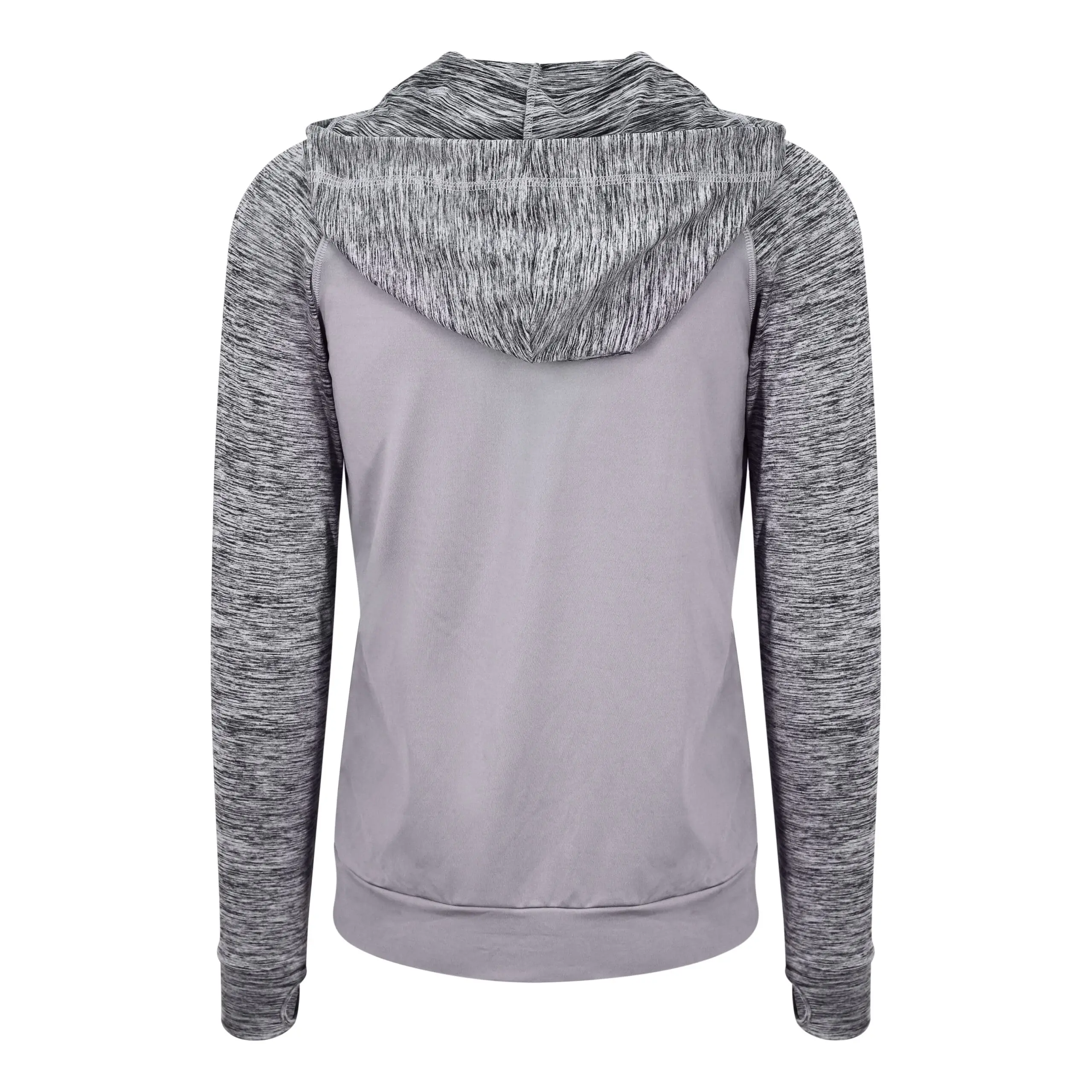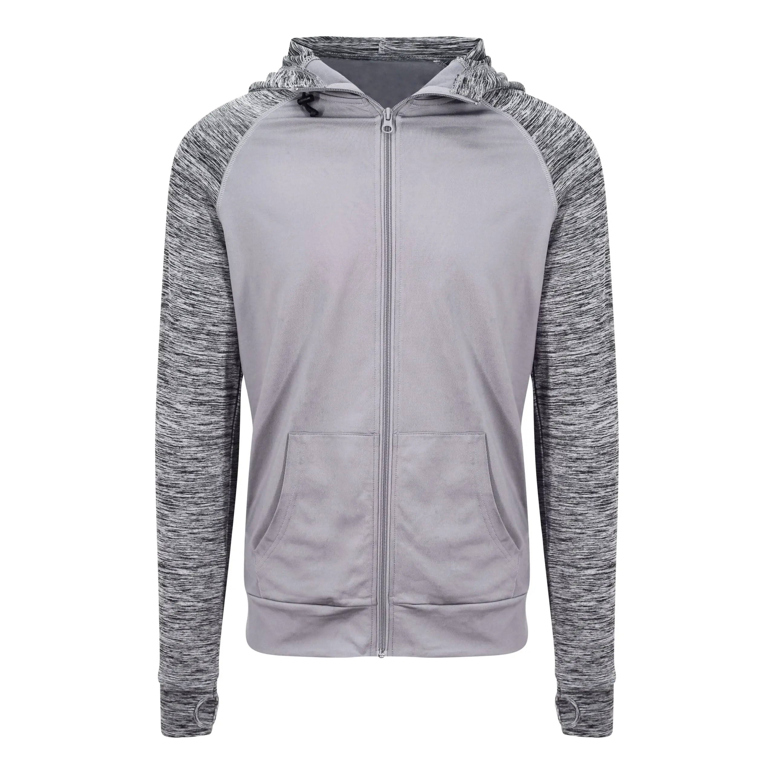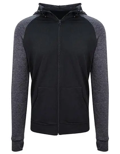 – Dubbelgewichts gemengd polyesterweefsel– Raglanmouwen– Contrasterende gemêleerde mouwen– Active fit– Geschepte zoom aan de achterkant– Vochtafvoerende en sneldrogende stof– Bijgevoegde verstelbare capuchon– Kangoeroezakje– Volledige rits aan de voorkant– Duimsgaten– 30°C wasbaar