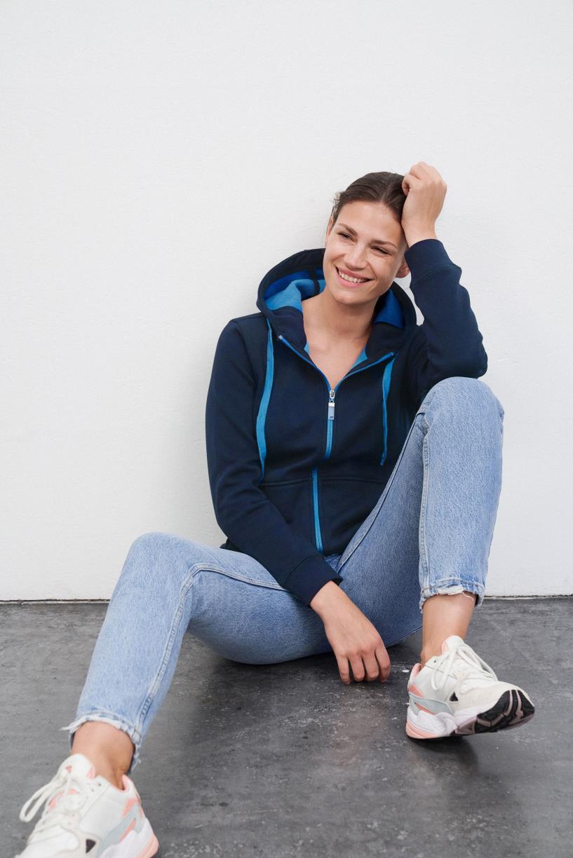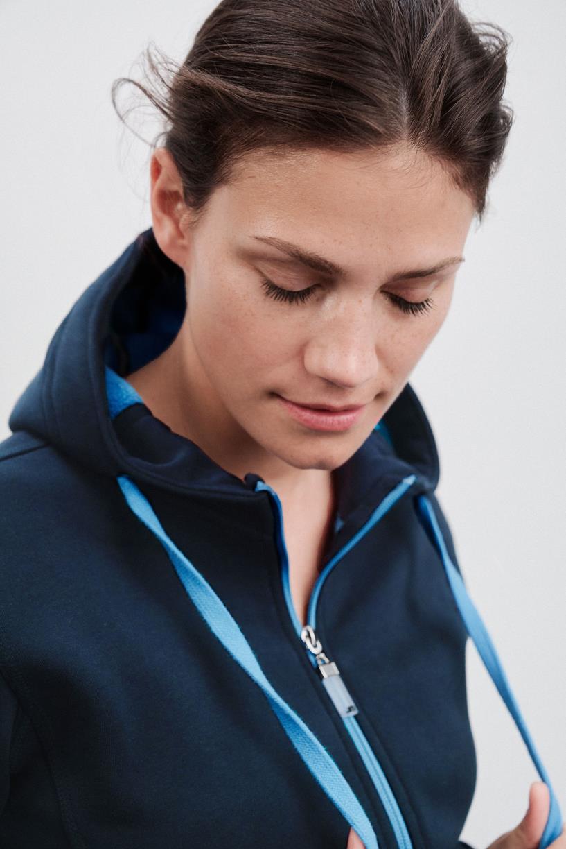 – Volledige rits, koord en binnenzijde in contrasterende kleur