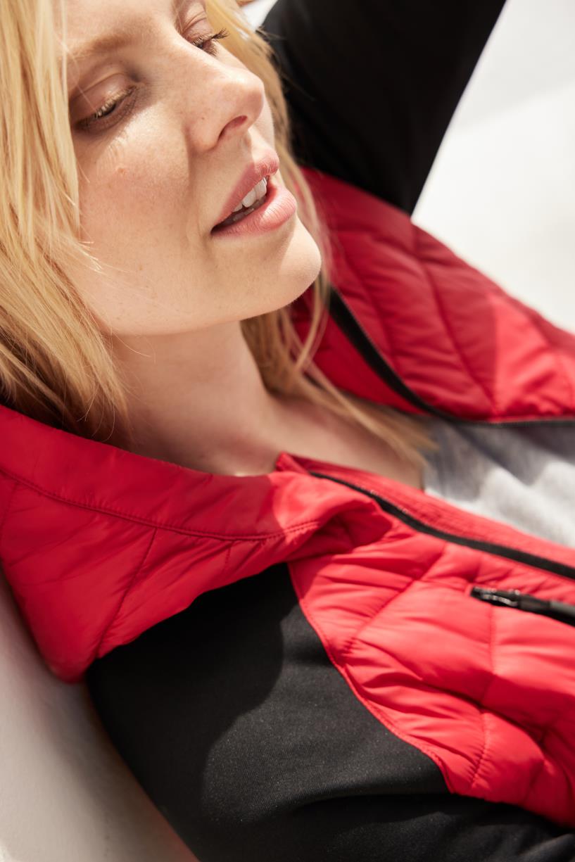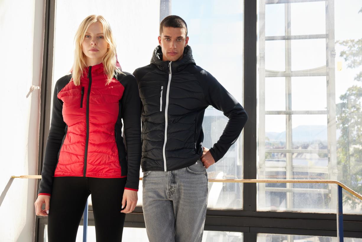 – Onderhoudsvriendelijke stretchfleece gecombineerd met gewatteerde inzetstukken aan de voorkant, achterkant en capuchon