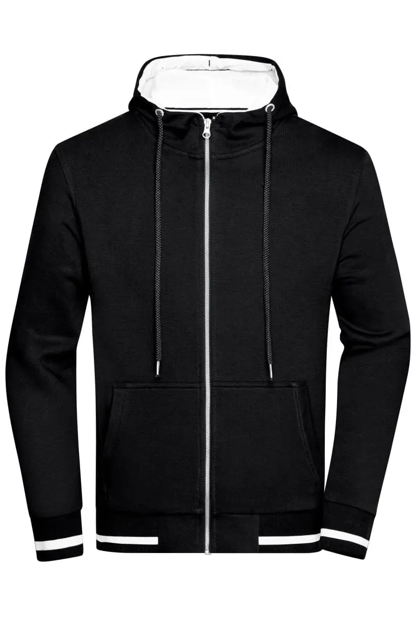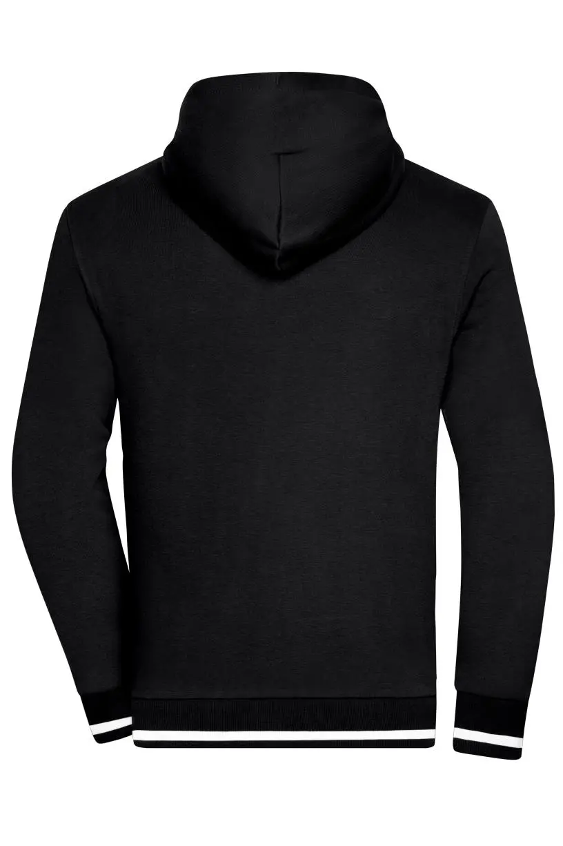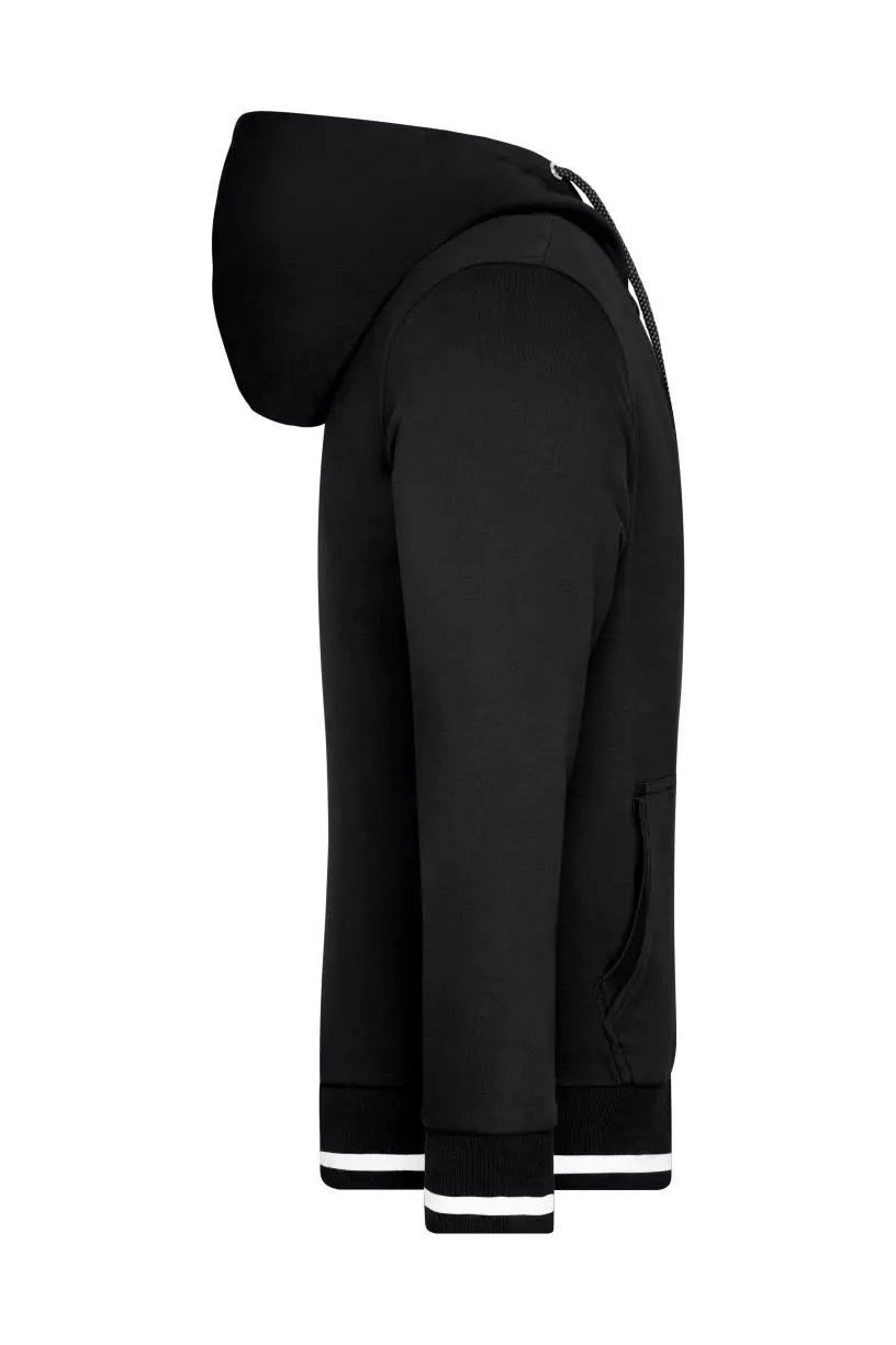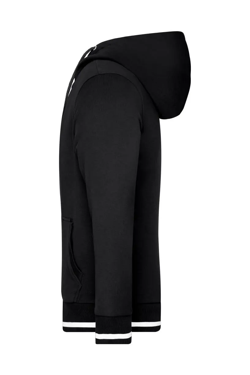 Sweat jacket met capuchon en rits– Hoogwaardig zachte sweat stof, binnenin geruwd– Gekamd ringgesponnen katoen– Gebreide manchetten met elasthaan– Contrasterende strepen op de tailleband en de mouwen– 2-laagse stof in contrasterende kleur– Metalen rits YKK– Kangoeroezak– JN775: lichtgeweven, casual snit