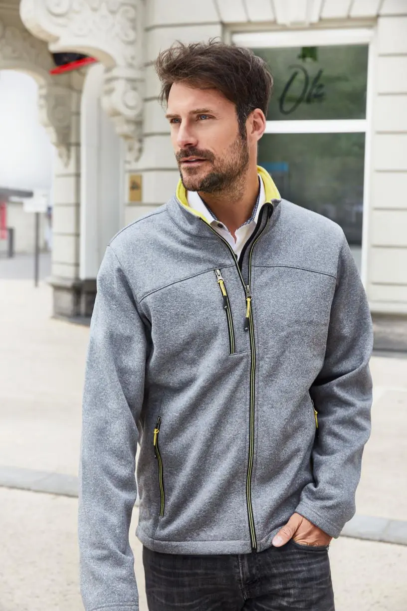 Softshell-jack in melange look– Aangename, zachte softshell met twee lagen– Contrasterende binnenkant van fleece– Doorlopende verdekte ritssluiting vooraan met kinbescherming– Opstaande kraag– 2 zijzakken en 1 borstzak met ritssluiting– JN1147: licht getailleerd