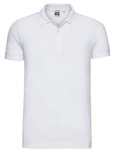 Heren stretch polo. 95% katoen-5% lycra, piqué. Wit 205 g/m², kleur 210 g/m². Eigentijdse pasvorm, kleinere kraag, softtouch, 3-knoopssluiting met contrast gekleurde knopen, korte zijsplitjes.