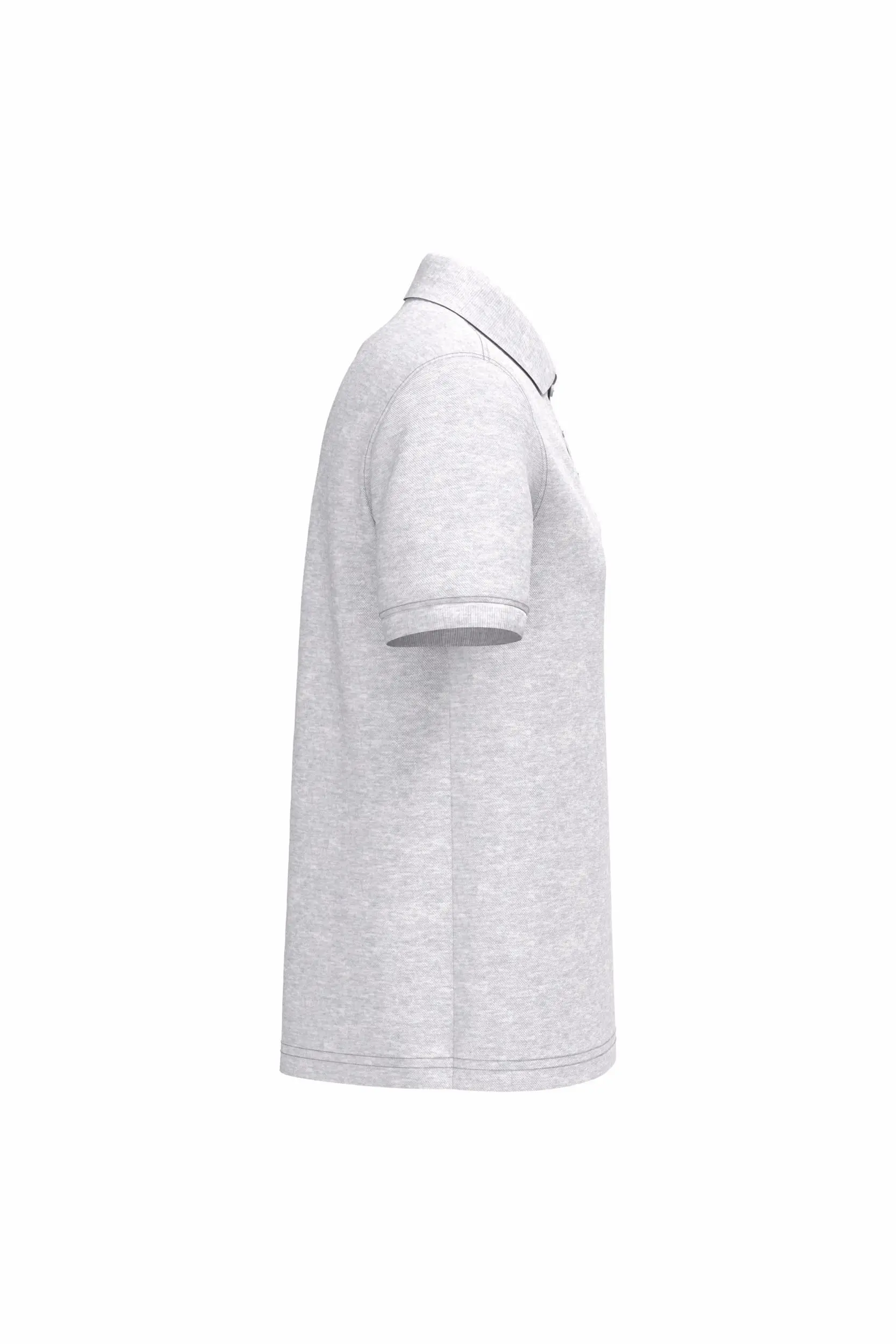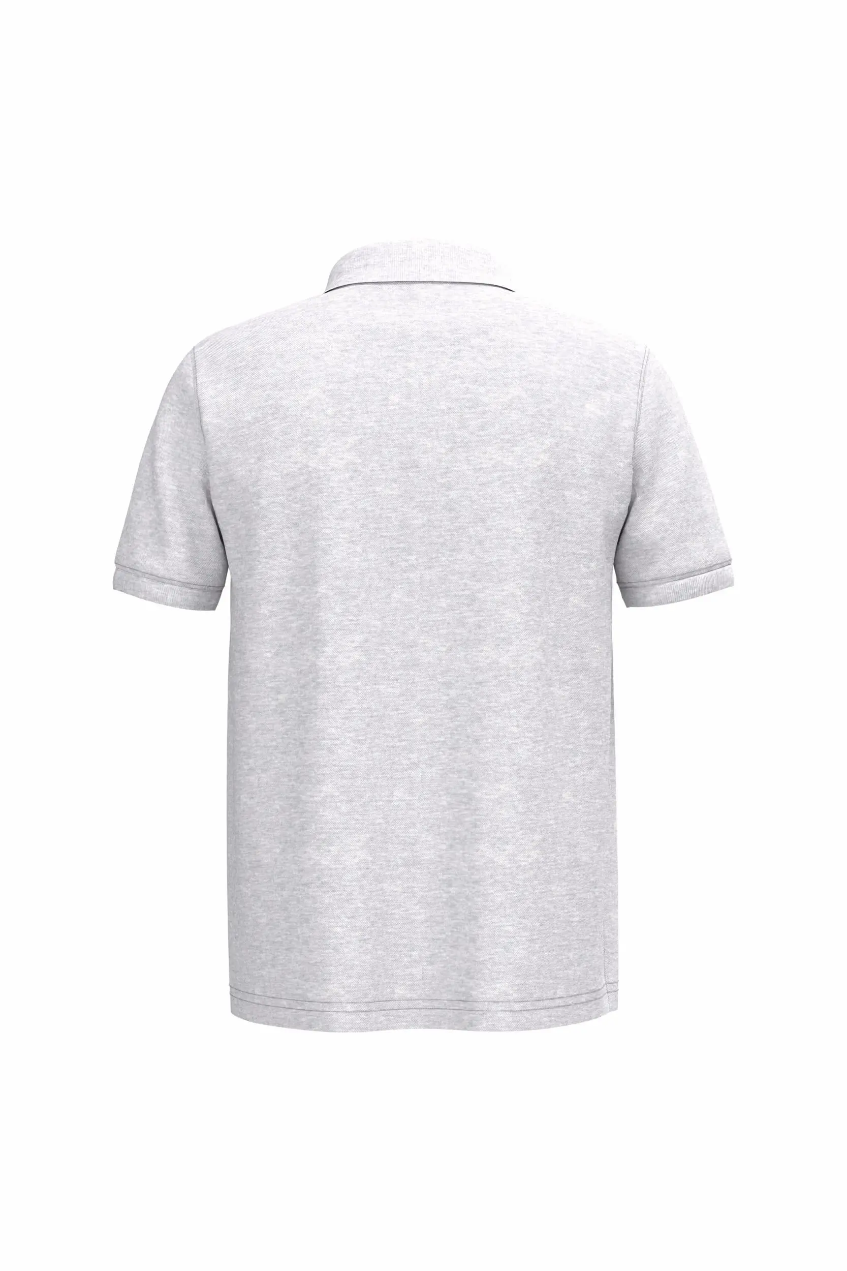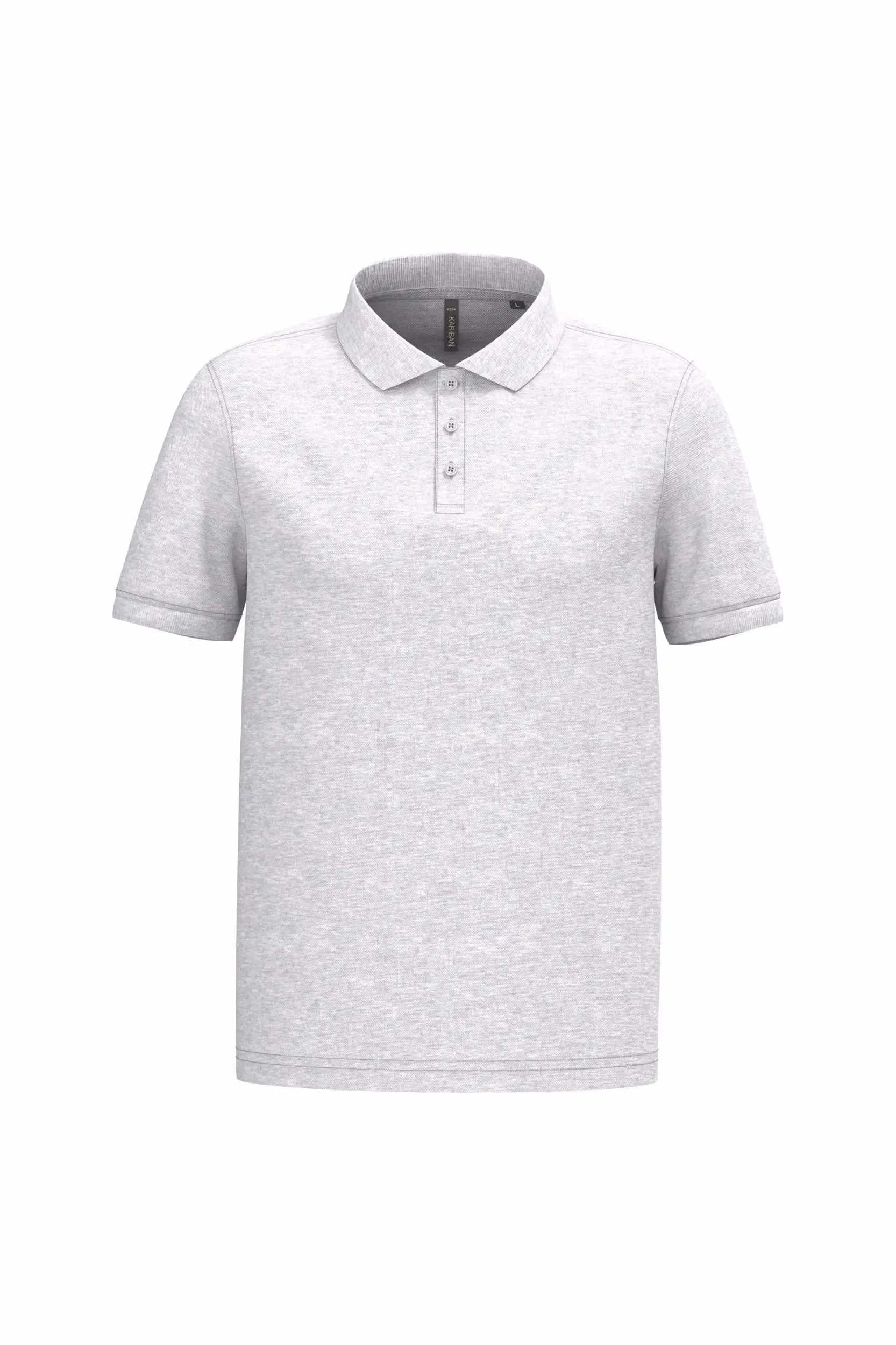 100% voorgekrompen (Oxford grey : 90% katoen / 10% viscose. Ash Heather : 98% katoen / 2% viscose). Ringgesponnen voorgekrompen gekamd katoen. Piqué steek. Rechte snit. Kraag en mouwuiteinden in 1×1 ribboord. Knooplijst met 3 toon-op-toon knopen. Toon op toon nektape. Gecertificeerd STANDARD 100 by OEKO-TEX®N° CQ1007/7, IFTH.