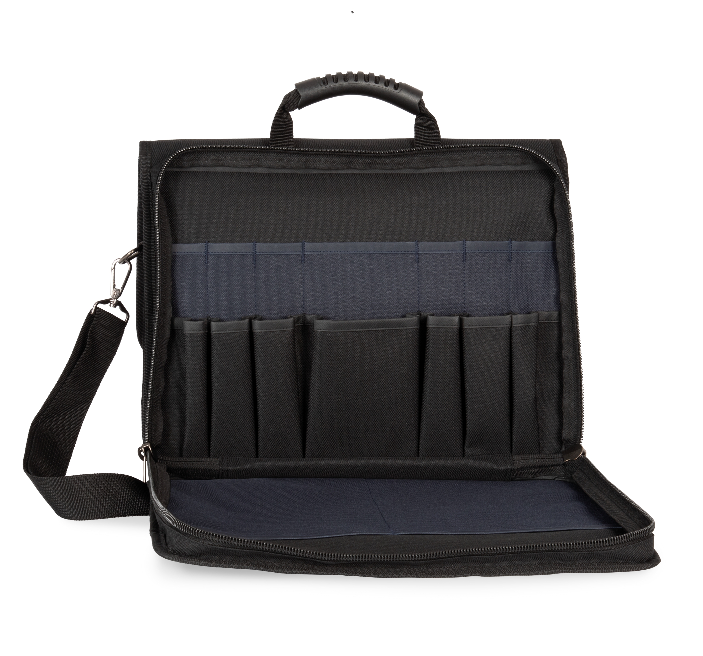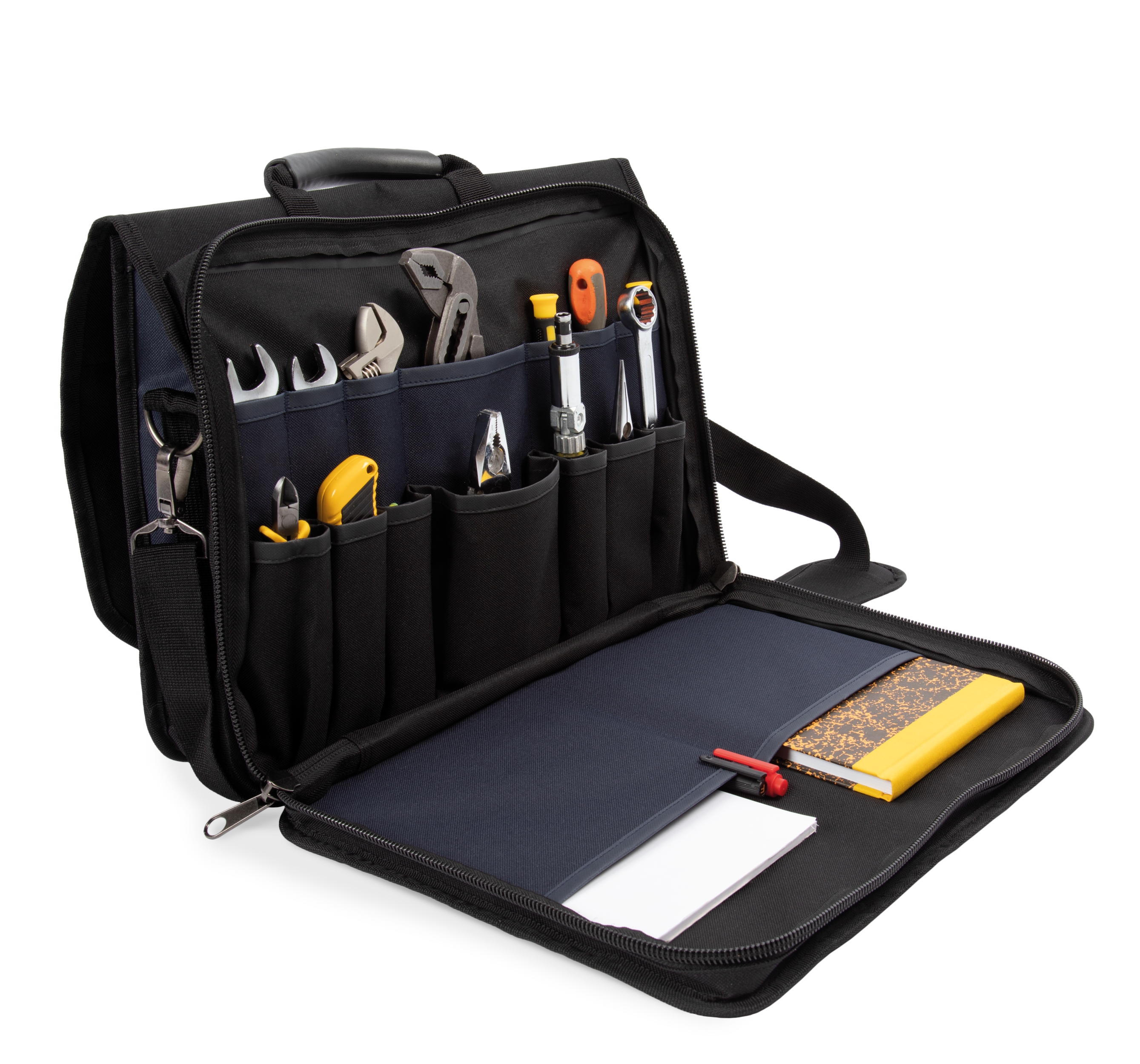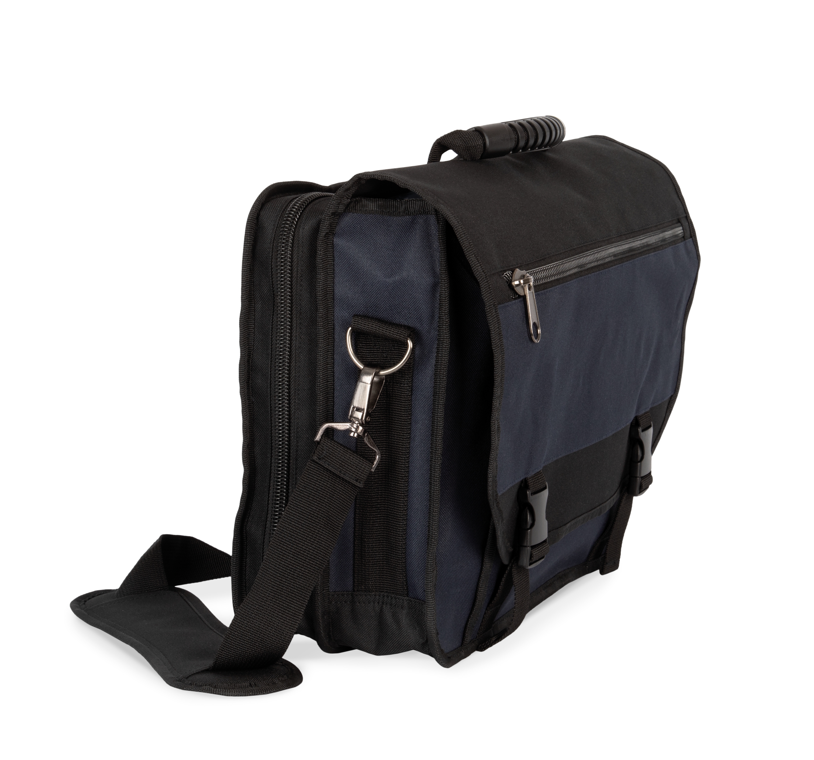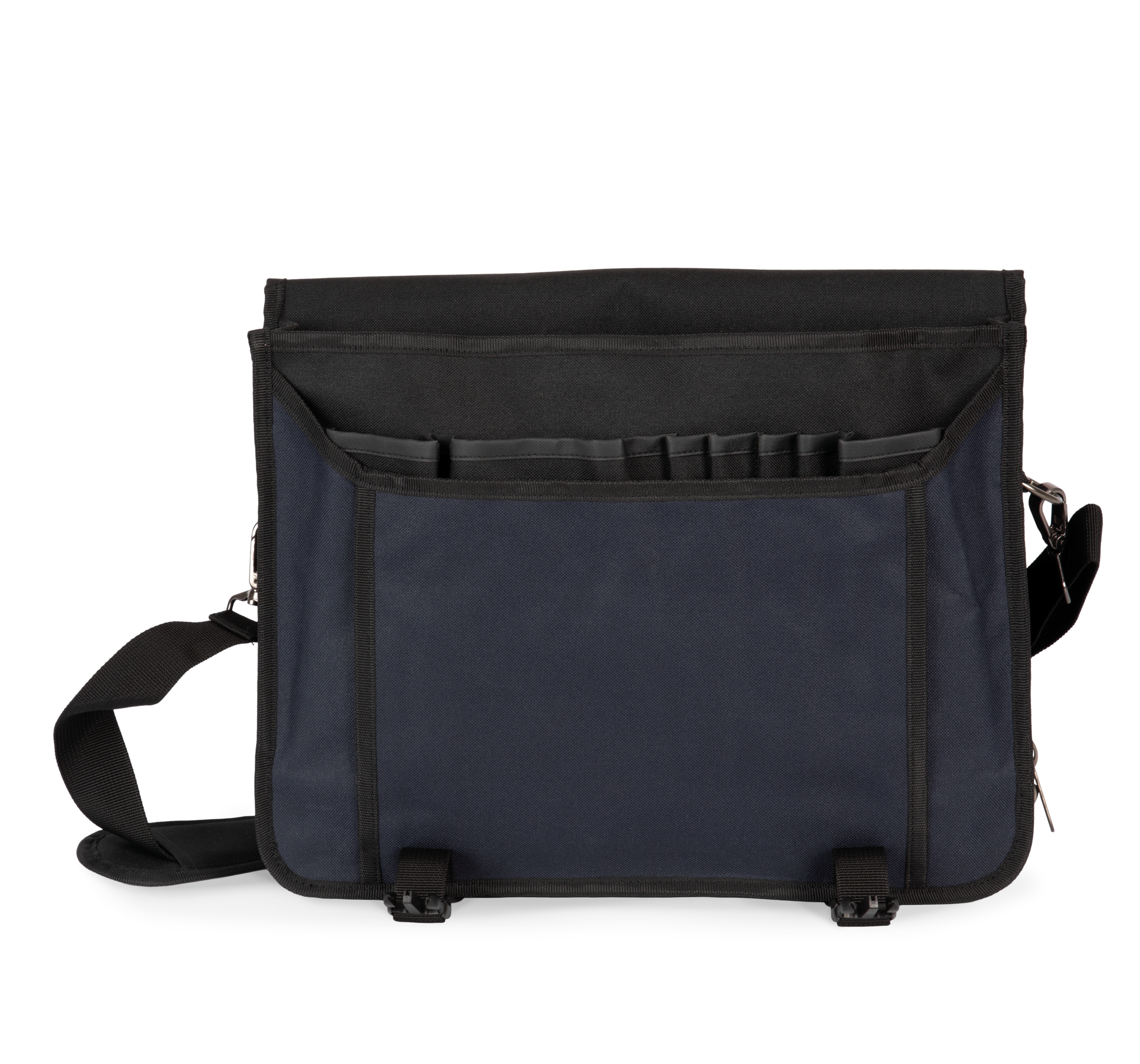 100% polyester. Tas met verstelbare schouderriem. Georganiseerd vak met ruimte voor divers gereedschap. Klep met zak aan de voorkant, voor eenvoudige personalisatie. Groot hoofdvak voor documenten en een laptop tot 15 inch. De tas is verstevigd om het gewicht van een aangepaste inhoud te kunnen dragen.