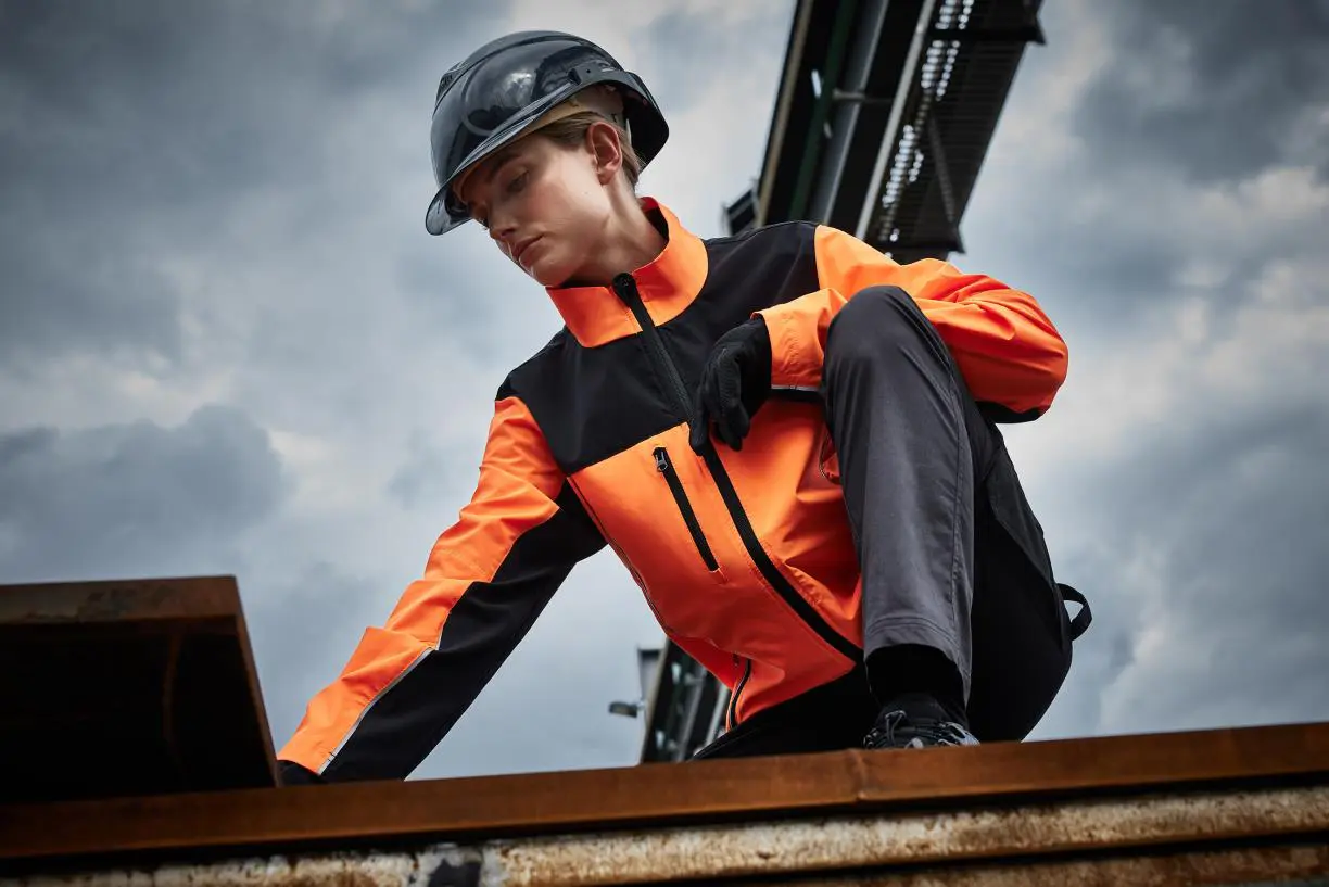 – Opstaande kraag, doorlopend gevoerde ritssluiting met stormflap en kinbescherming