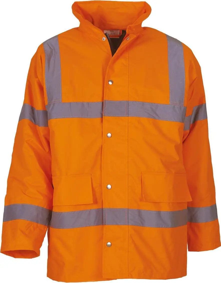 100% polyester. 300D waterdichte PU coating. Gewatteerde nylonvoering gevuld met 190g polyesterwatten. Sterke rits met stormoverslag en drukknopen. 2 buitenzakken met stormoverslag. Gebreide stormmanchetten in de mouwuiteinden. Zak aan de binnenkant. Verborgen capuchon in de kraag met aanrijgkoord. Volledig doorstikte en gesealde zomen voor een perfecte waterdichtheid.Conform aan EN ISO20471:2013 Klasse 3 & EN343 tegen barre weersomstandigheden. Hi-Vis Orange ook conform aan GO/RT 3279.