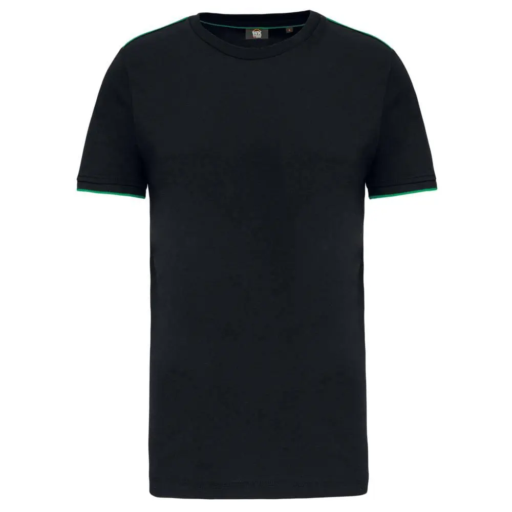 65% polyester / 35% katoen. Gekamd katoen jerseystof. Wasbaar op 60 °C. Anti-pluisbehandeling. Ronde hals met elasthan. Contrasterende bies aan binnenkant kraag en schouders. Mouwuiteinden in ribboord met contrasterend biesje. Afwerking met dubbel stiksel onderaan. Ideaal voor dagelijks gebruik. Gecertificeerd STANDARD 100 by OEKO-TEX®N° CQ1007/7, IFTH.